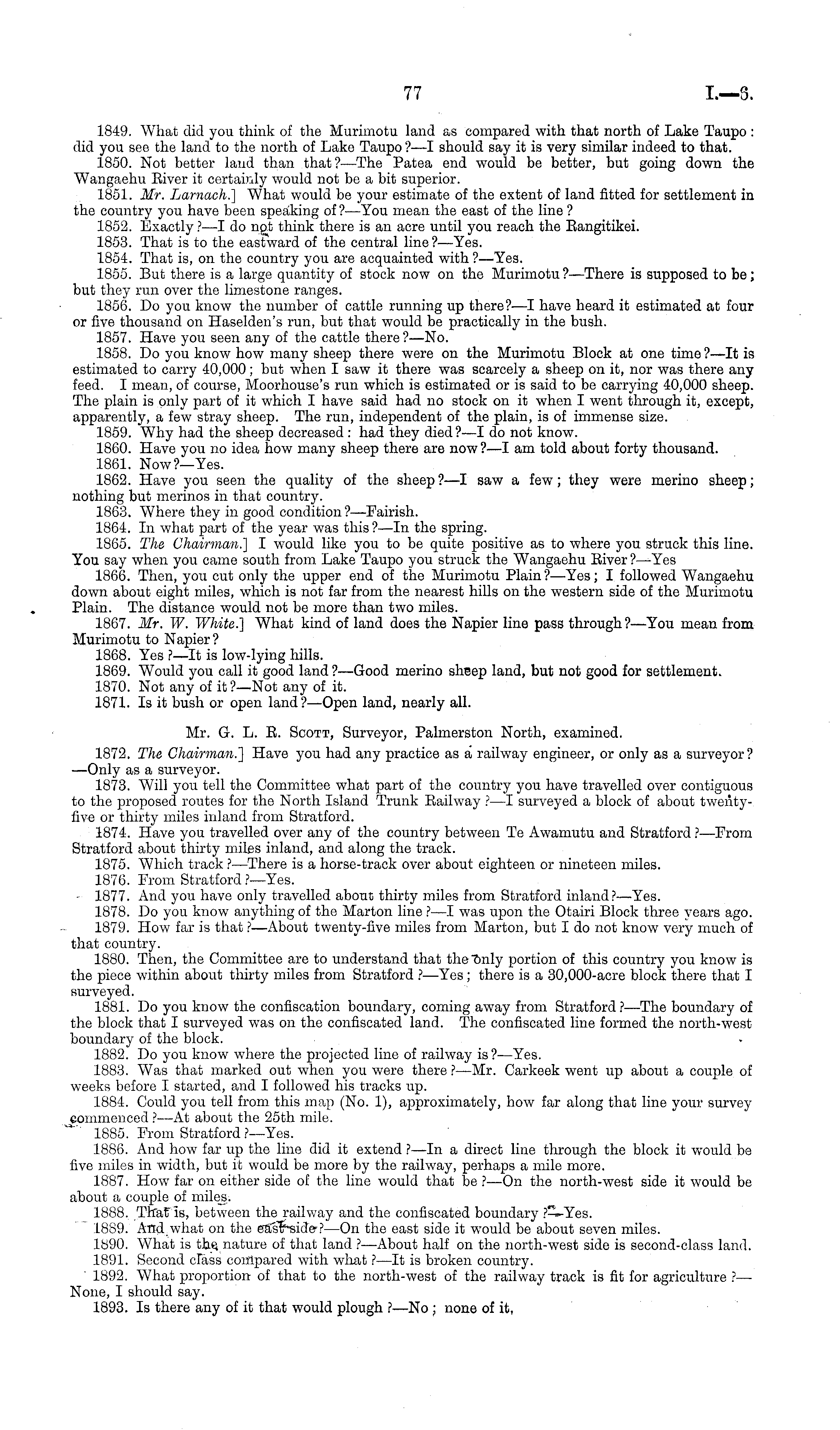 1849. What did you think of the Murimotu land as compared with that north of Lake Taupo : did you see the land to the north of Lake Taupo ?—I should say it is very similar indeed to that. 1850. Not better laud than that?— The Patea end would be better, but going down the Wangaehu Eiver it certainly would not be a bit superior. 1851. Mr. Larnach.] What would be your estimate of the extent of land fitted for settlement in the country you have been speaking of ?—You mean the east of the line ? 1852. Exactly ?—I do not think there is an acre until you reach the Bangitikei. 1853. That is to the eastward of the central line ?—Yes. 1854. That is, on the country you are acquainted with ?—Yes. 1855. But there is a large quantity of stock now on the Murimotu ?—There is supposed to be; but they run over the limestone ranges. 1856. Do you know the number of cattle running up there?—l have heard it estimated at four or five thousand on Haselden's run, but that would be practically in the bush. 1857. Have you seen any of the cattle there?— No. 1858. Do you know how many sheep there were on the Murimotu Block at one time ?—lt is estimated to carry 40,000; but when I saw it there was scarcely a sheep on it, nor was there any feed. I mean, of course, Moorhouse's run which is estimated or is said to be carrying 40,000 sheep. The plain is only part of it which I have said had no stock on it when I went through it, except, apparently, a few stray sheep. The run, independent of the plain, is of immense size. 1859. Why had the sheep decreased : had they died?—l do not know. 1860. Have you no idea how many sheep there are now?—l am told about forty thousand. 1861. Now?— Yes. 1862. Have you seen the quality of the sheep?—l saw a few; they were merino sheep; nothing but merinos in that country. 1863. Where they in good condition?— Fairish. 1864. In what part of the year was this?—ln the spring. 1865. The Chairman.] I would like you to be quite positive as to where you struck this line. You say when you came south from Lake Taupo you struck the Wangaehu Eiver ? —Yes 1866. Then, you cut only the upper end of the Murimotu Plain?— Yes; I followed Wangaehu down about eight miles, which is not far from the nearest hills on the western side of the Murimotu Plain. The distance would not be more than two miles. 1867. Mr. W. White.] What kind of land does the Napier line pass through?— You mean from Murimotu to Napier? 1868. Yes ?—lt is low-lying hills. 1869. Would you call it good land ?—Good merino sheep land, but not good for settlement. 1870. Not any of it ?—Not any of it. 1871. Is it bush or open land?— Open land, nearly all. Mr. G. L. E. Scott, Surveyor, Palmerston North, examined. 1872. The Chairman.'] Have you had any practice as a railway engineer, or only as a surveyor? —Only as a surveyor. 1873. Will you tell the Committee what part of the country you have travelled over contiguous to the proposed routes for the North Island Trunk Eailway ?—I surveyed a block of about twentyfive or thirty miles inland from Stratford. 1874. Have you travelled over any of the country between Te Awamutu and Stratford ?—From Stratford about thirty miles inland, and along the track. 1875. Which track ?—There is a horse-track over about eighteen or nineteen miles. 1876. From Stratford ?—Yes. 1877. And you have only travelled about thirty miles from Stratford inland?— Yes. 1878. Do you know anything of the Marton line ?—I was upon the Otairi Block three years ago. 1879. How far is that ?—About twenty-five miles from Marton, but I do not know very much of that country. 1880. Then, the Committee are to understand that the 'only portion of this country you know is the piece within about thirty miles from Stratford ?—Yes; there is a 30,000-acre block there that I surveyed. 1881. Do you know the confiscation boundary, coming away from Stratford ?—The boundary of the block that I surveyed was on the confiscated land. The confiscated line formed the north-west boundary of the block. 1882. Do you know where the projected line of railway is? —Yes. 1883. Was that marked out when you were there ? —Mr. Carkeek went up about a couple of weeks before I started, and I followed his tracks up. 1884. Could you tell from, this map (No. 1), approximately, how far along that line your survey commenced ?—At about the 25th mile. 1885. From Stratford ?—Yes. 1886. And how far up the line did it extend ?—ln a direct line through the block it would be five miles in width, but it would be more by the railway, perhaps a mile more. 1887. How far on either side of the line would that be ?—On the north-west side it would be about a couple of miles. 1888. That is, between the railway and the confiscated boundary P^-Yes. 1889. And what on the east side ?—On the east side it would be about seven miles. 1890. What is ths nature of that land ?—About half on the north-west side is second-class land. 1891. Second class compared with what ?—lt is broken country. 1892. What proportion of that to the north-west of the railway track is fit for agriculture ?— None, I should say. 1893. Is there any of it that would plough ?—No ; none of it,