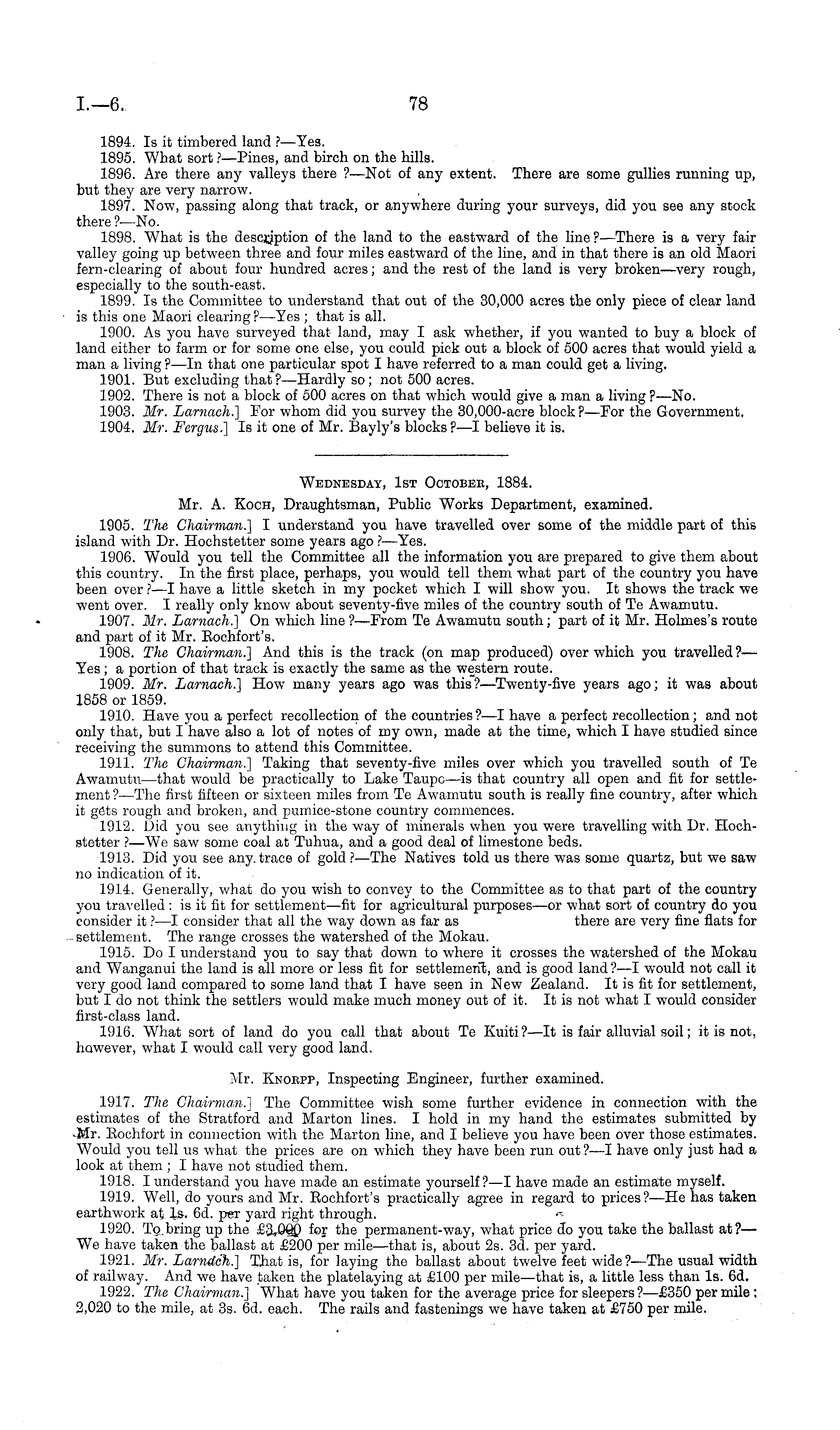 Wednesday, Ist October, 1884. Mr. A. Koch, Draughtsman, Public Works Department, examined. 1905. The Chairman] I understand you have travelled over some of the middle part of this island with Dr. Hochstetter some years ago ?—Yes. 1906. Would you tell the Committee all the information you are prepared to give them about this country. In the first place, perhaps, you would tell them what part of the country you have been over ?—I have a little sketch in my pocket which I will show you. It shows the track we went over. I really only know about seventy-five miles of the country south of Te Awamutu. 1907. Mr. Larnach.] On which line ?—From Te Awamutu south; part of it Mr. Holmes's route and part of it Mr. Eochfort's. 1908. The Chairman.'] And this is the track (on map produced) over which you travelled?— Yes; a portion of that track is exactly the same as the western route. 1909. Mr. Larnach.] How many years ago was this?— Twenty-five years ago; it was about 1858 or 1859. 1910. Have you a perfect recollection of the countries ?—I have a perfect recollection; and not only that, but I have also a lot of notes of my own, made at the time, which I have studied since receiving the summons to attend this Committee. 1911. The Chairman.] Taking that seventy-five miles over which you travelled south of Te Awamutu—that would be practically to Lake Taupe—is that country all open and fit for settlement ?—The first fifteen or sixteen miles from Te Awamutu south is really fine country, after which it g6ts rough and broken, and pumice-stone country commences. 1912. Did you see anything in the way of minerals when you were travelling with Dr. Hochstetter ?—We saw some coal at Tuhua, and a good deal of limestone beds. 1913. Did you see any. trace of gold ?—The Natives told us there was some quartz, but we saw no indication of it. 1914. Generally, what do you wish to convey to the Committee as to that part of the country you travelled : is it fit for settlement—fit for agricultural purposes—or what sort of country do you consider it ?—I consider that all the way down as far as there are very fine flats for settlement. The range crosses the watershed of the Mokau. 1915. Do I understand you to say that down to where it crosses the watershed of the Mokau and Wanganui the land is all more or less fit for settlement, and is good land ?—I would not call it very good land compared to some land that I have seen in New Zealand. It is fit for settlement, but Ido not think the settlers would make much money out of it. It is not what I would consider first-class land. 1916. What sort of land do you call that about Te Kuiti?—lt is fair alluvial soil; it is not, however, what I would call very good land. Mr. Knoepp, Inspecting Engineer, further examined. 1917. The Chairman.] The Committee wish some further evidence in connection with the estimates of the Stratford and Marton lines. I hold in my hand the estimates submitted by Mr. Eochfort in connection with the Marton line, and I believe you have been over those estimates. Would you tell us what the prices are on which they have been run out ?—I have only just had a look at them ; I have not studied them. 1918. I understand you have made an estimate yourself?—l have made an estimate myself. 1919. Well, do yours and Mr. Eochfort's practically agree in regard to prices?—He has taken earthwork at Is. 6d. per yard right through. 1920. To bring up the £3,000 for the permanent-way, what price do you take the ballast at? — We have taken the ballast at £200 per mile—that is, about 2s. 3d. per yard. 1921. Mr. Larndch.] That is, for laying the ballast about twelve feet wide?— The usual width of railway. And we have taken the platelaying at £100 per mile—that is, a little less than Is. 6d. 1922. The Chairman.] What have you taken for the average price for sleepers?—£3so per mile : 2,020 to the mile, at 3s. 6d. each. The rails and fastenings we have taken at £750 per mile.