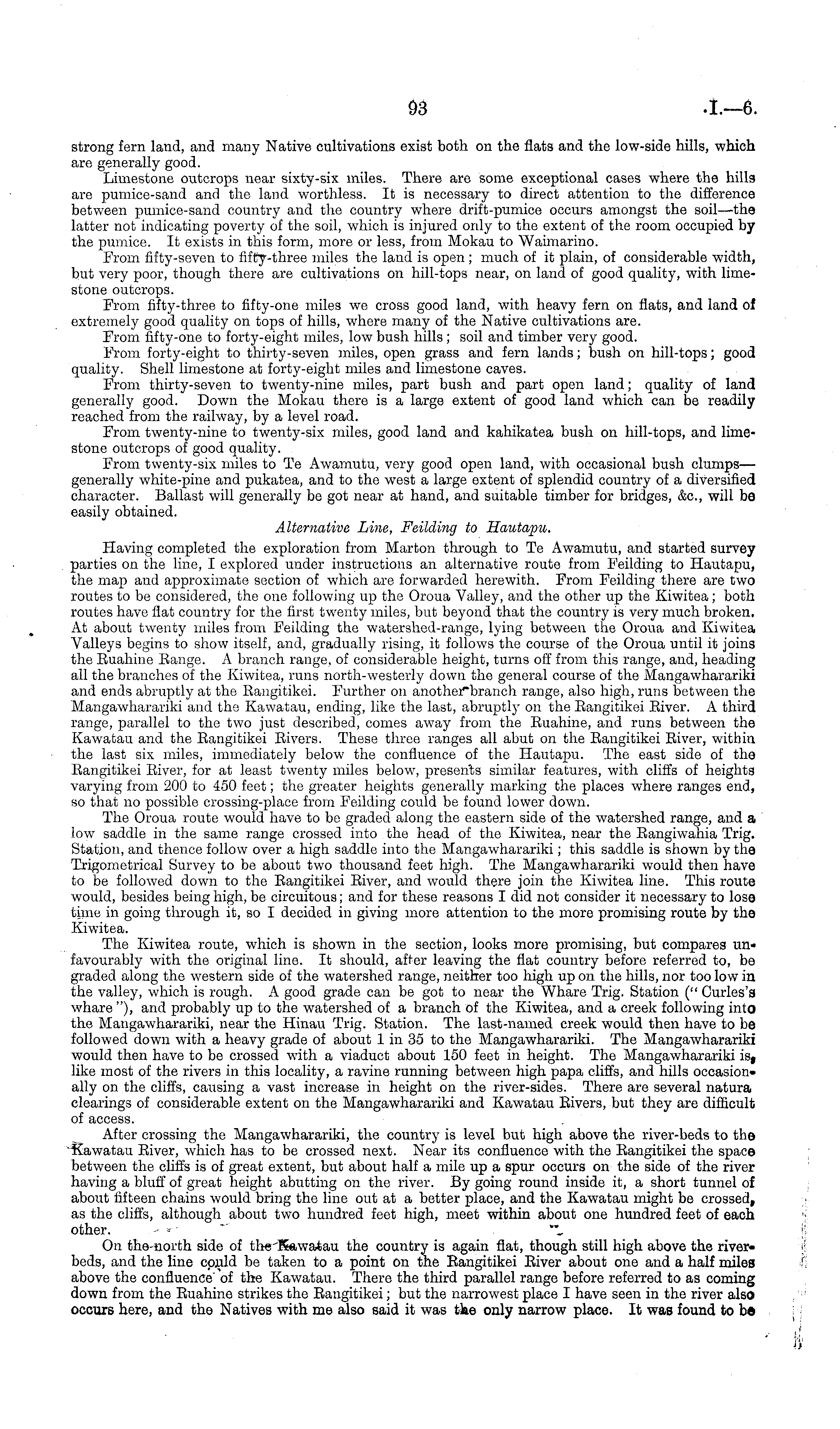 strong fern land, and many Native cultivations exist both on the flats and the low-side hills, which are generally good. Limestone outcrops near sixty-six miles. There are some exceptional cases where the hills are pumice-sand and the land worthless. It is necessary to direct attention to the difference between pumice-sand country and the country where drift-pumice occurs amongst the soil—the latter not indicating poverty of the soil, which is injured only to the extent of the room occupied by the pumice. It exists in this form, more or less, from Mokau to Waimarino. From fifty-seven to fifty-three miles the land is open ; much of it plain, of considerable width, but very poor, though there are cultivations on hill-tops near, on land of good quality, with limestone outcrops. From fifty-three to fifty-one miles we cross good land, with heavy fern on flats, and land of extremely good quality on tops of hills, where many of the Native cultivations are. From fifty-one to forty-eight miles, low bush hills ; soil and timber very good. From forty-eight to thirty-seven miles, open grass and fern lands; bush on hill-tops; good quality. Shell limestone at forty-eight miles and limestone caves. From thirty-seven to twenty-nine miles, part bush and part open land; quality of land generally good. Down the Mokau there is a large extent of good land which can be readily reached from the railway, by a level road. From twenty-nine to twenty-six miles, good land and kahikatea bush on hill-tops, and limestone outcrops of good quality. From twenty-six miles to Te Awamutu, very good open land, with occasional bush clumps— generally white-pine and pukatea, and to the west a large extent of splendid country of a diversified character. Ballast will generally be got near at hand, and suitable timber for bridges, &c, will be easily obtained. Alternative Line, Feilding to Hautapu. Having completed the exploration from Marton through to Te Awamutu, and started survey parties on the line, I explored under instructions an alternative route from Feilding to Hautapu, the map and approximate section of which are forwarded herewith. From Feilding there are two routes to be considered, the one following up the Oroua Valley, and the other up the Kiwitea; both routes have flat country for the first twenty miles, but beyond that the country is very much broken. At about twenty miles from Feilding the watershed-range, lying between the Oroua and Kiwitea Valleys begins to show itself, and, gradually rising, it follows the course of the Oroua until it joins the Buahine Eange. A branch range, of considerable height, turns off from this range, and, heading all the branches of the Kiwitea, runs north-westerly down the general course of the Mangawharariki and ends abruptly at the Eangitikei. Further on another"branch range, also high, runs between the Mangawharariki and the Kawatau, ending, like the last, abruptly on the Eangitikoi Eiver. A third range, parallel to the two just described, comes away from the Euahine, and runs between the Kawatau and the Eangitikei Rivers. These three ranges all abut on the Eangitikei Eiver, within the last six miles, immediately below the confluence of the Hautapu. The east side of the Eangitikei Eiver, for at least twenty miles below, presents similar features, with cliffs of heights varying from 200 to 450 feet; the greater heights generally marking the places where ranges end, so that no possible crossing-place from Feilding could be found lower down. The Oroua route would have to be graded along the eastern side of the watershed range, and a low saddle in the same range crossed into the head of the Kiwitea, near the Bangiwahia Trig. Station, and thence follow over a high saddle into the Mangawharariki; this saddle is shown by the Trigoinetrical Survey to be about two thousand feet high. The Mangawharariki would then have to be followed down to the Eangitikei Eiver, and would there join the Kiwitea line. This route would, besides being high, be circuitous; and for these reasons I did not consider it necessary to lose time in going through it, so I decided in giving more attention to the more promising route by the Kiwitea. The Kiwitea route, which is shown in the section, looks more promising, but compares unfavourably with the original line. It should, after leaving the flat country before referred to, be graded along the western side of the watershed range, neither too high up on the hills, nor too low in the valley, which is rough. A good grade can be got to near the Whare Trig. Station (" Gurles'a whare "), and probably up to the watershed of a branch of the Kiwitea, and a creek following into the Mangawharariki, near the Hinau Trig. Station. The last-named creek would then have to be followed down with a heavy grade of about lin3s to the Mangawharariki. The Mangawharariki would then have to be crossed with a viaduct about 150 feet in height. The Mangawharariki is, like most of the rivers in this locality, a ravine running between high papa cliffs, and hills occasionally on the cliffs, causing a vast increase in height on the river-sides. There are several natura clearings of considerable extent on the Mangawharariki and Kawatau Eivers, but they are difficult of access. After crossing the Mangawharariki, the country is level but high above the river-beds to the Kawatau Eiver, which has to be crossed next. Near its confluence with the Eangitikei the space between the cliffs is of great extent, but about half a mile up a spur occurs on the side of the river having a bluff of great height abutting on the river. By going round inside it, a short tunnel of about fifteen chains would bring the line out at a better place, and the Kawatau might be crossed, as the cliffs, although about two hundred feet high, meet within about one hundred feet of each other. On the north side of the Kawatau the country is again flat, though still high above the riverbeds, and the line could be taken to a point on