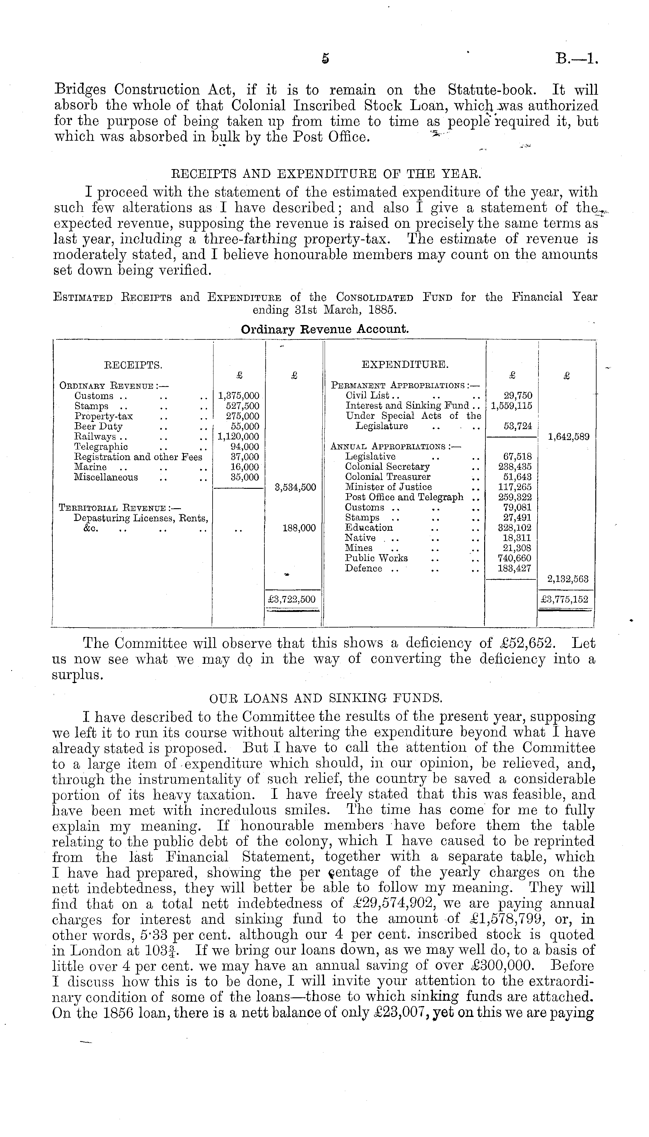 Bridges Construction Act, if it is to remain on the Statute-book. It will absorb the whole of that Colonial Inscribed Stock Loan, which -was authorized for the purpose of being taken up from time to time as people required it, but which was absorbed in bulk by the Post Office. RECEIPTS AND EXPENDITDRE OF THE YEAR. I proceed with the statement of the estimated expenditure of the year, with such, few alterations as I have described; and also I give a statement of the. expected revenue, supposing the revenue is raised on precisely the same terms as last year, including a three-farthing property-tax. The estimate of revenue is moderately stated, and I believe honourable members may count on the amounts set down being verified.