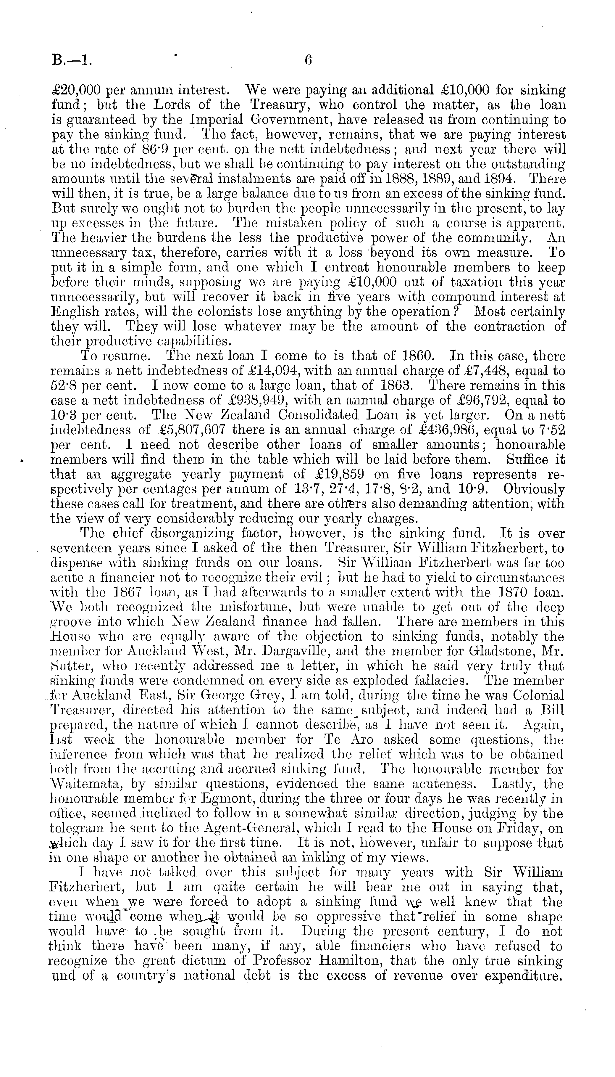 ,£20,000 per annum interest. We were paying an additional £10,000 for sinking fund; but the Lords of the Treasury, who control the matter, as the loan is guaranteed by the Imperial Government, have released us from continuing to pay the sinking fund. The fact, however, remains, that we are paying interest at the rate of 86-9 per cent, on the nett indebtedness; and next year there will be no indebtedness, but we shall be continuing to pay interest on the outstanding amounts until the sevSral instalments are paid off in 1888,1889, and 1894. There will then, it is true, be a large balance due to us from an excess of the sinking fund. But surely we ought not to burden the people unnecessarily in the present, to lay up excesses in the future. The mistaken policy of such a course is apparent. The heavier the burdens the less the productive power of the community. An unnecessary tax, therefore, carries with it a loss beyond its own measure. To put it in a simple form, and one which I entreat honourable members to keep before their minds, supposing we are paying £10,000 out of taxation this year unnecessarily, but will recover it back in five years with compound interest at English rates, will the colonists lose anything by the operation ? Most certainly they will. They will lose whatever may be the amount of the contraction of their productive capabilities. To resume. The next loan I come to is that of 18G0. In this case, there remains a nett indebtedness of £14,094, with an annual charge of £7,448, equal to 52'8 per cent. I now come to a large loan, that of 1863. There remains in this case a nett indebtedness of £938,949, with an annual charge of £96,792, equal to 10'3 per cent. The New Zealand Consolidated Loan is yet larger. On a nett indebtedness of £5,807,607 there is an annual charge of £436,986, equal to 7-52 per cent. I need not describe other loans of smaller amounts; honourable members will find them in the table which will be laid before them. Suffice it that an aggregate yearly payment of £19,859 on five loans represents respectively per centages per annum of 13-7, 27-4, 17-8, 8-2, and 10-9. Obviously these cases call for treatment, and there are others also demanding attention, with the view of very considerably reducing our yearly charges. The chief disorganizing factor, however, is the sinking fund. It is over seventeen years since I asked of the then Treasurer, Sir William Fitzherbert, to dispense with sinking funds on our loans. Sir William Fitzherbert was far too acute a financier not to recognize their evil ; but he had to yield to circumstances with the 1867 loan, as I had afterwards to a smaller extent with the 1870 loan. We both recognized the misfortune, but were unable to get out of the deep •■Toove into which New Zealand finance had fallen. There are members in this House who are equally aware of the objection to sinking funds, notably the member for Auckland West, Mr. Dargaville, and the member for Gladstone, Mr. Sutter, who recently addressed me a letter, in which he said very truly that sinking funds were condemned on every side as exploded fallacies. The member Jor Auckland East, Sir George Grey, 1 am told, during the time he was Colonial Treasurer, directed his attention to the same_ subject, and indeed had a Bill prepared, the nature of which I cannot describe, as I have not seen it. Again, list w reek the honourable member for Te Aro asked some questions, the inference from which was that he realized the relief which was to be obtained both from the accruing and accrued sinking fund. The honourable member for Waitemata, by similar questions, evidenced the same acuteness. Lastly, the honourable member for Egmont, during the three or four days he was recently in office, seemed inclined to follow in a somewhat similar direction, judging by the telegram he sent to the Agent-General, which I read to the House on Friday, on which day I saw it for the first time. It is not, however, unfair to suppose that in one shape or another he obtained an inkling of my views. I have not talked over this subject for many years with Sir William Fitzherbert, but I am quite certain he will bear me out in saying that, even when we were forced to adopt a sinking fond w^ well knew that the time; \vould""conie whejL^j would be so oppressive that "relief in some shape would have' to .be sought from it. During the present century, I do not think there have' been many, if any, able financiers who have refused to recognize the great dictum of Professor Hamilton, that the only true sinking und of a country's national debt is the excess of revenue over expenditure.