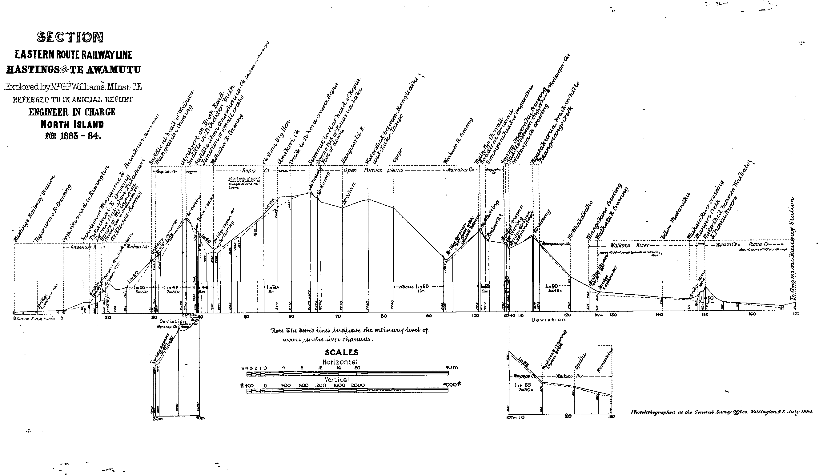 SECTION EASTERN ROUTE RAILWAY LINE HASTINGS TO TE AWAMUTU Explored by Mr GPWilliams, MInst CE. REFERRED TO IN ANNUAL REPORT ENGINEER IN CHARGE North Island FOR 1885-84.