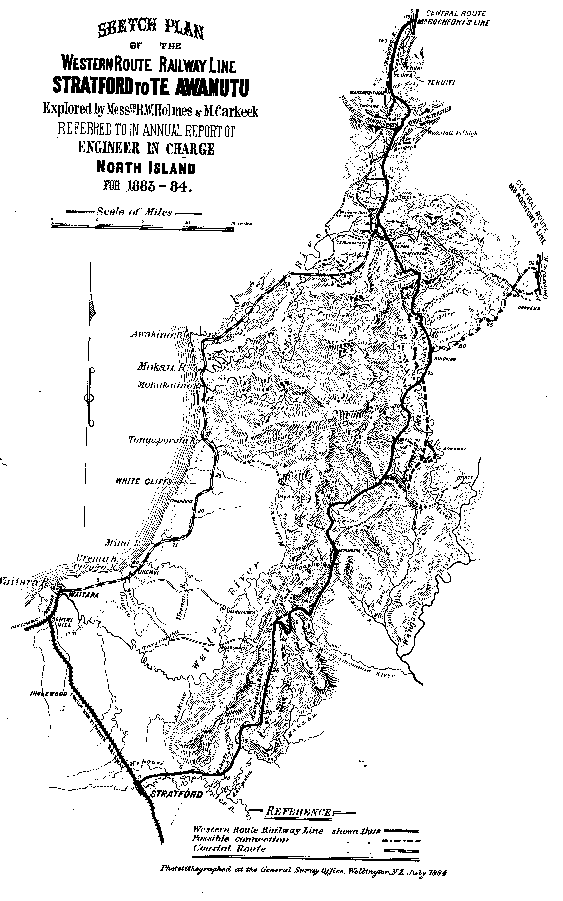 SKETCH PLAN OF THE Western Route Railway Line STRATFORD to TE AMAMUTU Explored by Messrs R.W. Holmes & M. Carkeek REFERRED TO IN ANNUAL REPORT OF ENGINEER ON CHARGE North Island FOR 1885-84.