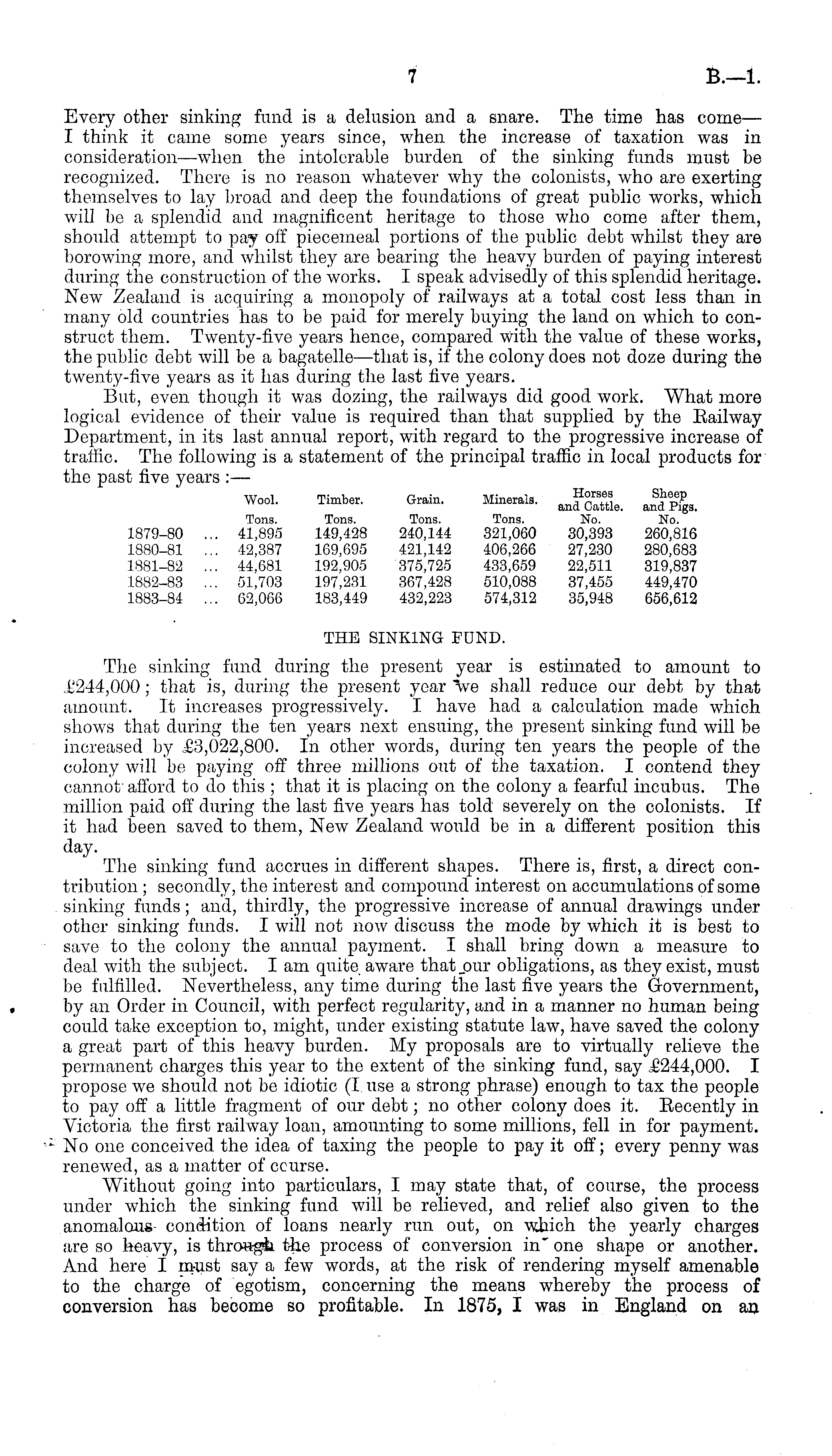 Every other sinking fund is a delusion and a snare. The time has come— I think it came some years since, when the increase of taxation was in consideration—when the intolerable burden of the sinking funds must be recognized. There is no reason whatever why the colonists, who are exerting themselves to lay broad and deep the foundations of great public works, which will be a splendid and magnificent heritage to those who come after them, should attempt to pay off piecemeal portions of the public debt whilst they are borowing more, and whilst they are bearing the heavy burden of paying interest during the construction of the works. I speak advisedly of this splendid heritage. New Zealand is acquiring a monopoly of railways at a total cost less than in many old countries has to be paid for merely buying the land on which to construct them. Twenty-five years hence, compared with the value of these works, the public debt will be a bagatelle—that is, if the colony does not doze during the twenty-five years as it has during the last five years. But, even though it was dozing, the railways did good work. What more logical evidence of their value is required than that supplied by the Eailway Department, in its last annual report, with regard to the progressive increase of traffic. The following is a statement of the principal traffic in local products for the past five years :— Wool. Timber. Grain. Minerals. J^L Tons. Tons. Tons. Tons. No. No. 1879-80 ... 41,895 149,428 240,144 321,060 30,393 260,816 1880-81 ... 42,387 169,695 421,142 406,266 27,230 280,683 1881-82 ... 44,681 192,905 375,725 433,659 22,511 319,837 1882-83 ... 51,703 197,231 367,428 510,088 37,455 449,470 1883-84 ... 62,066 183,449 432,223 574,312 35,948 656,612 THE SINKING FUND. The sinking fund during the present year is estimated to amount to £244,000 ; that is, during the present year we shall reduce our debt by that amount. It increases progressively. I have had a calculation made which shows that during the ten years next ensuing, the present sinking fund will be increased by £3,022,800. In other words, during ten years the people of the colony will be paying off three millions out of the taxation. I contend they cannot' afford to do this ; that it is placing on the colony a fearful incubus. The million paid off during the last five years has told severely on the colonists. If it had been saved to them, New Zealand would be in a different position this day. The sinking fund accrues in different shapes. There is, first, a direct contribution ; secondly, the interest and compound interest on accumulations of some sinking funds; and, thirdly, the progressive increase of annual drawings under other sinking funds. I will not now discuss the mode by which it is best to save to the colony the annual payment. I shall bring down a measure to deal with the subject. lam quite aware that_our obligations, as they exist, must be fulfilled. Nevertheless, any time during the last five years the Government, by an Order in Council, with perfect regularity, and in a manner no human being could take exception to, might, under existing statute law, have saved the colony a great part of this heavy burden. My proposals are to virtually relieve the permanent charges this year to the extent of the sinking fund, say £244,000. I propose we should not be idiotic (I use a strong phrase) enough to tax the people to pay off a little fragment of our debt; no other colony does it. Eecently in Victoria the first railway loan, amounting to some millions, fell in for payment. No one conceived the idea of taxing the people to pay it off; every penny was renewed, as a matter of ccurse. Without going into particulars, I may state that, of course, the process under which the sinking fund will be relieved, and relief also given to the anomalous condition of loans nearly run out, on which the yearly charges are so heavy, is through the process of conversion in" one shape or another. And here t must say a few words, at the risk of rendering myself amenable to the charge of egotism, concerning the means whereby the process of conversion has become so profitable. In 1875, I was in England on an