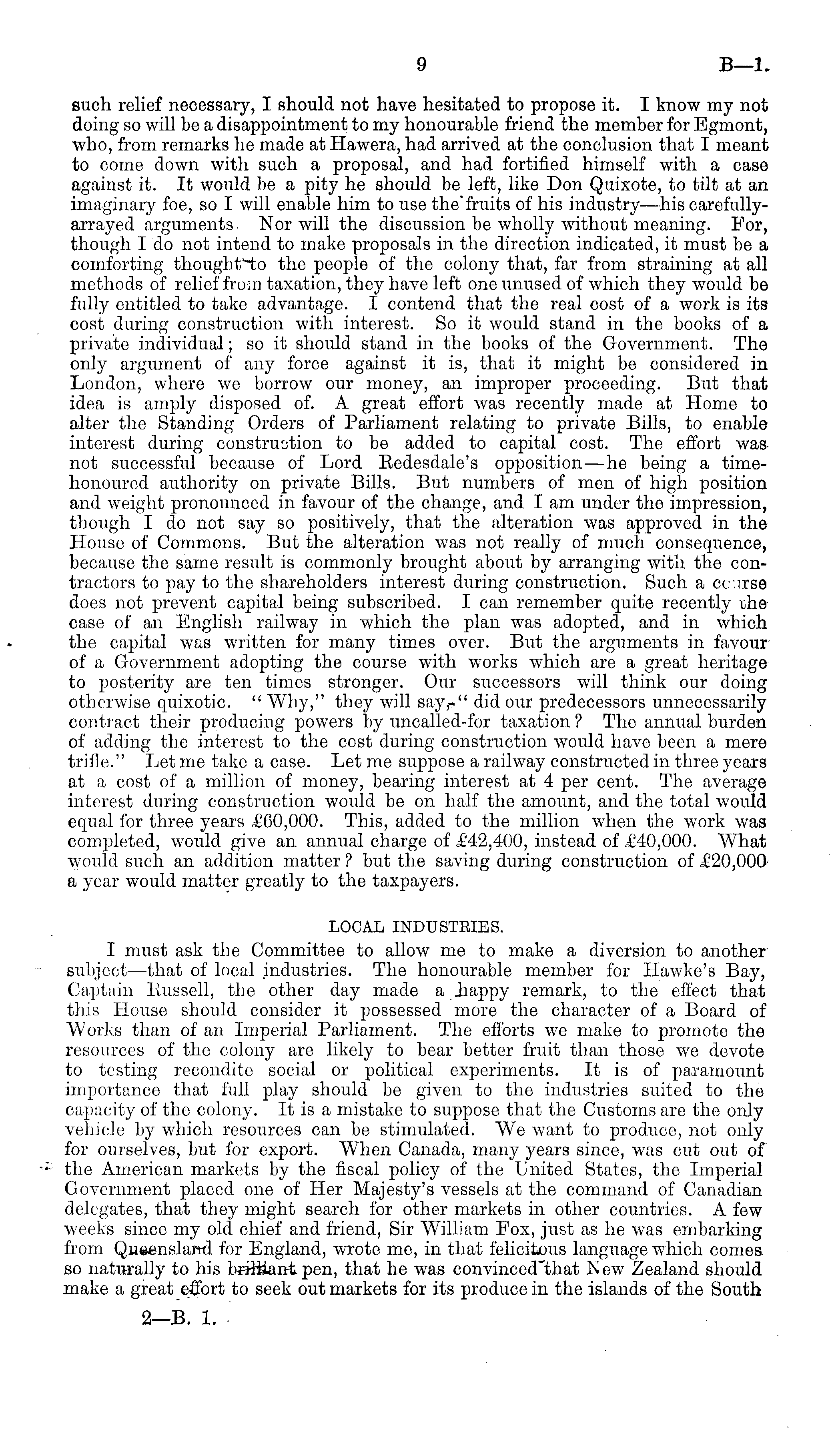 such relief necessary, I should not have hesitated to propose it. I know my not doing so will be a disappointment to my honourable friend the member for Egmont, who, from remarks he made at Hawera, had arrived at the conclusion that I meant to come down with such a proposal, and had fortified himself with a case against it. It would be a pity he should be left, like Don Quixote, to tilt at an imaginary foe, so I will enahle him to use the'fruits of his industry—his carefullyarrayed arguments. Nor will the discussion be wholly without meaning. For, though I do not intend to make proposals in the direction indicated, it must be a comforting thought "to the people of the colony that, far from straining at all methods of relief fro3n taxation, they have left one unused of which they would be fully entitled to take advantage. I contend that the real cost of a work is its cost during construction with interest. So it would stand in the books of a private individual; so it should stand in the books of the Government. The only argument of any force against it is, that it might be considered in London, where we borrow our money, an improper proceeding. But that idea is amply disposed of. A great effort was recently made at Home to alter the Standing Orders of Parliament relating to private Bills, to enable interest during construction to be added to capital cost. The effort was not successful because of Lord Eedesdale's opposition—he being a timehonoured authority on private Bills. But numbers of men of high position and weight pronounced in favour of the change, and I am under the impression, though I do not say so positively, that the alteration was approved in the House of Commons. But the alteration was not really of much consequence, because the same result is commonly brought about by arranging with the contractors to pay to the shareholders interest during construction. Such acc irse does not prevent capital being subscribed. I can remember quite recently the case of an English railway in which the plan was adopted, and in which the capital was written for many times over. But the arguments in favour of a Government adopting the course with works which are a great heritage to posterity are ten times stronger. Our successors will think our doing otherwise quixotic. " Why," they will say,-" did our predecessors unnecessarily contract their producing powers by uncalled-for taxation ? The annual burden of adding the interest to the cost during construction would have been a mere trifle." Let me take a case. Let me suppose a railway constructed in three years at a cost of a million of money, bearing interest at 4 per cent. The average interest during construction would be on half the amount, and the total would equal for three years £60,000. This, added to the million when the work was completed, would give an annual charge of £42,400, instead of £40,000. What would such an addition matter ? but the saving during construction of £20,000 a year would matter greatly to the taxpayers. LOCAL INDUSTRIES. I must ask the Committee to allow me to make a diversion to another subject—that of local industries. The honourable member for Hawke's Bay, Captain Eussell, tbe other day made a happy remark, to the effect that this House should consider it possessed more the character of a Board of Works than of an Imperial Parliament. The efforts we make to promote the resources of the colony are likely to bear better fruit than those we devote to testing recondite social or political experiments. It is of paramount importance that full play should be given to the industries suited to the capacity of the colony. It is a mistake to suppose that tho Customs are the only vehicle by which resources can be stimulated. We want to produce, not only for ourselves, but for export. When Canada, many years since, was cut out of the American markets by the fiscal policy of the United States, the Imperial Government placed one of Her Majesty's vessels at the command of Canadian delegates, that they might search for other markets in other countries. A few weeks since my old chief and friend, Sir William Fox, just as he was embarking from Queensland for England, wrote me, in that felicitous language which comes so naturally to his brilliant pen, that he was convinced'that Mew Zealand should make a great effort to seek out markets for its produce in the islands of the South 2—B. 1.
