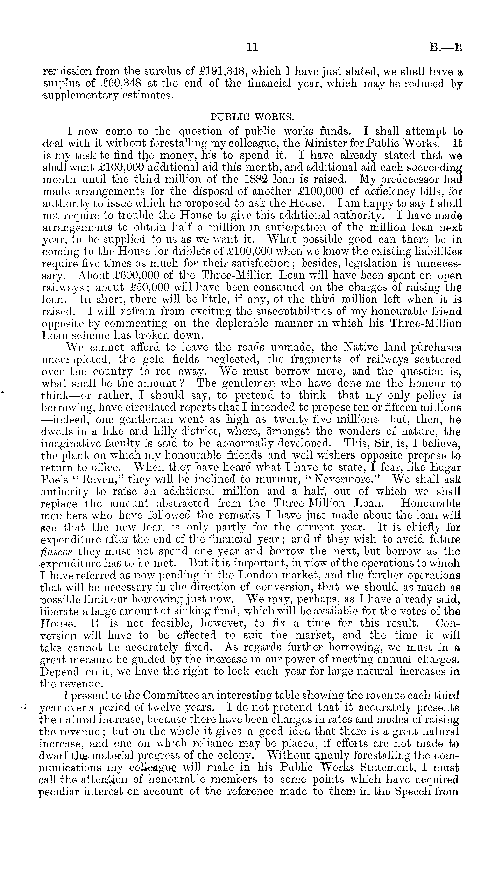remission from the surplus of £191,348, which I have just stated, we shall have a sin plus of £'60,348 at the end of the financial year, which may be reduced by supplementary estimates. PUBLIC WORKS. I now come to the question of public works funds. I shall attempt to ■deal with it without forestalling my colleague, the Minister for Public Works. It is my tiisk to find the money, his to spend it. I have already stated that we shall want £100,000 additional aid this month, and additional aid each succeeding month until the third million of the 1882 loan is raised. My predecessor bad made arrangements for the disposal of another £100,000 of deficiency bills, for authority to issue which he proposed to ask the House. lam happy to say I shall not require to trouble the House to give this additional authority. I bave made arrangements to obtain half a million in anticipation of the million loan next year, to be supplied to us as Ave want it. What possible good can there be in coming to the House for driblets of £100,000 when we know the existing liabilities require five times as much for their satisfaction; besides, legislation is unnecessary. About £600,000 of the Three-Million Loan will have been spent on open railways; about £50,000 will have been consumed on the charges of raising the loan. In short, there will be little, if any, of the third million left when it is raised. I will refrain from exciting the susceptibilities of my honourable friend opposite by commenting on the deplorable manner in which his Three-Million Loan scheme has broken down. We cannot afford to leave the roads unmade, the Native land purchases uncompleted, the gold fields neglected, the fragments of railways scattered over the country to rot away. We must borrow more, and the question is, what shall be the amount ? The gentlemen who have done me the honour to think —or rather, I should say, to pretend to think—that my only policy is borrowing, have circulated reports that I intended to propose ten or fifteen millions ■ —indeed, one gentleman went as high as twenty-five millions—but, then, he dwells in a lake and hilly district, where, amongst the wonders of nature, the imaginative faculty is said to be abnormally developed. This, Sir, is, I believe, the plank on which my honourable friends and well-wishers opposite propose to return to office. When they have heard what I have to state, I fear, like Edgar Poe's " Eaven," they will be inclined to murmur, "Nevermore." We shall ask authority to raise an additional million and a half, out of which we shall replace the amount abstracted from the Tnree-Million Loan. Honourable members who bave followed the remarks I have just made about the loan will see that the new loan is only partly for the current year. It is chiefly for expenditure after the end of the financial year ; and if they wish to avoid future fiascos they must not spend one year and borrow the next, but borrow as the expenditure has to be met. But it is important, in view of the operations to which I have referred as now pending in the London market, and the further operations that will be necessary in the direction of conversion, that we should as much as possible limit our borrowing just now. We may, perhaps, as I have already said, liberate a large amount of sinking fund, which will be available for tbe votes of tbe House. It is not feasible, however, to fix a time for tbis result. Conversion will have to be effected to suit the market, and the time it will take cannot be accurately fixed. As regards further borrowing, we must in a great measure be guided by the increase in our power of meeting annual charges. Depend on it, we have the right to look each year for large natural increases in the revenue. I present to the Committee an interesting table showing tbe revenue each third year over a period of twelve years. Ido not pretend that it accurately presents the natural increase, because there have been changes in rates and modes of raising the revenue; but on the whole it gives a good idea that there is a great natural increase, and one on which reliance may be placed, if efforts are not made to dwarf tlie-material progress of the colony. Without unduly forestalling the communications my colleague will make in his Public Works Statement, I must call the attention of honourable members to some points wbich have acquired peculiar interest on account of the reference made to them in the Speech from