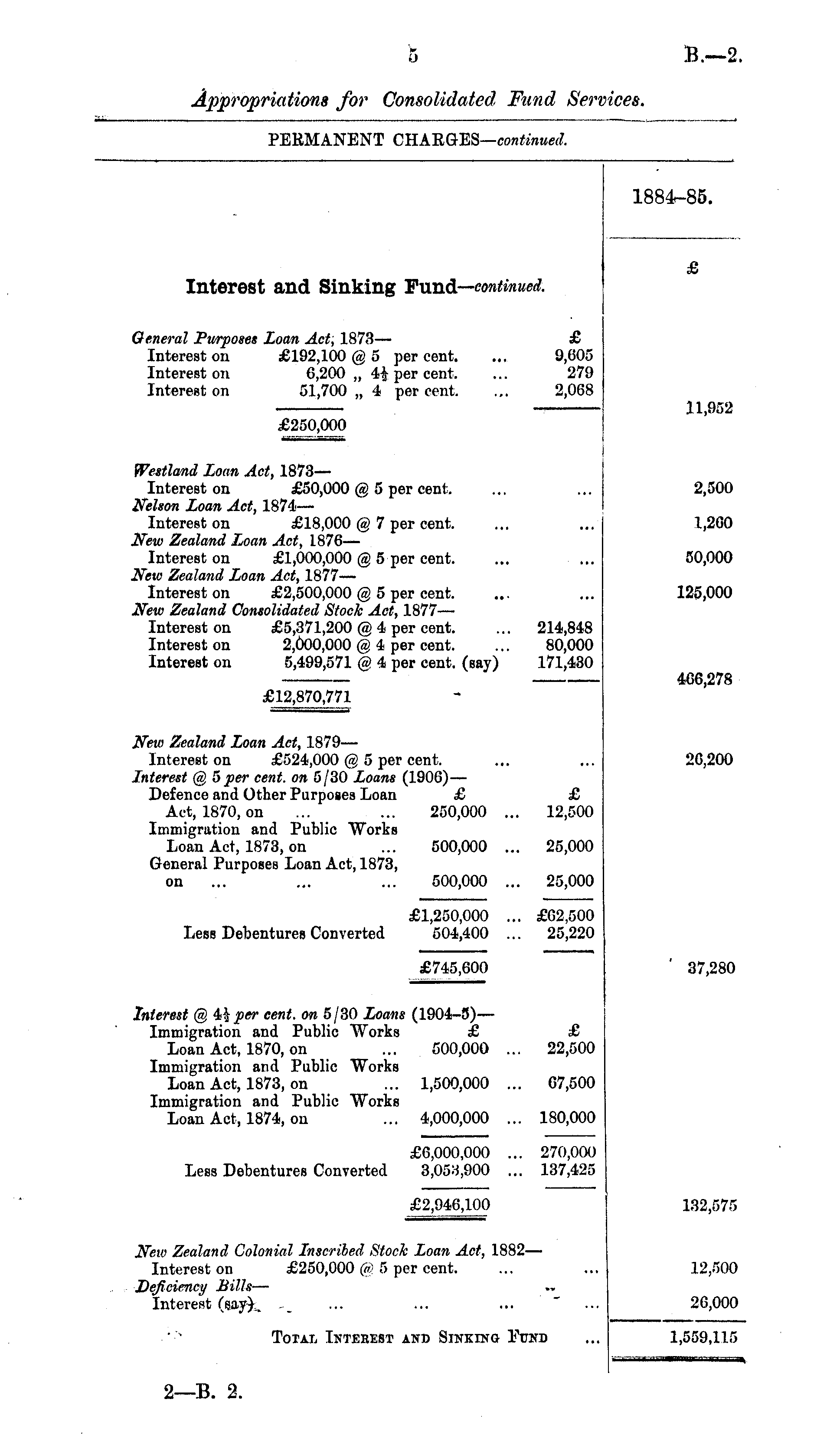 1884^85. *•> Interest and Sinking Fund— continued. General Purposes Loan Act, 1873— £ Interest on £192,100 @ 5 percent. ... 9,605 Interest on 6,200 „ i. per cent. ... 279 Interest on 51,700 „ 4 per cent. ... 2,068 £250,000 11,952 fPestland Loan Act, 1873— Interest on £50,000 @ 5 per cent. Nelson Loan Act, 1874— Interest on £18,000 @ 7 per cent. New Zealand Loan Act, 1876— Interest on £1,000,000 @ 5 per cent. ... ... New Zealand Loan Act, 1877— Interest on £2,500,000 @ 5 per cent. New Zealand Consolidated Stock Act, 1877— Interest on £5,371,200 @ 4 per cent. ... 214,848 Interest on 2,000,000 _, 4 per cent. ... 80,000 Interest on 5,499,571 @ 4 per cent, (say) 17.1,430 2,500 1,200 50,000 125,000 466,278 £12,870,771 * New Zealand Loan Act, 1879 — Interest on £524,000 @ 5 per cent. Interest @ 5 per cent, on 5/30 Loans (1906) — Defence and Other Purposes Loan £ £ Act, 1870, on ... ... 250,000 ... 12,500 Immigration and Public Works Loan Act, 1873, on ... 500,000 ... 25,000 General Purposes Loan Act, 1873, 20,200 on ... ... ... 500,000 ... 25,000 £1,250,000 ... £62,500 Less Debentures Converted 504,400 ... 25,220 ,,«. £745,600 37,280 Interest @ 4$ per cent, on 5/30 Loans (1904-5) — Immigration and Public Works £ £ Loan Act, 1870, on ... 500,000 ... 22,500 Immigration and Public Works Loan Act, 1873, on ... 1,500,000 ... 67,500 Immigration and Public Works Loan Act, 1874, on ... 4,000,000 ... 180,000 £6,000,000 ... 270,000 Less Debentures Converted 3,05:^,900 ... 137,425 £2,946,100 132,575 New Zealand Colonial Inscribed Stock Loan Act, 1882— Interest on £250,000 @ 5 per cent. Deficiency Bills — ■« Interest (say)_ ._ 12,500 26,000 Total Interest and Sinking Fund 1,559,115