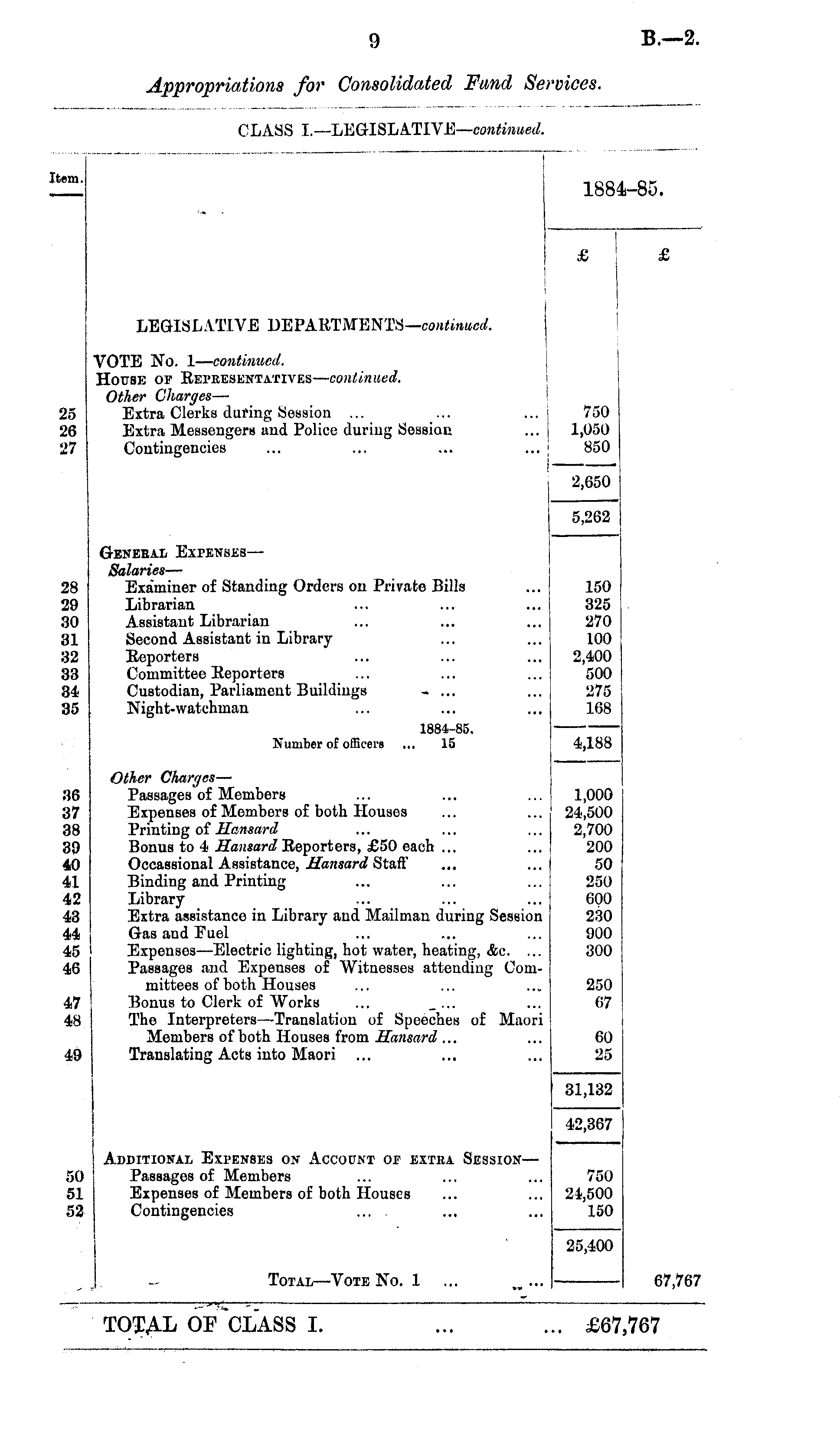 Item. 1884-85. •<» • LEGISLATIVE DEPARTMENTS— continued. 25 26 '27 VOTE No. 1— continued. House of Representatives— continued. Other Charges — Extra Clerks during Session ... Extra Messengers and Police during Session Contingencies 750 1,050 850 2,050 2S 36 80 Bl 82 88 M H Geneba.Ii Expenses— Salaries — Examiner of Standing Orders on Private Bills Librarian Assistant Librarian Second Assistant in Library Reporters Committee Reporters Custodian, Parliament Buildings -> ... Night-watchman 5,262 150 325 270 100 2,400 500 275 168 1884-85. Number of officers ... 15 4,188 36 37 38 39 40 41 42 43 44 45 46 Other Charges — Passages of Members Expenses of Members of both Houses Printing of Hansard Bonus to 4 Hansard Reporters, £50 each ... Occassional Assistance, Hansard Staft' Binding and Printing Library Extra assistance in Library and Mailman during Session Gas and Fuel Expenses —Electric lighting, hot water, heating, &c. ... Passages and Expenses of Witnesses attending Committees of both Houses Bonus to Clerk of Works ... The Interpreters —-Translation of Speeches of Maori Members of both Houses from Hansard ... Translating Acts into Maori ... 1,000 24,500 2,700 200 50 250 600 230 900 300 47 48 250 67 49 60 25 31,132 Additional Expenses on Account op extba Session— Passages of Members Expenses of Members of both Houses Contingencies .... 42,367 750 24,500 150 51 09 25,400 Total —Vote No. 1 ... „ ... 67,767 TOTAL OF CLASS I. £67 767