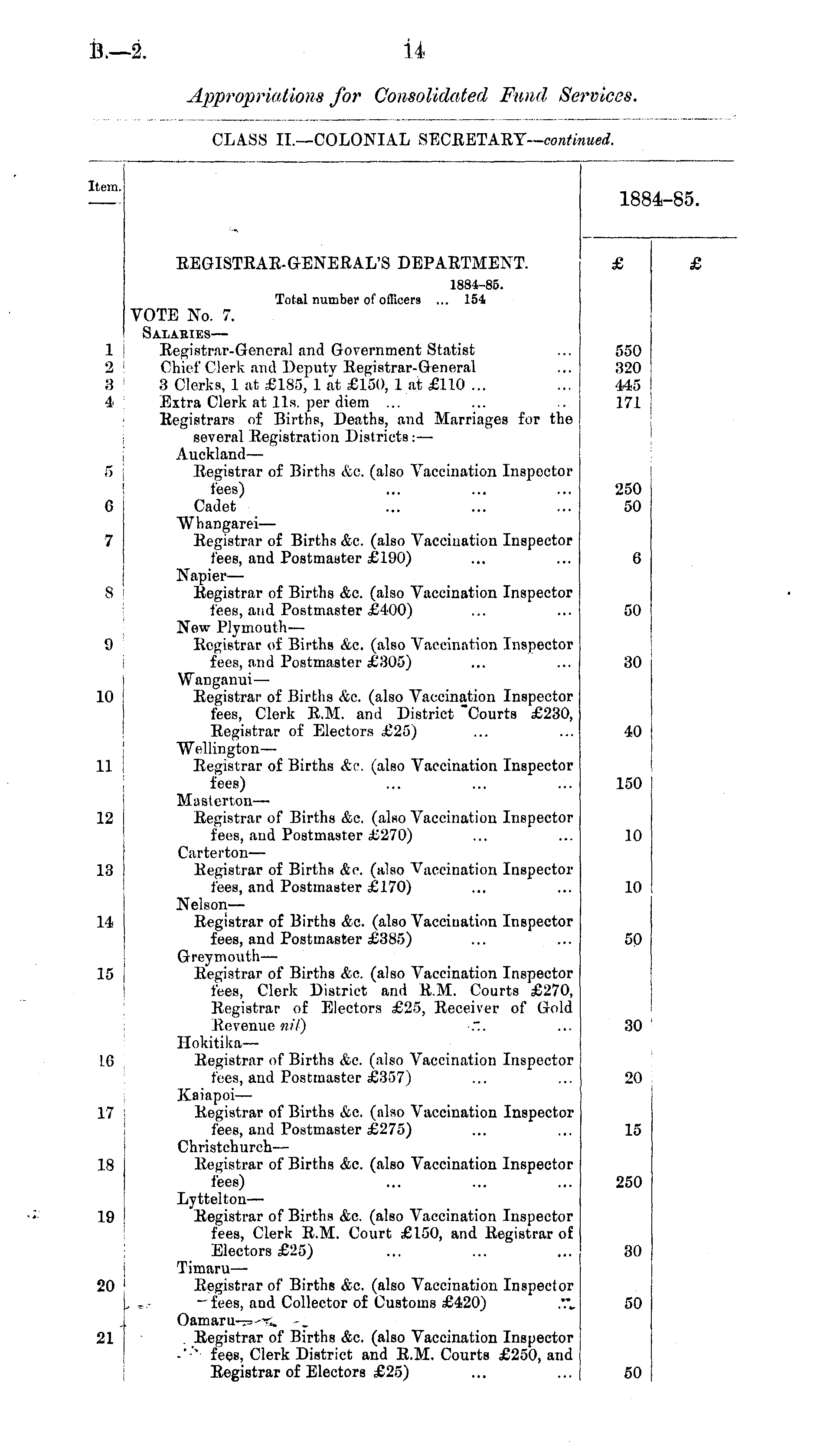 Item. 18 14-85. ■I EEGISTEAE-GENEEAL'S DEPAETMENT. 1884-85. Total number of officers ... 154 1 | 2 : 3 '• 4 ; 5 6 7 8 9 ] I 10 11 12 13 I 3 I 5 e 7 s VOTE No. 7. Salabies— Eegistrar-Gencral and Government Statist Chief Clerk and Deputy Eegistrar-General 3 Clerks, 1 at £185, 1 at £150, 1 at £110 ... Extra Clerk at 11s. per diem ... Eegistrars of Births, Deaths, and Marriages for the several Registration Districts : — Auckland — Eegistrar of Births &c. (also Vaccination Inspector fees) Cadet Whangarei— Eegistrar of Births &c. (also Vaccination Inspector fees, and Postmaster £190) Napier— Eegistrar of Births &c. (also Vaccination Inspector fees, and Postmaster £400) Neiv Plymouth— Eegistrar of Births &c. (also Vaccination Inspector fees, and Postmaster £305) Wanganui — Eegistrar of Births &c. (also Vaccination Inspector fees, Clerk E.M. and District "Courts £230, Eegistrar of Electors £25) Wellington— Eegistrar of Births &e. (also Vaccination Inspector fees) Masterton— Eegistrar of Births &c. (also Vaccination Inspector fees, aud Postmaster £270) Carterton — Eegistrar of Births &c. (also Vaccination Inspector fees, and Postmaster £170) 550 320 445 171 250 50 6 50 30 10 40 11 150 12 10 18 10 14 15 14 15 L8 17 | 18 19 Nelson — Eegistrar of Births &c. (also Vaccination Inspector fees, and Postmaster £385) Greymouth — Eegistrar of Births &c. (also Vaccination Inspector fees, Clerk District and E.M. Courts £270, Eegistrar of Electors £25, Eeceiver of Gold Revenue nil) ~. Hokitika — Eegistrar of Births &c. (also Vaccination Inspector fees, and Postmaster £357) Kaiapoi — Eegistrar of Births &c. (also Vaccination Inspector fees, and Postmaster £275) Christchurch — Eegistrar of Births &c. (also Vaccination Inspector fees) Lyttelton— Eegistrar of Births &c. (also Vaccination Inspector fees, Clerk E.M. Court £150, and Eegistrar of Electors £25) 50 .30 20 15 IS 250 19 20 Timaru— Eegistrar of Births &c. (also Vaccination Inspector - fees, and Collector of Customs £420) .7_ 80 20 60 21 21 Oamaru-r^--,. -. Eegistrar of Births &c. (also Vaccination Inspector " fees, Clerk District and E.M. Courts £250, and Eegistrar of Electors £25) 50