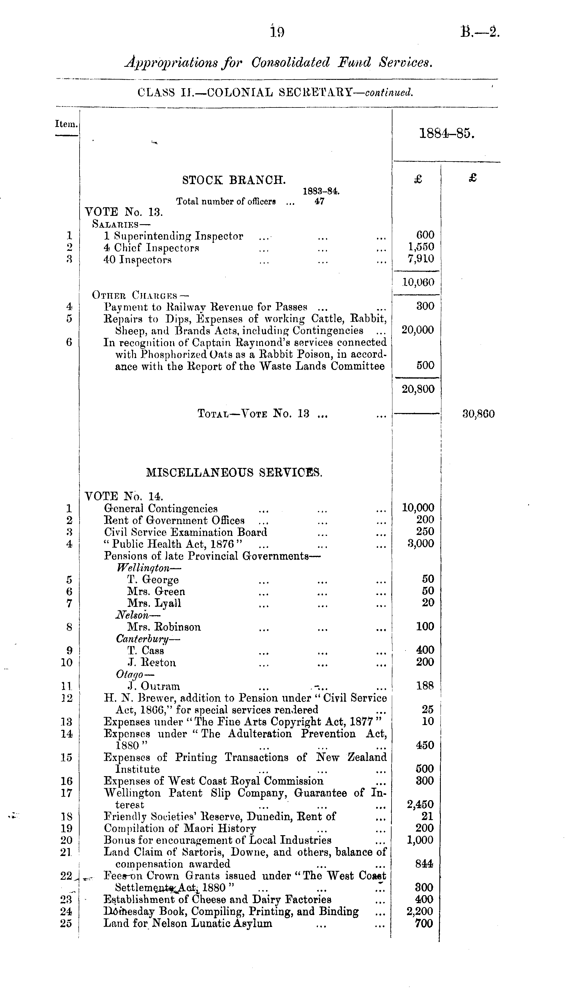 Item. 18: 14-85. *» STOCK BEANCH. 1883-84. Total number of officers ... 47 £ 1 8 VOTE No. 13. Salaries — 1 Superintending Inspector 4 Chief Inspectors 40 Inspectors 600 1,650 7,910 Otheb Charges— Payment to Railway Revenue for Passes ... Eepairs to Dips, Expenses of working Cattle, Babbit, Sheep, and Brands Acts, including Contingencies ... In recognition of Captain Raymond's services connected with rhosphorized Oats as a Rabbit Poison, in accordance with the Report of the Waste Lands Committee 1.0,060 I I 5 300 6 20,000 500 Total—Tote No. 18 ... 20,800 .'30,800 MISCELLANEOUS SERVICES. 5 6 7 8 9 10 11 12 1 2 8 ! VOTE No. 14. General Contingencies Rent of Government Offices Civil Service Examination Board " Public Health Act, 1876" ... Pensions of late Provincial Governments — Wellington— T. George Mrs. Green Mrs. Lyall Nelson— Mrs. Robinson Canterbury — T. Cms J, Reston Ota i/o — J. Outran* ... .-... H. N, Brewer, addition to Pension under " Civil Service Act, 1806," for special services rendered Expenses under "The Fine Arts Copyright Act, 1877 " Expenses under " The Adulteration Prevention Act, 1880" Expenses o£ Printing Transactions of New Zealand Institute Expenses of West Coast Royal Commission Wellington Patent Slip Company, Guarantee of Interest Friendly Societies' Reserve, Duncdin, Rent of Compilation of Maori History Bonus for encouragement of Local Industries Land Claim of Sartoris, Downe, and others, balance of compensation awarded Fee»-on Crown Grants issued under "The West Coast Settlcmenta.Act t 1880" ... ... .7. Establishment of Cheese and Dairy Factories Ddmesday Book, Compiling, Printing, and Binding Land for Nelson Lunatic Asylum 10,000 200 250 3,000 50 50 20 100 400 200 188 25 10 18 14 450 15 500 300 16 17 18 19 20 21 2,450 21 200 1,000 sll 22., 28 24 25 300 400 2,200 700