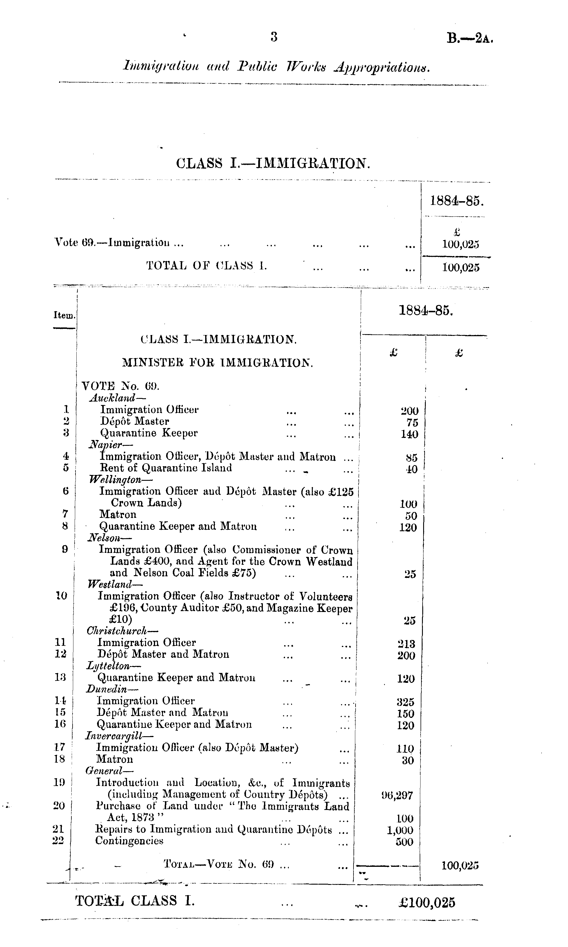 IUQ1 OK I S84--SD 1884-85. Vote 69. —Immigration... £ 100,025 £ 100,025 TOTAL OF CLASS I. 100,025 Item. 188-1-85. Item. CLASS I.—IMMIGRATION. MINISTER FOR IMMIGRATION. £ i £ £ VOTE No. 89. Auckland —■ 1 Immigration Officer 2 Depot Master 3 I Quarantine .Keeper Napier — 4 ! Immigration Officer, Depot Master und Matron ... 5 Rent of Quarantine Island ... . Wellington — 6 j Immigration Officer aud Depot Master (also £125 Crown Lands) 7 Matron 8 I Quarantine Keeper and Matron Nelson — 0 I Immigration Officer (also Commissioner of Crown Lands £400, and Agent for the Crown Westland and Nelson Coal Fields £75) Westland — 10 j Immigration Officer (also Instructor oi Volunteers £100, County Auditor £50, and Magazine Keeper £10) Christchureh — 11 I Immigration Officer 12 Depot Master and Matron Lyttelton — 13 Quarantine Keeper and Matron Dunedin — 14 Immigration Officer 15 Depot Master and Matron 16 i Quarantine Keeper aud Matron | Inverccu-giU — 17 : Immigration Officer (also Depot Master) 18 ! Matron General — 10 I Introduction and Location, &0., of Immigrants (including Management of Country Depots) ... 20 | Purchase of Land under " The Immigrants Land Act, 1873" 21 Repairs to Immigration and Quarantine Depots ... 22 Contingencies 10 I 2 :: 4 0 8 7 8 !) i g 25 25 I i « ] J ] U ■ 200 75 140 85 40 100 50 120 25 25 213 200 120 325 150 120 110 30 297 100 000 500 200 75 140 85 40 100 50 120 11 12 213 200 13 120 14 15 16 325 150 120 17 18 L10 30 19 86,297 20 21 22 LOO 1,000 500 Total—Vote No. 6!) ... ... . 100,025 100,025 TOTAL CLASS I. ■*• • £100,025 £1 10,025 v* •