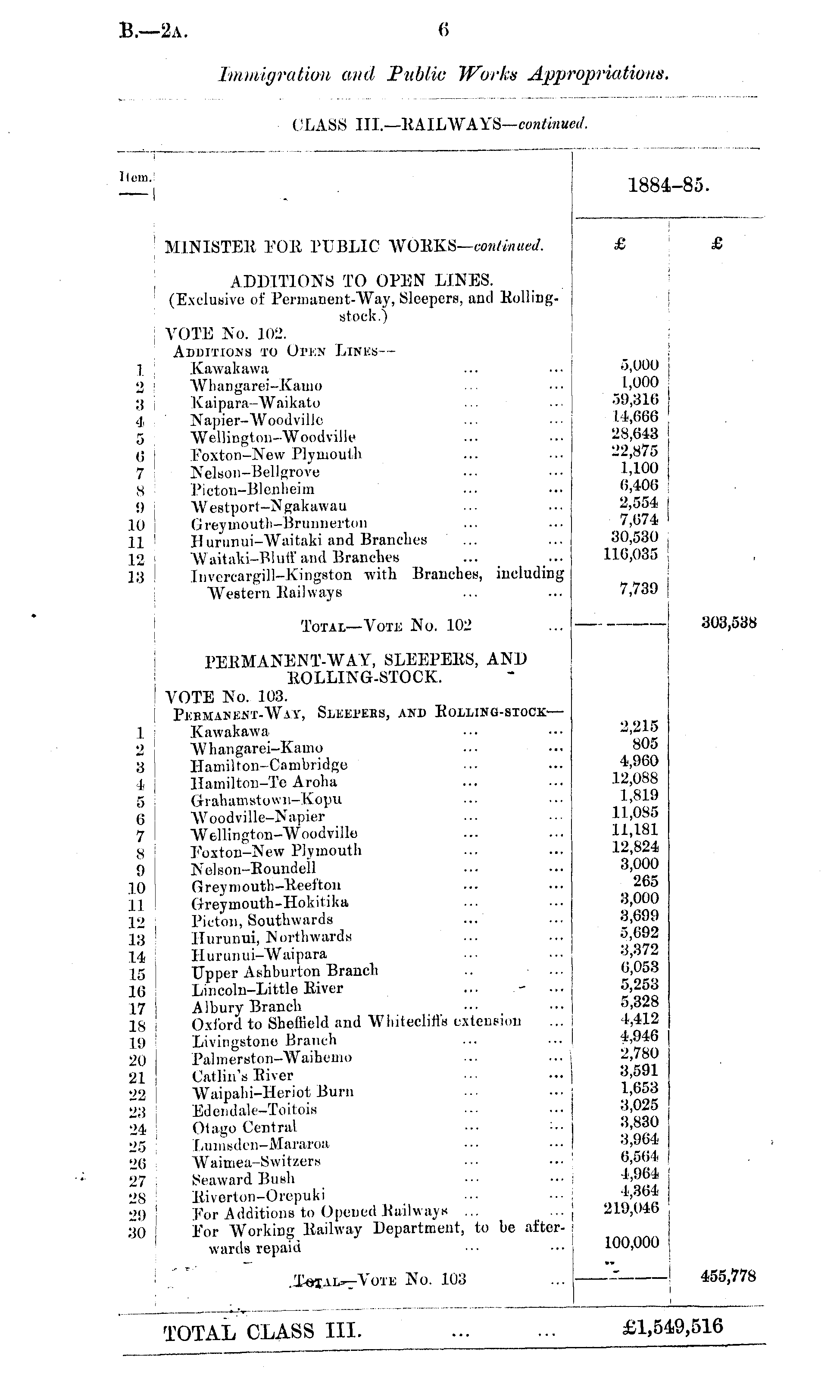 IlemJ 1 188 ,-85. MINISTER rOK PUBLIC WOEKS— continued. £ £ I ADDITIONS TO OPEN LINES. ! (Exclusive of Permanent-Way, Sleepers, and Hollingstock.) VOTE No. 102. Additions to Open Links — 1 Kawakawa 2 ! Whangarei-Kamo 3 j Kiii para-Waikato 4 \ Napier-"Woodvillc 5 Wellington—Woodville 6 | Eoxton-New Plymouth 7 Nelson-Bellgrove 8 ; Picton-Blcnlieim 9 | Westport-Ngakawau 10 i Greymouth-Brimneiton 111 Hurunui-Waitaki and Branches 12' Waitaki-Bluff and Branches 13 i Invercargill-KingRton with Branches, including Western Bailwayi 5,000 1,000 59,316 14,666 28,643 22,875 1,100 6,408 2,554 7,674 30,530 116,035 7,739 I 303,538 Total—Vote No. 102 i PEEMANENT-WAY, SLEEPEES, AND EOLLING-STOCK. VOTE No. 108. PkbMANENT-WaX, SLEEi'EHS, AND EOLLING-STOCK — 1 Kawakawa 2 Whangarei-Kauio 3 ; Hamilton-Cambridge 4 j Hamilton-Te Aroha 5 Graham-tonn-Kopn 6 I Woodville-Napier 7 I Wellington-Woodvillo 8 ! Fo*ton—New Plymouth 9 ! Nelson-Eoundell 10 Greymouth-Eeef'ton 11 i Greyinouth-Hokitika 12 Picton, Southwards 13 Hurunui, Northwards 14 | Hurunui-Waipara 15 Upper Ashburton Branch 16 Lincoln-Little Eiver 17 Albury Branch 18 1 Oxford to Sheffield and Whitecliffs extension 19 ' Livingstone Branch 20 Pahtierston-Waihemo 21 Catlin's Eivcr 22 Waipahi-Heriot Burn 23 Edendale-Toitois 24 i Oiago Central ... :•• 25 [ Lunifcidt'n-Mararoa 26 \ Waimea-Switzers 27 ; Seaward Buisli 28 ! Eiverton-Orepulii 2i) ! For Additions to Opened Railways ... 30 ! For Working Railway Department, to be afterwards repaid 2,215 805 4,9G0 12,088 1,819 11,085 11,181 12,824 3,000 265 3,000 3,690 .3,692 3,372 6,053 5,253 5,328 1,412 4,946 2,780 3,591 1,653 3,025 3,830 3,964 6,564 4,964 1,364 219,046 100,000 .,-^"*"£' . J^tal-tVote No. 103 - _ 455,778 i I I ' , TOTAL CLASS III. £1,549,516