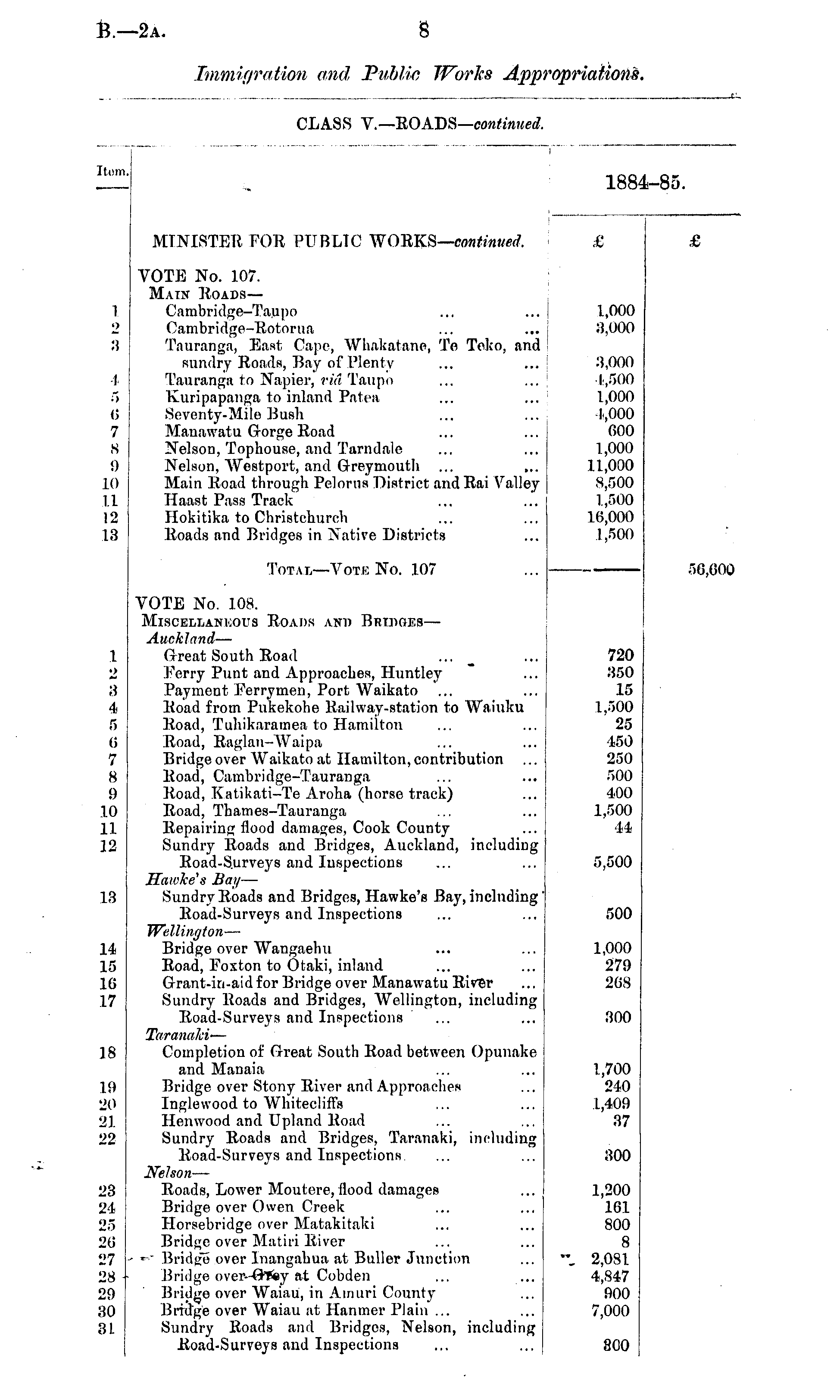 Item. 1884-85. •<•» MINISTER FOR PUBLIC WOBKS- -eontimted. £ £ 1 2 I 5 6 7 S 9 LO II L2 ia VOTE No. 107. Main Roads— Cambridge-Taupo Cambridge-Rotorua Tauranga, East; Cape, Whakatane, To Toko, and sundry Roads, Bay of Plenty Tauranga to Napier, via Taupo Kuripapanga 1o inland Patea Seventy-Mile Bush Manawatu Gorge Road Nelson, Tophouse, and Tarndale Nelson, Westport, and Greymouth Main Road through Pelorns District and Rai Valley Haast Pass Track Hokitika to Christchurch Roads and Bridges in Native Districts 1,000 8,000 8,000 4,500 1,000 1,000 000 1,000 11,000 8,500 1,500 1(5,000 1,500 Total—Votk No. 107 50,000 1 • > ;s 4 5 t; / 8 i) 10 11 12 VOTE No. 108. Miscellanhous Roads and Brtdoes— Auckland — Great South Road Ferry Punt and Approaches, Huntley Payment Ferrymen, Port Waikato Road from Pukekohe Railway-station to Waiuku Road, Tuhikaramea to Hamilton Road, Raglan-Wai pa Bridge over Waikato at Hamilton, contribution Road, Cambridge-Tauranga Road, Katikati-Te Aroha (horse track) Road, Thames-Tauranga Repairing flood damages, Cook County Sundry Roads and Bridges, Auckland, including Road-Surveys and Inspections Hawkers Bay — Sundry Roads and Bridges, Hawke's Bay, including Road-Surveys and Inspections Wellington — Bridge over Wangaehu Road, Foxton to Otaki, inland Grant-in-aid for Bridge over Manavvatu River Sundry Roads and Bridges, Wellington, including Road-Surveys and Inspections Taranalci — Completion of Great South Road between Qpunake and Manaia Bridge over Stony River and Approaches Ingle wood to WhiteclifFs Hen wood and Upland Road Sundry Roads and Bridges, Taranaki, including Road-Surveys and Inspections 720 850 15 1,500 25 450 250 500 400 1,500 44 5,500 L8 500 II 15 16 17 1,000 279 208 :i00 is I!) 20 2] 22 1,700 240 1,400 37 300 28 24 25 26 27 28 29 80 31 Nelson — Roads, Lower Moutere, flood damages Bridge over Owen Creek Horsebridge over Matakitaki Bridge over Miitiri River Bridge over Inangab.ua at Buller Junction Bridge over-GTey at Cobden Bridge over Waiau, in Ainuri County Bridge over Waiau at Hantncr Plain ... Sundry Roads and Bridges, Nelson, including Road-Surveys and Inspections 1,200 161 800 8 2,081 4,847 !)()() 7,000 800