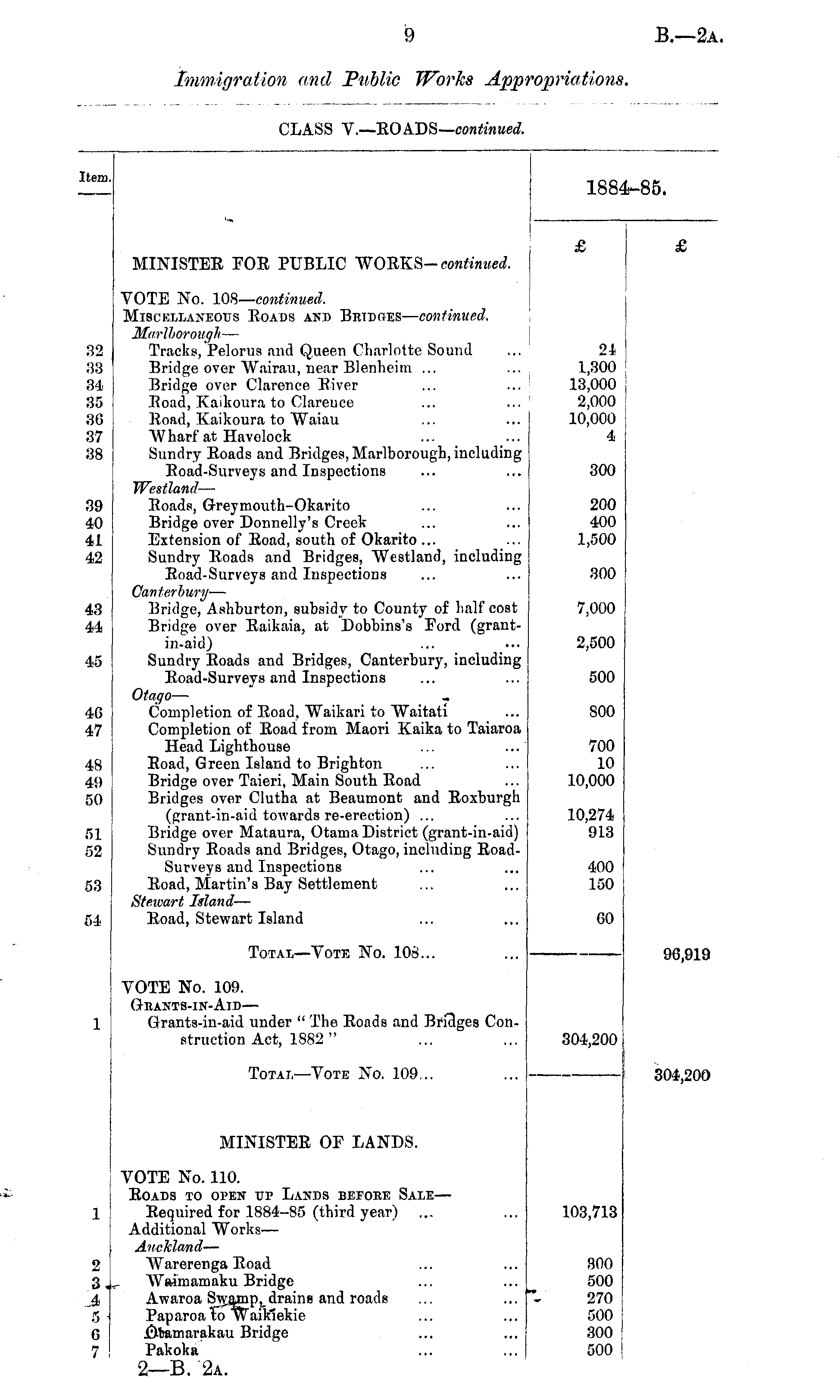 Item 188 ■85. *« ■ MINISTER FOE PUBLIC WORKS-continued. 32 38 :u 86 86 87 88 VOTE No. 108— continued. Miscellaneous Roads and Brtdcjes— coniinued. Marlhorough — Tracks, Pelorus and Queen Charlotte Sound Bridge over Wairau, near Blenheim ... Bridge over Clarence River Road, Kaikour.i to Clarence Road, Kaikoura to Waiau "Wharf at Havolock Sundry Roads and Bridges, Marlborougb, including Road-Surveys and Inspections Westland — Roads, Greymouth-Okarito Bridge over Donnelly's Creek Extension of Road, south of Okarito ... Sundry Roads and Bridges, Westland, including Road-Surveys and Inspections Canterbury- — Bridge, Ashburton, subsidy to County of half cost Bridge over Raikaia, at Dobbins's Ford (grant-in-aid) Sundry Roads and Bridges, Canterbury, including Road-Surveys and Inspections 21 1,300 13,000 2,000 10,000 4 300 88 '10 4L 42 200 400 1,500 300 48 7,000 2,500 45 500 4(i 17 is 49 50 Otaqo — Completion of Road, Waikari to Waitati Completion of Road from Maori Kaika to Taiaroa Head Lighthouse ... ... Road, Green Island to Brighton Bridge over Taieri, Main South Road Bridges over Clutha at Beaumont and Roxburgh (grant-in-aid towards re-erection) ... Bridge over Mataura, Otama District (grant-in-aid) Sundry Roads and Bridges, Otago, including RoadSurveys and Inspections Road, Martin's Bay Settlement Stewart Island — Road, Stewart Island soo 700 10 10,000 10,274 913 51 52 53 400 150 54 60 Total—Vote No. 108... 96,919 VOTE No. 109. GrRANTS-lN-AlD — Grants-in-aid under " The Roads and Bfitlges Construction Act, 1882 " 304,200 304,200 Total—Vote No. 109... MINISTER OF LANDS. 2 3 4 a 6 7 VOTE No. 110. Roads to open up Lands before Sale— Required for 1884-85 (third year) Additional Works— Auckland — Warerenga Road WaJmamaku Bridge Awaroa Swamp, drains and roads Paparoa to Waikiekie .Oitamarakau Bridge Pakoka 2—B. 2a. * ' 103,713 800 500 270 500 300 500