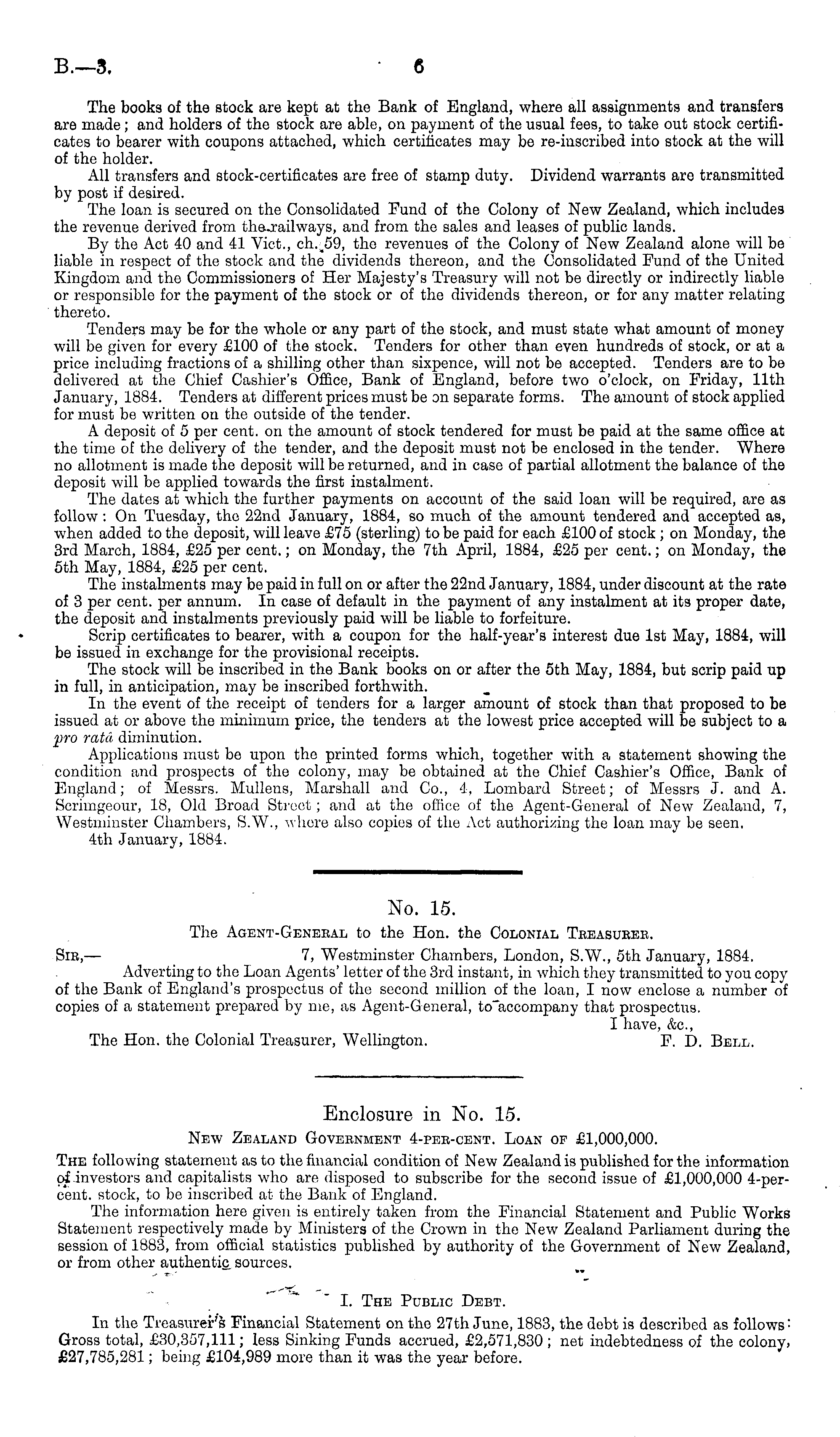 No. 15. The Agent-General to the Hon. the Colonial Treasurer. Sir, — 7, Westminster Chambers, London, S.W., sth January, 1884. Adverting to the Loan Agents' letter of the 3rd instant, in which they transmitted to you copy of the Bank of England's prospectus of the second million of the loan, I now enclose a number of copies of a statement prepared by me, as Agent-General, to'accompany that prospectus. I have, &c, The Hon. the Colonial Treasurer, Wellington. F. D. Bell.