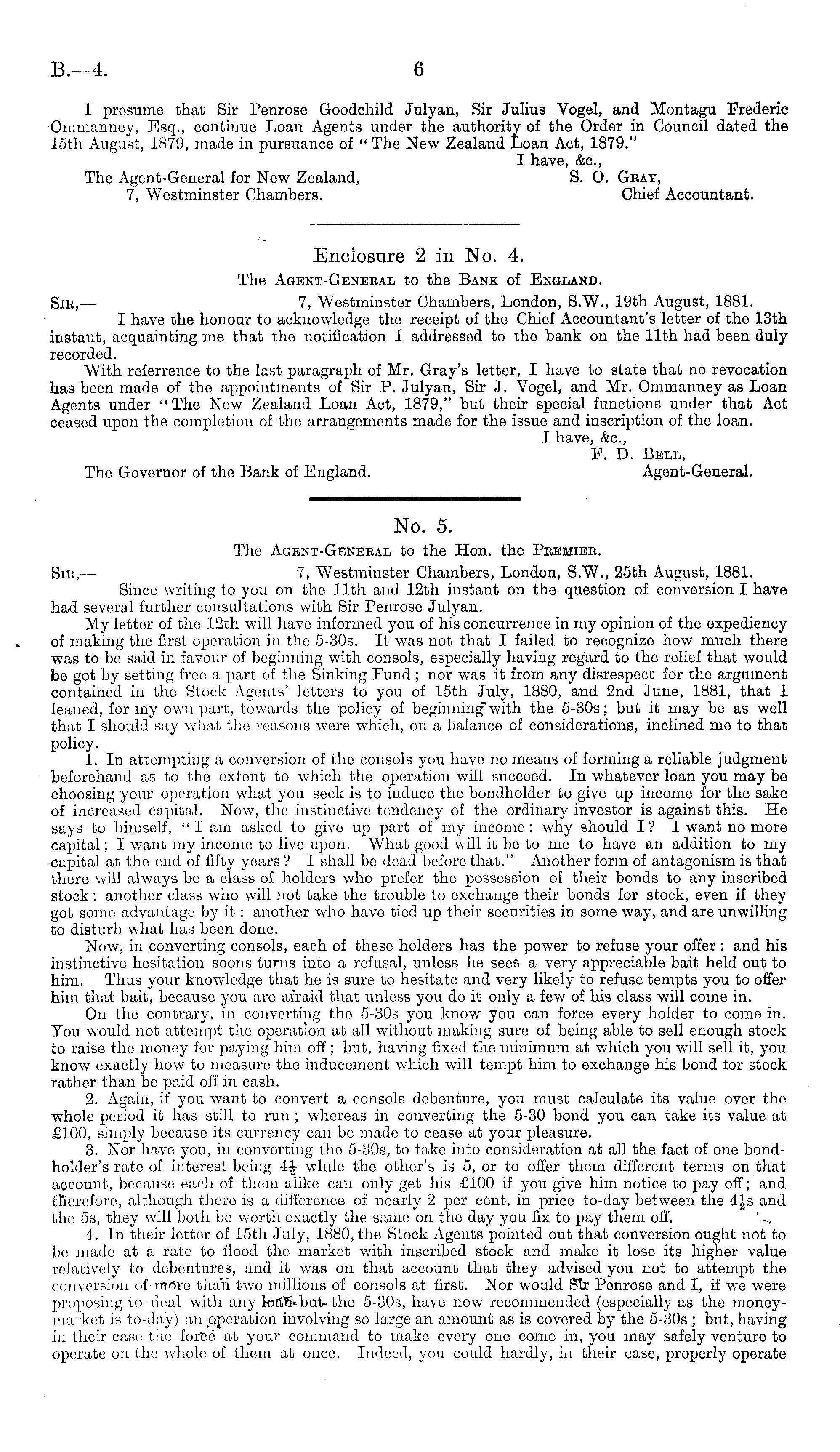 Enclosure 2 in No. 4. The Agent-General to the Bank of England. Sir, — 7, Westminster Chambers, London, S.W., 19th August, 1881. I have the honour to acknowledge the receipt of the Chief Accountant's letter of the 13th instant, acquainting me that the notification I addressed to the bank on the 11th had been duly recorded. With referrence to the last paragraph of Mr. Gray's letter, I have to state that no revocation has been made of the appointments of Sir P. Julyan, Sir J. Vogel, and Mr. Ommanney as Loan Agents under "The Now Zealand Loan Act, 1879," but their special functions under that Act ceased upon the completion of the arrangements made for the issue and inscription of the loan. I have, &c, F. D. Bell, The Governor of the Bank of England. Agent-General.