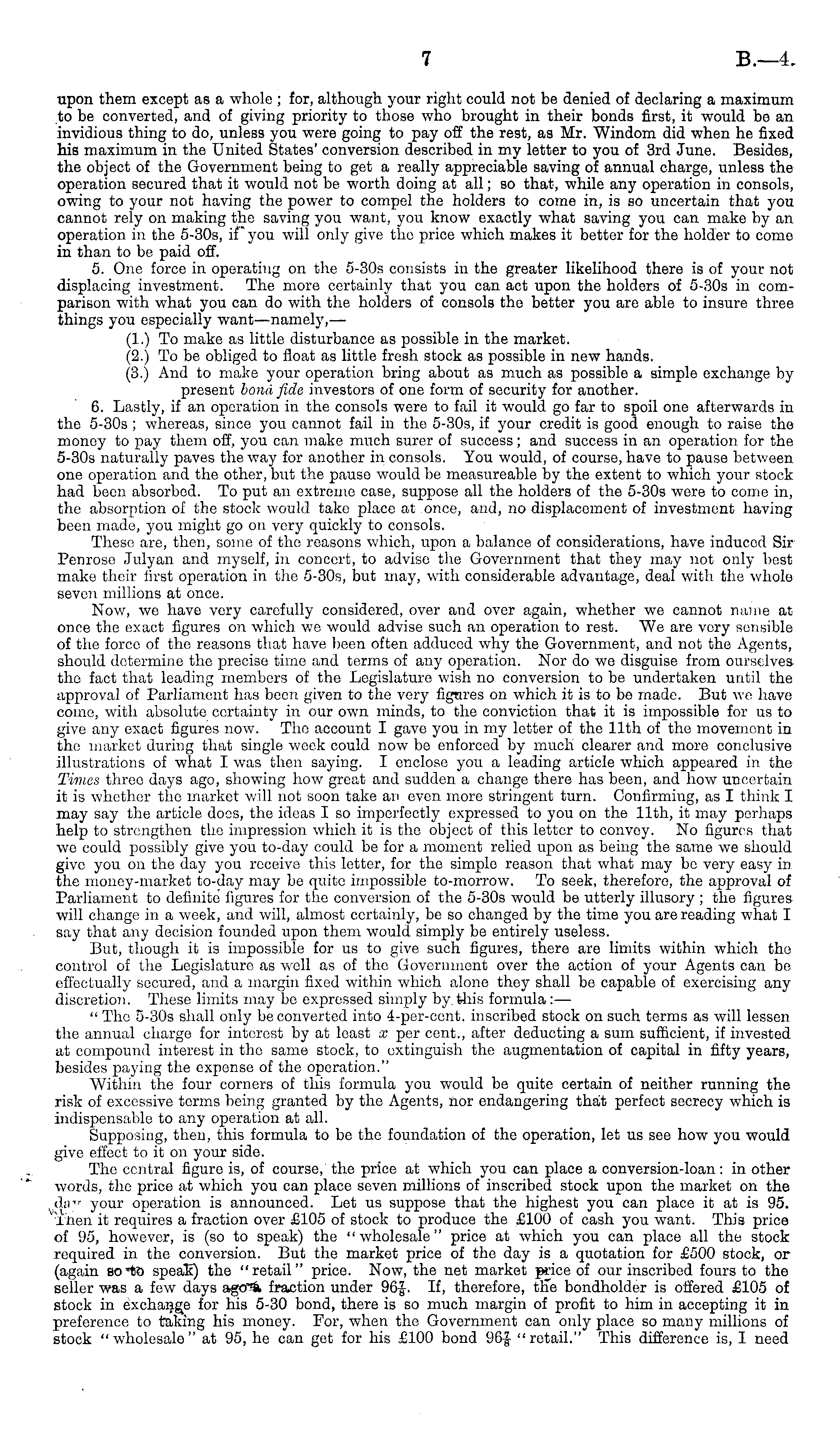 upon them except as a whole ; for, although your right could not be denied of declaring a maximum to be converted, and of giving priority to those who brought in their bonds first, it would bo an invidious thing to do, unless you were going to pay off the rest, as Mr. Windoin did when he fixed his maximum in the United States' conversion described in my letter to you of 3rd June. Besides, the object of the Government being to get a really appreciable saving of annual charge, unless the operation secured that it would not bo worth doing at all; so that, while any operation in consols, owing to your not having the power to compel the holders to come in, is so uncertain that you cannot rely on making the saving you want, you know exactly what saving you can make by an operation in the 5-30s, if you will only give the prico which makes it better for the holder to come in than to be paid off. 5. One force in operating on the 5-30s consists in the greater likelihood there is of your not displacing investment. The more certainly that you can act upon the holders of 5-30s in comparison with what you can do with the holders of consols tho better you are able to insure three things you especially want —namely,— (1.) To make as little disturbance as possible in the market. (2.) To be obliged to float as little fresh stock as possible in new hands. (3.) And to make your operation bring about as much as possible a simple exchange by present bond fide investors of one form of security for another. 6. Lastly, if an operation in the consols were to fail it would go far to spoil one afterwards in the 5-30s ; whereas, since you cannot fail in tho 5-30s, if your credit is good enough to raise the money to pay them off, you can make much surer of success; and success in an operation for the 5-30s naturally paves the way for another in consols. You would, of course, have to pause between one operation and the other, but the pause would be measureable by the extent to which your stock had been absorbed. To put an extreme case, suppose all the holders of the 5-30s wore to come in, the absorption of the stock would take place at once, and, no displacement of investment having been made, you might go on very quickly to consols. These are, then, some of the reasons which, upon a balance of considerations, have induced Sir Penroso Julyan and myself, in concert, to advise the Government that they may not only host make their iirst operation in the 5-30s, but may, with considerable advantage, deal with the whole seven millions at once. Now, we have very carefully considered, over and over again, whether we cannot name at once the exact figures on which we would advise such an operation to rest. We are very sensible of the force of the reasons that have been often adduced why the Government, and not the Agents, should determine tho precise time and terms of any operation. Nor do we disguise from ourselves tho fact that leading members of the Legislature wish no conversion to be undertaken until the approval of Parliament has been given to the very figtires on which it is to be made. But we have come, with absolute certainty in our own minds, to the conviction that it is impossible for us to give any exact figures now. The account I gave you in my letter of the 11th of the movement in tho market during that single week could now be enforced by much clearer and more conclusive illustrations of what I was then saying. I enclose you a leading article which appeared in the Times threo days ago, showing how great and sudden a change there has been, and how uncertain it is whether tho market will not soon take an even more stringent turn. Confirming, as I think I may say the article does, the ideas I so imperfectly expressed to you on the 11th, it may perhaps help to strengthen tho impression which it is the object of this letter to convey. No figures that we could possibly give you to-day could be for a moment relied upon as being the same we should give you on the day you receive this letter, for the simple reason that what may bo very easy in the money-market to-day may be quite impossible to-morrow. To seek, therefore, tho approval of Parliament to definite" figures for the conversion of the 5-30s would be utterly illusory ; the figures will change in a week, and will, almost certainly, be so changed by the time you are reading what I say that any decision founded upon them would simply be entirely useless. But, though it is impossible for us to give such figures, there are limits within which the control of the Legislature as well as of the Government over tho action of your Agents can be effectually secured, and a margin fixed within which alone they shall be capable of exercising any discretion. These limits may bo expressed simply by. this formula : — " The 5-30s shall only be converted into 4-per-cont. inscribed stock on such terms as will lessen the annual charge for interest by at least X per cent., after deducting a sum sufficient, if invested at compound interest in the same stock, to extinguish the augmentation of capital in fifty years, besides paying the expense of the operation." Within the four corners of this formula you would be quite certain of neither running the risk of excessive terms being granted by tho Agents, nor endangering that perfect secrecy which is indispensable to any operation at all. Supposing, then, this formula to be the foundation of the operation, let us see how you would give, effect to it on your side. The central figure is, of course, the price at which you can place a conversion-loan: in other words, the price at which you can place seven millions of inscribed stock upon the market on the d;i" your operation is announced. Let us suppose that the highest you can placo it at is 95. .1 Sen it requires a fraction over £105 of stock to produce the £100 of cash you want. This price of 95, however, is (so to speak) the " wholesale" price at which you can place all the stock requ