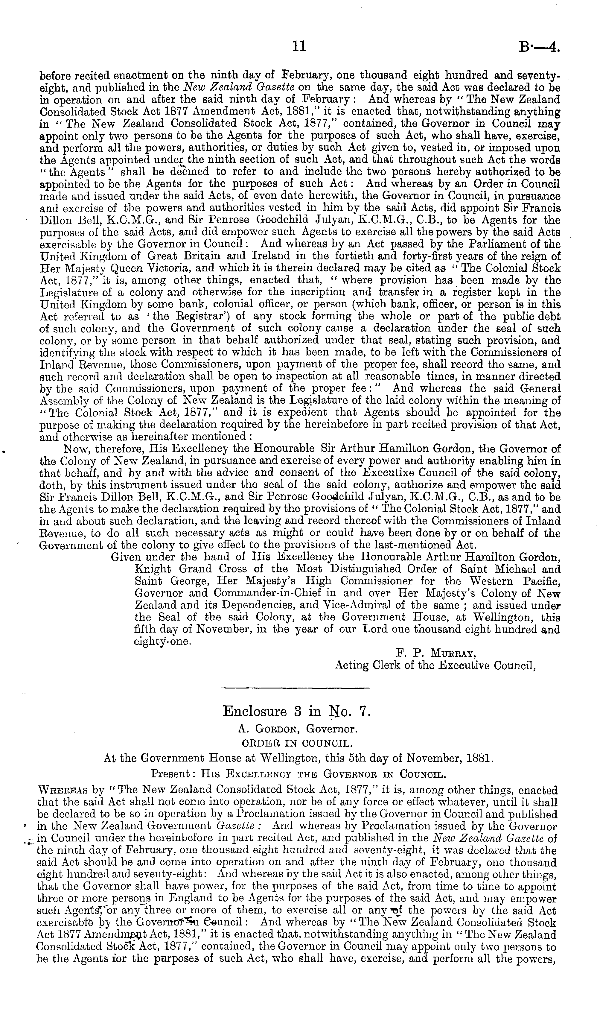 Enclosure 3 in Ho. 7. A. Gordon, Governor. OEDER IN COUNCIL. At the Government Honso at Wellington, this sth day of November, 1881. Present: His Excellency the Goveenoe in Council. Whereas by "The New Zealand Consolidated Stock Act, 1877," it is, among other things, enacted that the said Act shall not come into operation, nor bo of any force or effect whatever, until it shall be declared to be so in'operation by a Proclamation issued by the Governor in Council and published in the New Zealand Government Gazette : And whereas by Proclamation issued by the Governor in Council under the hereinbefore in part recited Act, and published in the New Zealand Gazette of the ninth day of February, one thousand eight hundred and seventy-eight, it was declared that the said Act should be and come into operation on and after the ninth day of February, one thousand eight hundred and seventy-eight: And whereas by the said Act it is also enacted, among other things, that the Governor shall have power, for the purposes of the said Act, from time to time to appoint three or more persons in England to be Agents for the purposes of the said Act, and may empower such Agents, or any three or more of them, to exercise all or any -of the powers by the said Act exercisabte by the Goverrwf^n Geuncil: And whereas by " The Now Zealand Consolidated Stock Act 1877 Amendment Act, 1881," it is enacted that, notwithstanding anything in " The New Zealand Consolidated Stock Act, 1877," contained, the Governor in Council may appoint only two persons to be the Agents for the purposes of such Act, who shall have, exercise, and perform all the powers,