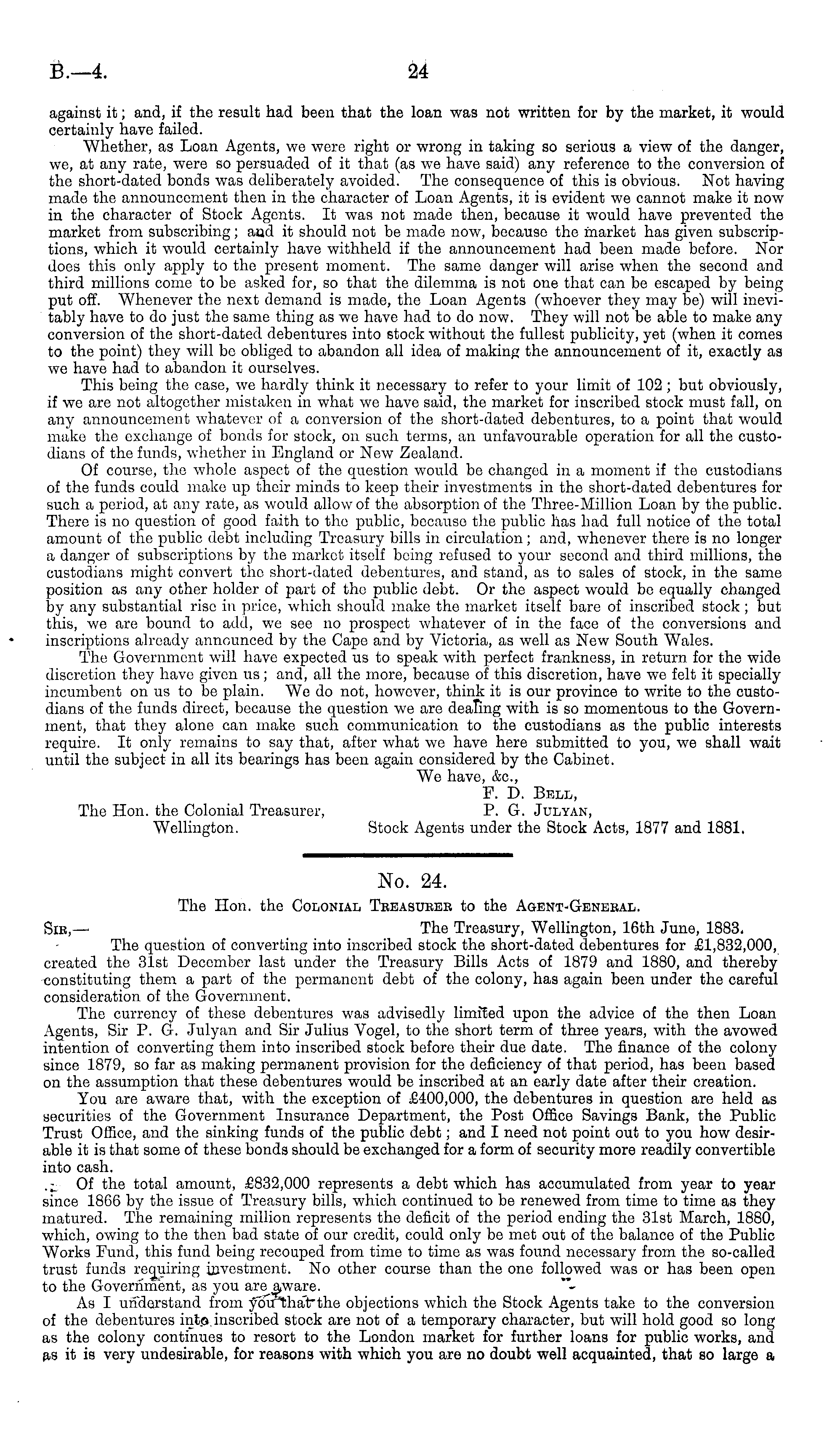 No. 24. The Hon. the Colonial Teeasueee to the Agent-Genehal. Sib,— The Treasury, Wellington, 16th June, 1883. The question of converting into inscribed stock the short-dated debentures for £1,832,000, created the 31st December last under the Treasury Bills Acts of 1879 and 1880, and thereby -constituting them a part of the permanent debt of the colony, has again been under the careful consideration of the Government. The currency of these debentures was advisedly limited upon the advice of the then Loan Agents, Sir P. G. Julyan and Sir Julius Vogel, to the short term of three years, with the avowed intention of converting them into inscribed stock before their due date. The finance of the colony since 1879, so far as making permanent provision for the deficiency of that period, has been based on the assumption that these debentures would be inscribed at an early date after their creation. You are aware that, with the exception of £400,000, the debentures in question are held as securities of the Government Insurance Department, the Post Office Savings Bank, the Public Trust Office, and the sinking funds of the public debt; and I need not point out to you how desirable it is that some of these bonds should be exchanged for a form of security more readily convertible into cash. ■ Of the total amount, £832,000 represents a debt which has accumulated from year to year since 1866 by the issue of Treasury bills, which continued to be renewed from time to time as they matured. The remaining million represents the deficit of the period ending the 31st March, 1880, which, owing to the then bad state of our credit, could only be met out of the balance of the Public Works Fund, this fund being recouped from time to time as was found necessary from the so-called trust funds requiring investment. No other course than the one followed was or has been open to the Government, as you are j,ware. As I understand from you that" the objections which the Stock Agents take to the conversion of the debentures into inscribed stock are not of a temporary character, but will hold good so long as the colony continues to resort to the London market for further loans for public works, and as it is very undesirable, for reasons with which you are no doubt well acquainted, that so large a