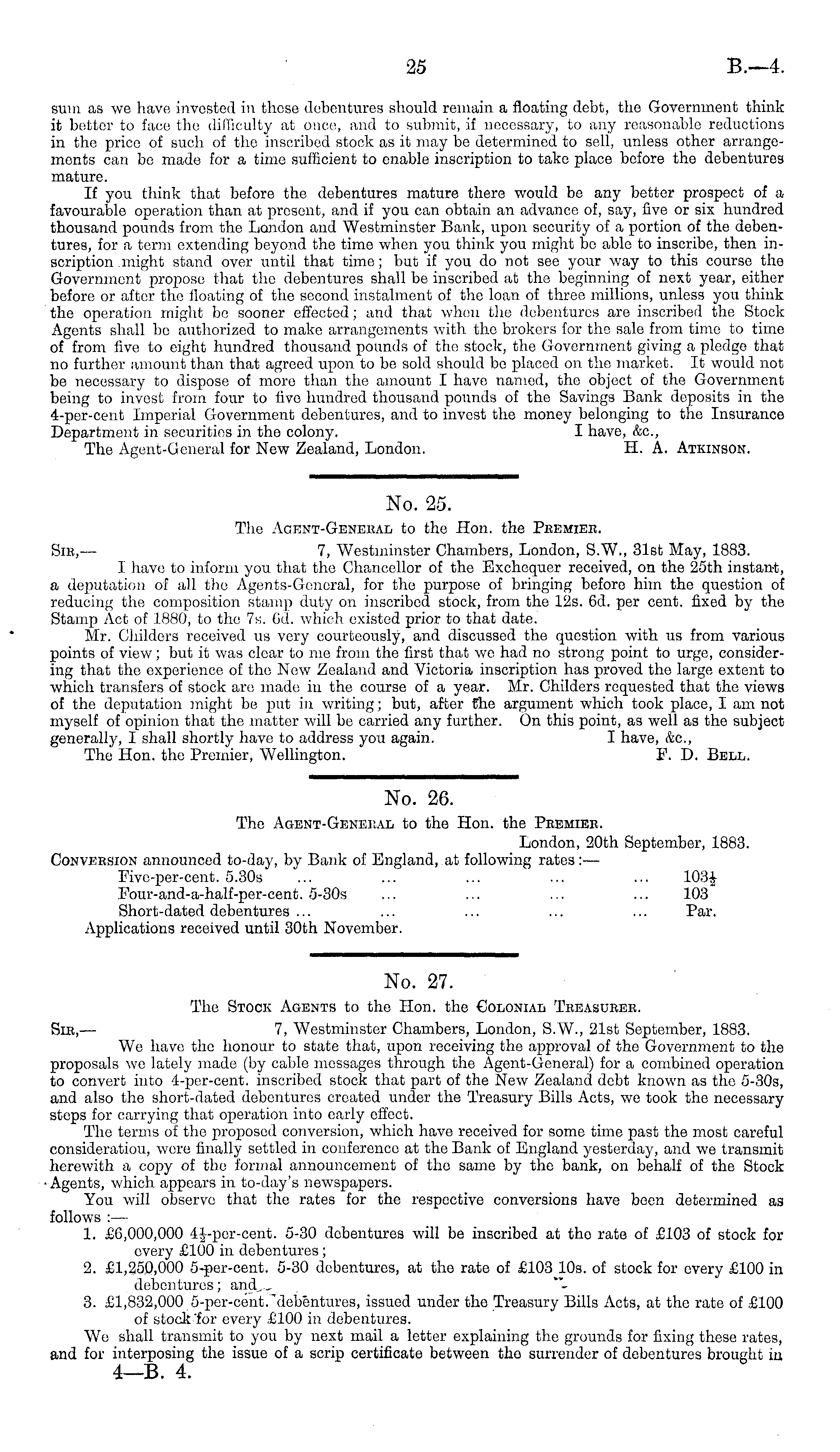 No. 27. The Stock Agents to the Hon. the Colonial Tbeasueee. Sic, — 7, Westminster Chambers, London, S.W., 21st September, 1883. We have the honour to state that, upon receiving the approval of the Government to the proposals we lately made (by cable messages through the Agent-General) for a combined operation to convert into 4-per-cent. inscribed stock that part of the New Zealand debt known as the 5-30s, and also the short-dated debentures created under the Treasury Bills Acts, we took the necessary steps for carrying that operation into early effect. The terms of the proposed conversion, which have received for some time past the most careful consideration, were finally settled in conference at the Bank of England yesterday, and we transmit herewith a copy of the formal announcement of the same by the bank, on behalf of the Stock ■ Agents, which appears in to-day's newspapers. You will observe that the rates for the respective conversions have been determined as follows :— 1. £6,000,000 4^-per-cent. 5-30 debentures will be inscribed at tho rate of £103 of stock for every £100 in debentures; 2. £1,250,000 5-per-cent. 5-30 debentures, at the rate of £103 10s. of stock for every £100 in debentures; and.,,, 3. £1,832,000 5-per-cent. debentures, issued under the Treasury Bills Acts, at tho rate of £100 of stock'for every £100 in debentures. We shall transmit to you by next mail a letter explaining the grounds for fixing these rates, and for interposing the issue of a scrip certificate between tho surrender of debentures brought iv 4—B. 4.