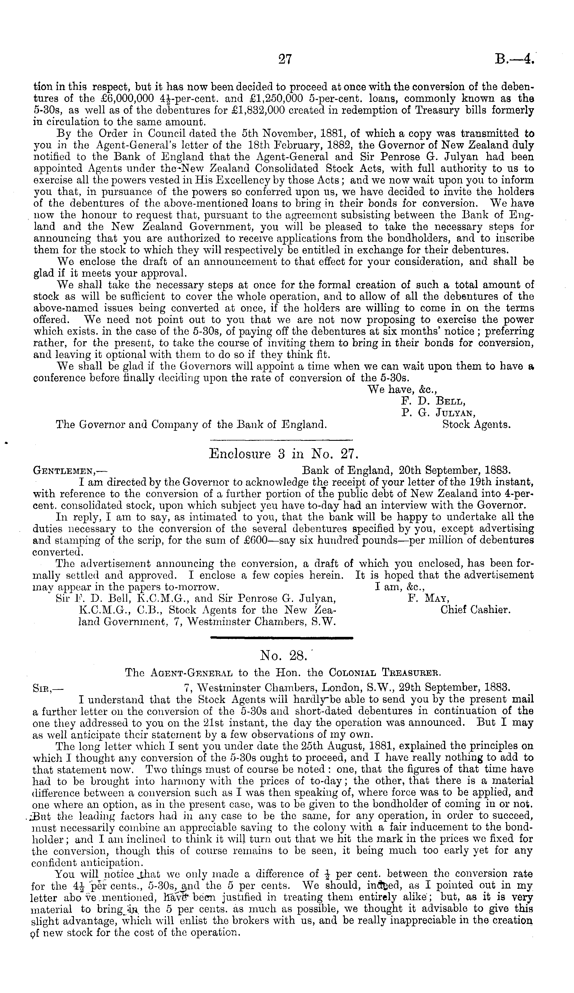 Enclosure 3 in No. 27. Gentlemen, — Bank of England, 20th September, 1883. I am directed by the Governor to acknowledge the receipt of your letter of the 19th instant, with reference to the conversion of a further portion of the public debt of New Zealand into 4-per-cent, consolidated stock, upon which subject yeu have to-day had an interview with the Governor. In reply, I am to say, as intimated to you, that the bank will be happy to undertake all the duties necessary to the conversion of the several debentures specified by you, except advertising and stamping of the scrip, for the sum of £600-—say six hundred pounds—per million of debentures converted. The advertisement announcing the conversion, a draft of which you enclosed, has been formally settled and approved. I enclose a few copies herein. It is hoped that the advertisement may appear in the papers to-morrow. I am, &c, " Sir J |A. D. Bell, K.C.M.G., and Sir Penrose G. Julyan, F. May, K.C.M.G., C.8., Stock Agents for the New Zea- Chief Cashier. land Government, 7, Westminster Chambers, S.W.