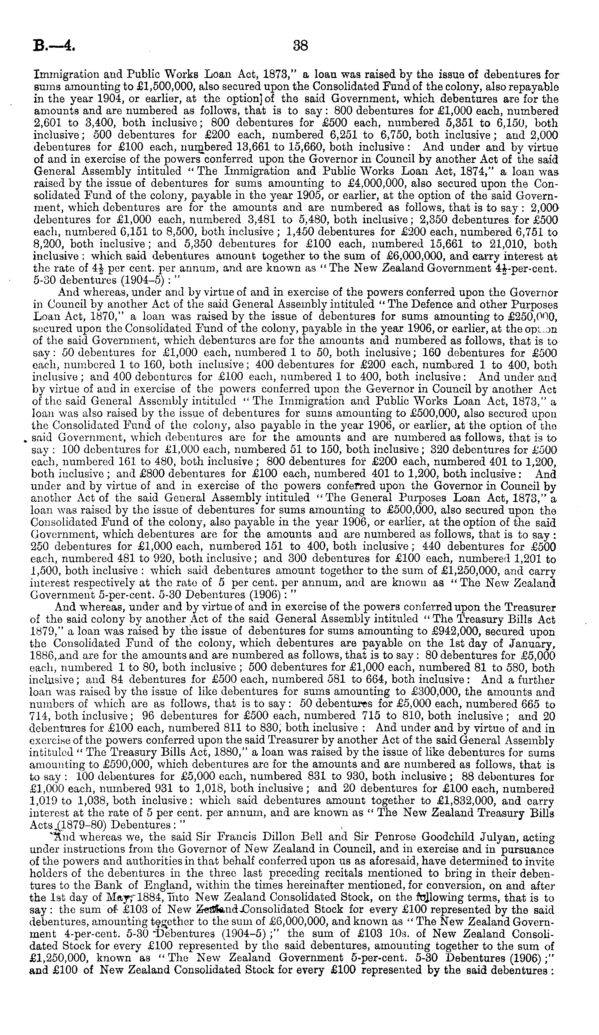 Immigration and Public Works Loan Act, 1873," a loan was raised by the issue of debentures for sums amounting to £1,500,000, also secured upon the Consolidated Fund of the colony, also repayable in the year 1904, or earlier, at the option] of the said Government, which debentures are for the amounts and are numbered as follows, that is to say : 800 debentures for £1,000 each, numbered 2,601 to 3,400, both inclusive; 800 debentures for £500 each, numbered 5,351 to 6,150, both inclusive; 500 debentures for £200 each, numbered 6,251 to 6,750, both inclusive; and 2,000 debentures for £100 each, numbered 13,661 to 15,660, both inclusive : And under and by virtue of and in exercise of the powers conferred upon the Governor iv Council by another Act of the said General Assembly intituled " The Immigration and Public Works Loan Act, 1874," a loan was raised by the issue of debentures for sums amounting to £4,000,000, also secured upon the Consolidated Fund of the colony, payable in the year 1905, or earlier, at the option of the said Government, which debentures are for the amounts and are numbered as follows, that is to say : 2,000 debentures for £1,000 each, numbered 3,481 to 5,480, both inclusive; 2,350 debentures for £500 each, numbered 6,151 to 8,500, both inclusive ; 1,450 debentures for £200 each, numbered 6,751 to 8,200, both inclusive; and 5,350 debentures for £100 each, numbered 15,661 to 21,010, both inclusive : which said debentures amount together to the sum of £6,000,000, and carry interest at the rate of 4i per cent, per annum, and are known as " The New Zealand Government 4A-per-cent. 5-30 debentures (1904-5) : " And whereas, under and by virtue of and in exercise of the powers conferred upon the Governor in Council by another Act of the said General Assembly intituled " The Defence and other Purposes Loan Act, 1870," a loan was raised by the issue of debentures for sums amounting to £250,000, secured upon the Consolidated Fund of the colony, payable in the year 1906, or earlier, at the op; >n of the said Government, which debentures are for the amounts and numbered as follows, that is to say: 50 debentures for £1,000 each, numbered Ito 50, both inclusive; 160 debentures for £500 each, numbered Ito 160, both inclusive; 400 debentures for £200 each, numbered 1 to 400, both inclusive ; and 400 debentures for £100 each, numbered Ito 400, both inclusive : And under and by virtue of and in exercise of the powers conferred upon the Governor in Council by another Act of the said General Assembly intituled "The Immigration and Public Works Loan Act, 1873," a loan was also raised by the issue of debentures for sums amounting to £500,000, also secured upon the Consolidated Fund of the colony, also payable in the year 1906, or earlier, at the option of the said Government, which debentures are for the amounts and are numbered as follows, that is to say : 100 debentures for £1,000 each, numbered 51 to 150, both inclusive ; 320 debentures for £500 each, numbered 161 to 480, both inclusive ; 800 debentures for £200 each, numbered 401 to 1,200, both inclusive ; and £800 debentures for £100 each, numbered 401 to 1,200, both inclusive : And under and by virtue of and in exercise of the powers conferred upon the Governor in Council by another Act of the said General Assembly intituled "The General Purposes Loan Act, 1873," a loan was raised by the issue of debentures for sums amounting to £500,000, also secured upon the Consolidated Fund of the colony, also payable iv the year 1906, or earlier, at the option of the said Government, which debentures are for the amounts and are numbered as follows, that is to say : 250 debentures for £1,000 each, numbered 151 to 400, both inclusive; 440 debentures for £500 each, numbered 481 to 920, both inclusive; and 300 debentures for £100 each, numbered 1,201 to 1,500, both inclusive : which said debentures amount together to the sum of £1,250,000, and carry interest respectively at the rate of 5 per cent, per annum, and are known as " The New Zealand Government 5-per-cent. 5-30 Debentures (1906): " And whereas, under and by virtue of and in exercise of the powers conferred upon the Treasurer of tho said colony by another Act of the said General Assembly intituled "The Treasury Bills Act 1879," a loan was raised by tho issue of debentures for sums amounting to £942,000, secured upon the Consolidated Fund of the colony, which debentures are payable on the Ist day of January, 1886,.and are for the amounts and are numbered as follows, that is to say : 80 debentures for £5,000 each, numbered 1 to 80, both inclusive ; 500 debentures for £1,000 each, numbered 81 to 580, both inclusive; and 84 debentures for £500 each, numbered 581 to 664, botli inclusive: And a further loan was raised by the issuo of liko debentures for sums amounting to £300,000, the amounts and numbers of which are as follows, that is to say : 50 debentures for £5,000 each, numbered 665 to 714, both inclusive; 96 debentures for £500 each, numbered 715 to 810, both inclusive ; and 20 debentures for £100 each, numbered 811 to 830, both inclusive : And under and by virtue of and in exercise of the powers conferred upon the said Treasurer by another Act of the said General Assembly intituled " Tho Treasury Bills Act, 1880," a loan was raised by the issue of like debentures for sums amounting to £590,000, which debentures are for the amounts and are numbered as follows, that is to say : 100 debentures for £5,000 each, numbered 831 to 930, both inclusive ; 88 debentures for £1,000 each, numbered 931 to 1,018, both inclusive ; and 20 debentures for £100 each, numbered 1,019 to 1,038, both inclusive: which said debentures amount together to £1,832,000, and carry interest at tho rate of 5 per cent, per annum, and are known as " The New Zealand Treasury Bills Acts.(lß79-80) Debentures: " And whereas we, the said Sir Francis Dillon Bell and Sir Penrose Goodchild Julyan,