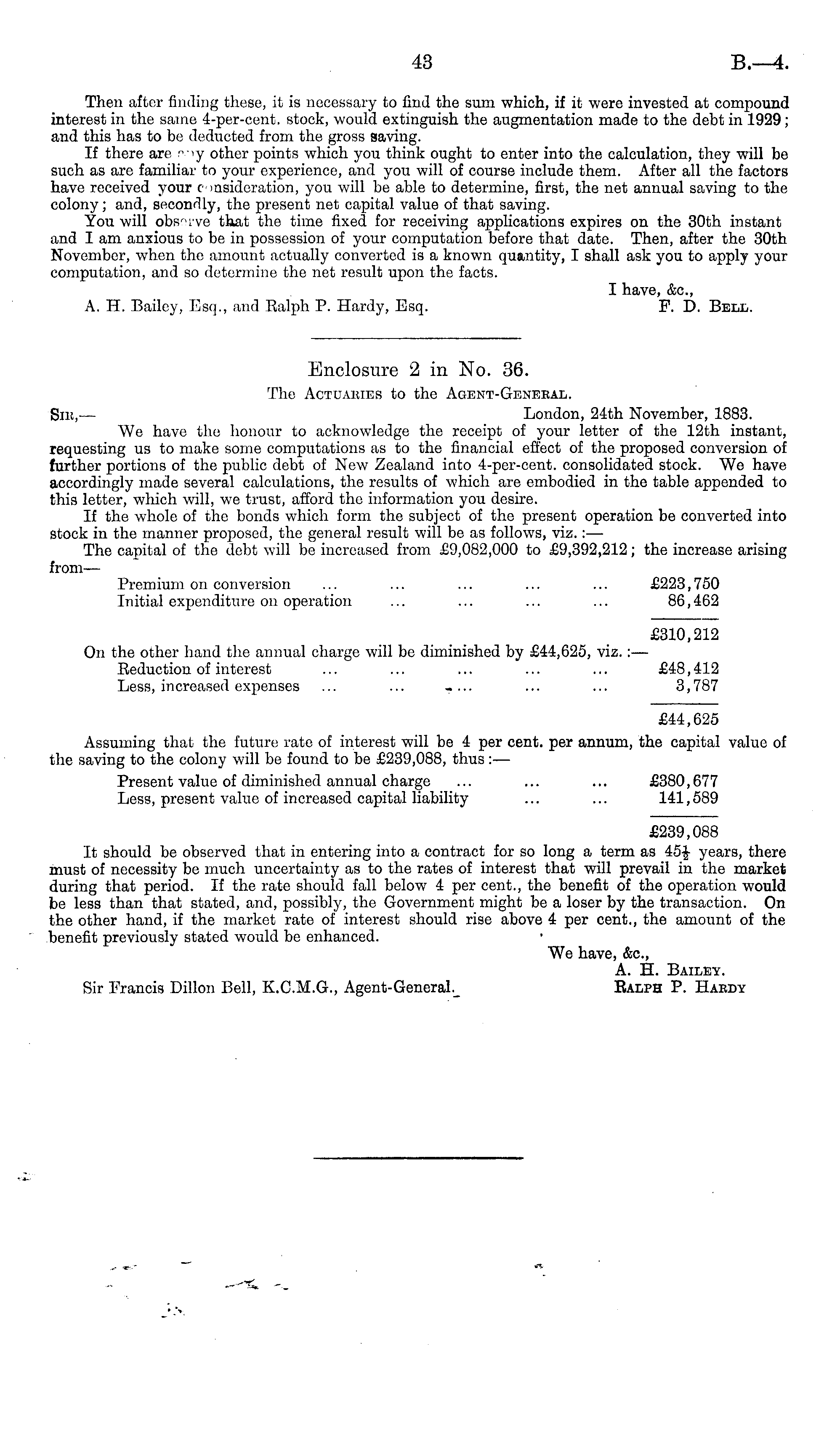 Enclosure 2 in No. 36. The Actdabies to the Agent-Genekal. Sim, — London, 24th November, 1883. We have the honour to acknowledge the receipt of your letter of the 12th instant, requesting us to make some computations as to the financial effect of the proposed conversion of further portions of the public debt of New Zealand into 4-per-cent. consolidated stock. We have accordingly made several calculations, the results of which are embodied in the table appended to this letter, which will, we trust, afford the information you desire. If the whole of the bonds which form the subject of the present operation be converted into stock in the manner proposed, the general result will be as follows, viz.: — The capital of the debt will be increased from £9,082,000 to £9,392,212; the increase arising from— Premium on conversion ... ... ... ... ... £223,750 Initial expenditure on operation ... ... ... ... 86,462 £310,212 On the other hand the annual charge will be diminished by £44,625, viz. :— Seduction of interest ... ... ... ... ... £48,412 Less, increased expenses ... ... -... ... ... 3,787 £44,625 Assuming that the future rate of interest will be 4 per cent, per annum, the capital value of the saving to the colony will be found to be £239,088, thus:— Present value of diminished annual charge ... ... ... £380,677 Less, present value of increased capital liability ... ... 141,589 £239,088 It should be observed that in entering into a contract for so long a term as 45-J- years, there must of necessity be much uncertainty as to the rates of interest that will prevail in the market during that period. If the rate should fall below 4 per cent., the benefit of the operation would be less than that stated, and, possibly, the Government might be a loser by the transaction. On the other hand, if the market rate of interest should rise above 4 per cent., the amount of the benefit previously stated would be enhanced. We have, &c, A. H. Bailey. Sir Francis Dillon Bell, K.C.M.G., Agent-General. Ealph P. Hardy