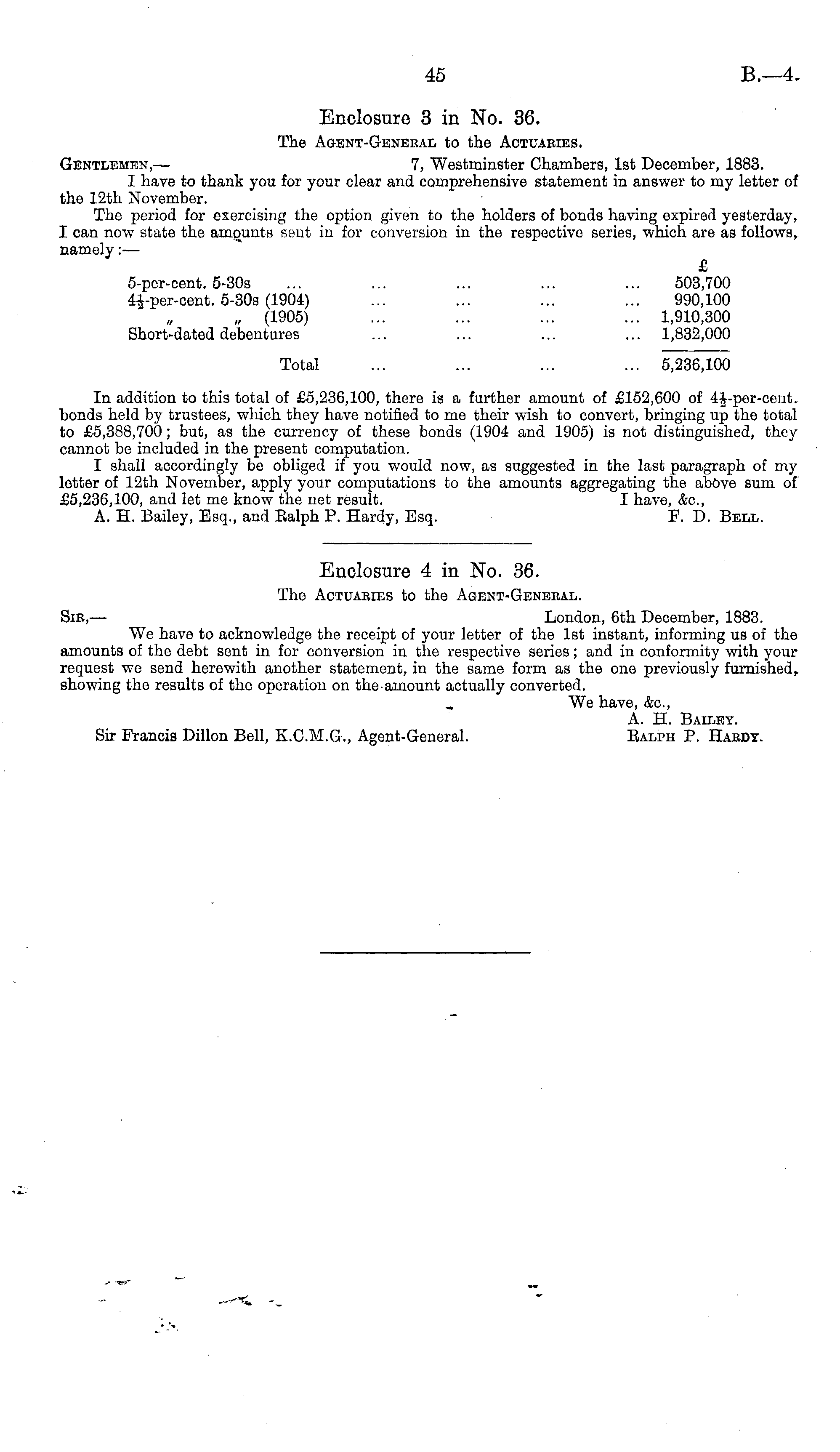 Enclosure 3 in No. 36. The Agent-Geneeal to the Actuaries. Gentlemen, — 7, Westminster Chambers, Ist December, 1883. I have to thank you for your clear and comprehensive statement in answer to my letter of tho 12th November. The period for exercising the option given to the holders of bonds having expired yesterday, I can now state the amounts sent in for conversion in the respective series, which are as follows, namely:— £ 5-per-cent. 5-30s ... ... ... ... ... 503,700 44-pcr-cent. 5-30s (1904) ... ... ... ... 990,100 „ (1905) ... ... ... ... 1,910,300 Short-dated debentures ... ... ... ... 1,832,000 Total ... ... ... ... 5,236,100 In addition to this total of £5,236,100, there is a further amount of £152,600 of 4J-per-cent. bonds hold by trustees, which they have notified to me their wish to convert, bringijig up the total to £5,388,700; but, as the currency of these bonds (1904 and 1905) is not distinguished, they cannot be included in the present computation. I shall accordingly be obliged if you would now, as suggested in the last paragraph of my letter of 12th November, apply your computations to the amounts aggregating the above sum of £5,236,100, and let me know the net result. I have, &c, A. H. Bailey, Esq., and Ralph P. Hardy, Esq. F. D. Bell.