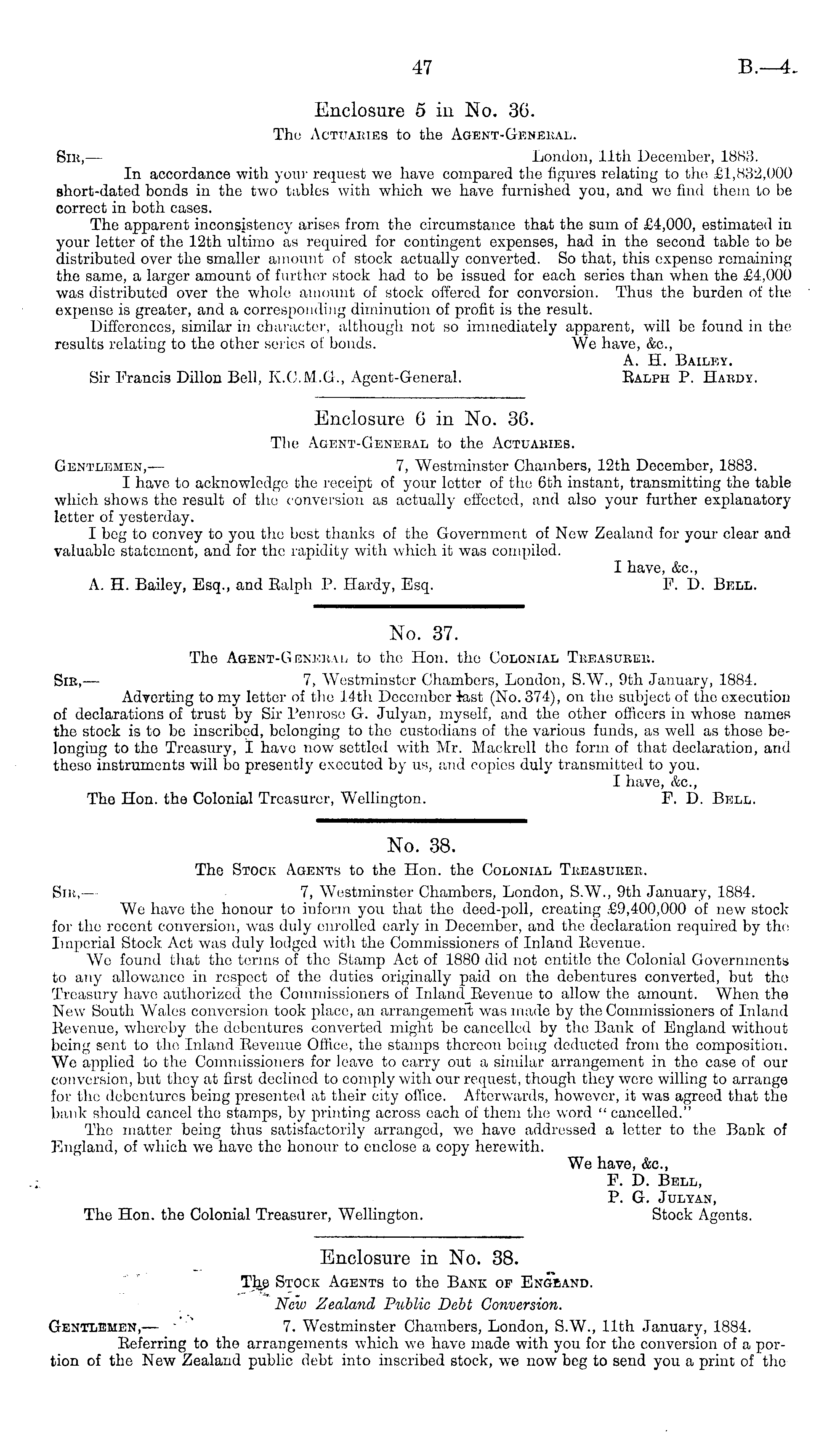 Enclosure in No. 38. The Stock Agents to the Bank op EncTband. Nciu Zealand Public Debt Conversion. Gentlemen, — * " 7. Westminster Chambers, London, S.W., 11th January, 1884. Eeferring to tho arrangements which we have made with you for the conversion of a portion of the New Zealand public debt into inscribed stock, we now beg to send you a print of tho