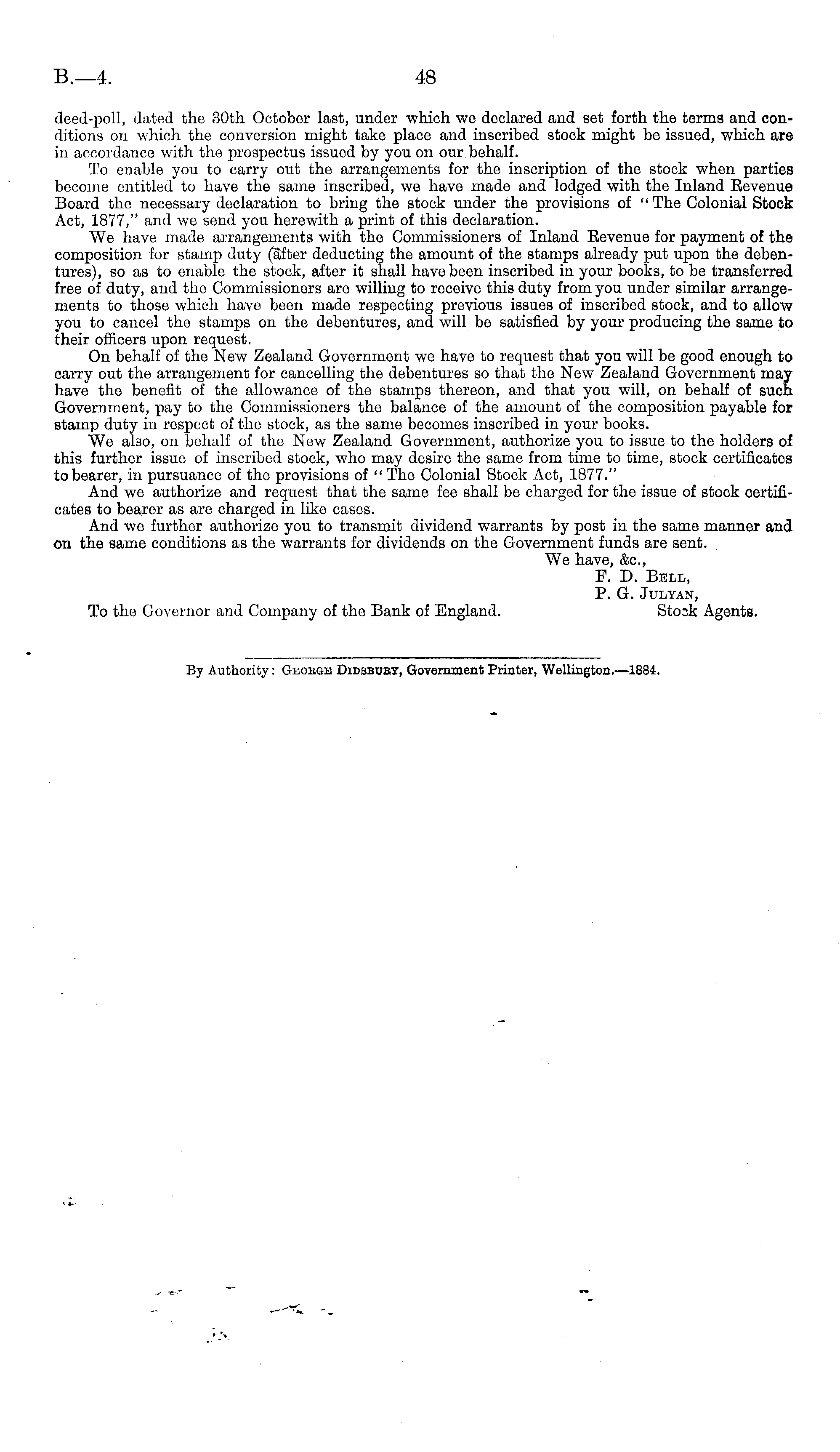 deed-poll, dated the 30th October last, under which we declared and set forth the terms and conditions on which the conversion might take place and inscribed stock might be issued, which are in accordance with the prospectus issued by you on our behalf. To enable you to carry out the arrangements for the inscription of the stock when parties become entitled to have the same inscribed, we have made and lodged with the Inland Eevenue JJoard the necessary declaration to bring the stock under the provisions of "The Colonial Stock Act, 1877," and we send you herewith a print of this declaration. We have made arrangements with the Commissioners of Inland Eevenue for payment of the composition for stamp duty (after deducting the amount of the stamps already put upon the debentures), so as to enable the stock, after it shall have been inscribed in your books, to be transferred free of duty, and the Commissioners are willing to receive this duty from you under similar arrangements to those which have been made respecting previous issues of inscribed stock, and to allow you to cancel the stamps on the debentures, and will be satisfied by your producing the same to their officers upon request. On behalf of the New Zealand Government wo have to request that you will be good enough to carry out the arrangement for cancelling the debentures so that the New Zealand Government may have the benefit of the allowance of the stamps thereon, and that you will, on behalf of such Government, pay to the Coimnissioners the balance of the amount of the composition payable for stamp duty in respect of the stock, as the same becomes inscribed in your books. We also, on behalf of the New Zealand Government, authorize you to issue to the holders of this further issue of inscribed stock, who may desire the same from time to time, stock certificates to bearer, in pursuance of the provisions of " The Colonial Stock Act, 1877." And we authorize and request that the same fee shall be charged for the issue of stock certificates to bearer as are charged in like cases. And we further authorize you to transmit dividend warrants by post in the same manner and on the same conditions as the warrants for dividends on the Government funds are sent. We have, &c, F. D. Bell, P. G. JULYAN, To the Governor and Company of the Bank of England. Stock Agents.