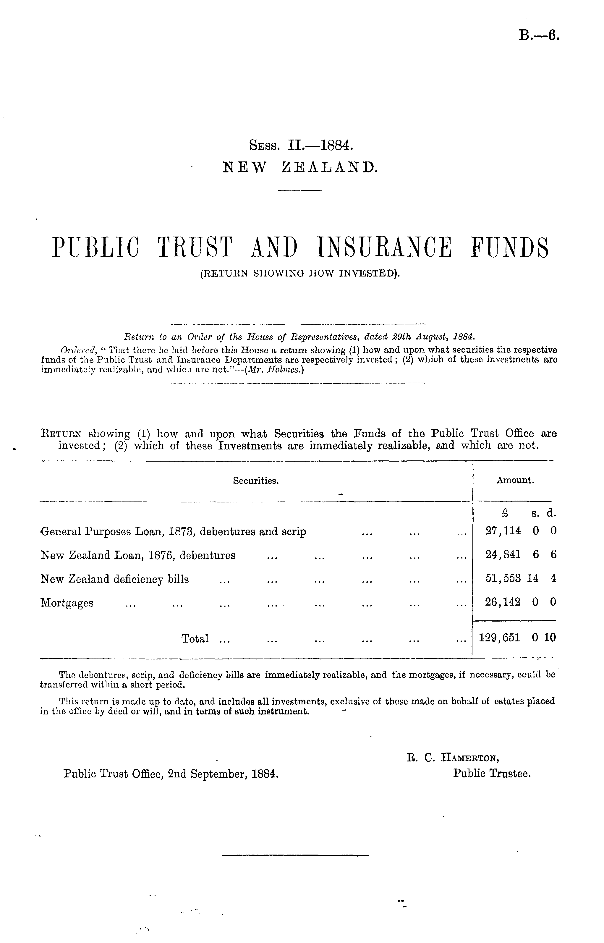 Return to an Order of the, House of Representatives, dated 29th August, 1884. Ordered, " That there bo laid beforo this House a return showing (1) how and upon what securities the respective funds of the Public Trust and Insurance Departments are respectively invested ; (2) which of these investments aro immediately realizable, and which are not."— (Mr. Holmes.)