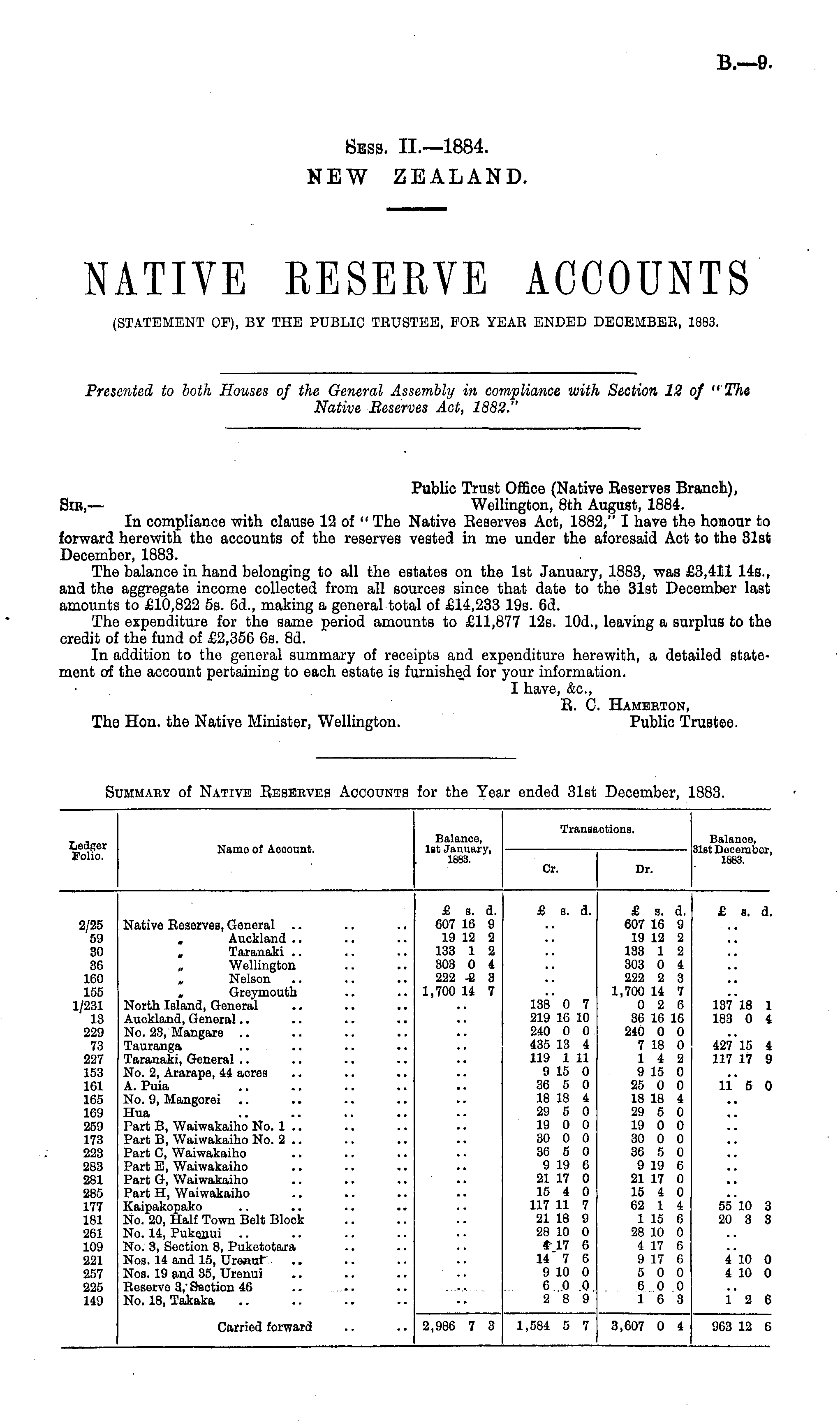 Public Trust Office (Native Beserves Branch), Sib,— Wellington, Bth August, 1884. In compliance with clause 12 of " The Native Reserves Act, 1882," I have the honour to forward herewith the accounts of the reserves vested in me under the aforesaid Act to the 31st December, 1883. The balance in hand belonging to all the estates on the Ist January, 1883, was £3,411 145., and the aggregate income collected from all sources since that date to the 31st December last amounts to £10,822 ss. 6d., making a general total of £14,233 19s. 6d. The expenditure for the same period amounts to £11,877 12s. 10d., leaving a surplus to the credit of the fund of £2,356 6s. Bd. In addition to the general summary of receipts and expenditure herewith, a detailed statement of the account pertaining to each estate is furnished for your information. I have, &c, E. C. Hameeton, The Hon. the Native Minister, Wellington. Public Trustee.
