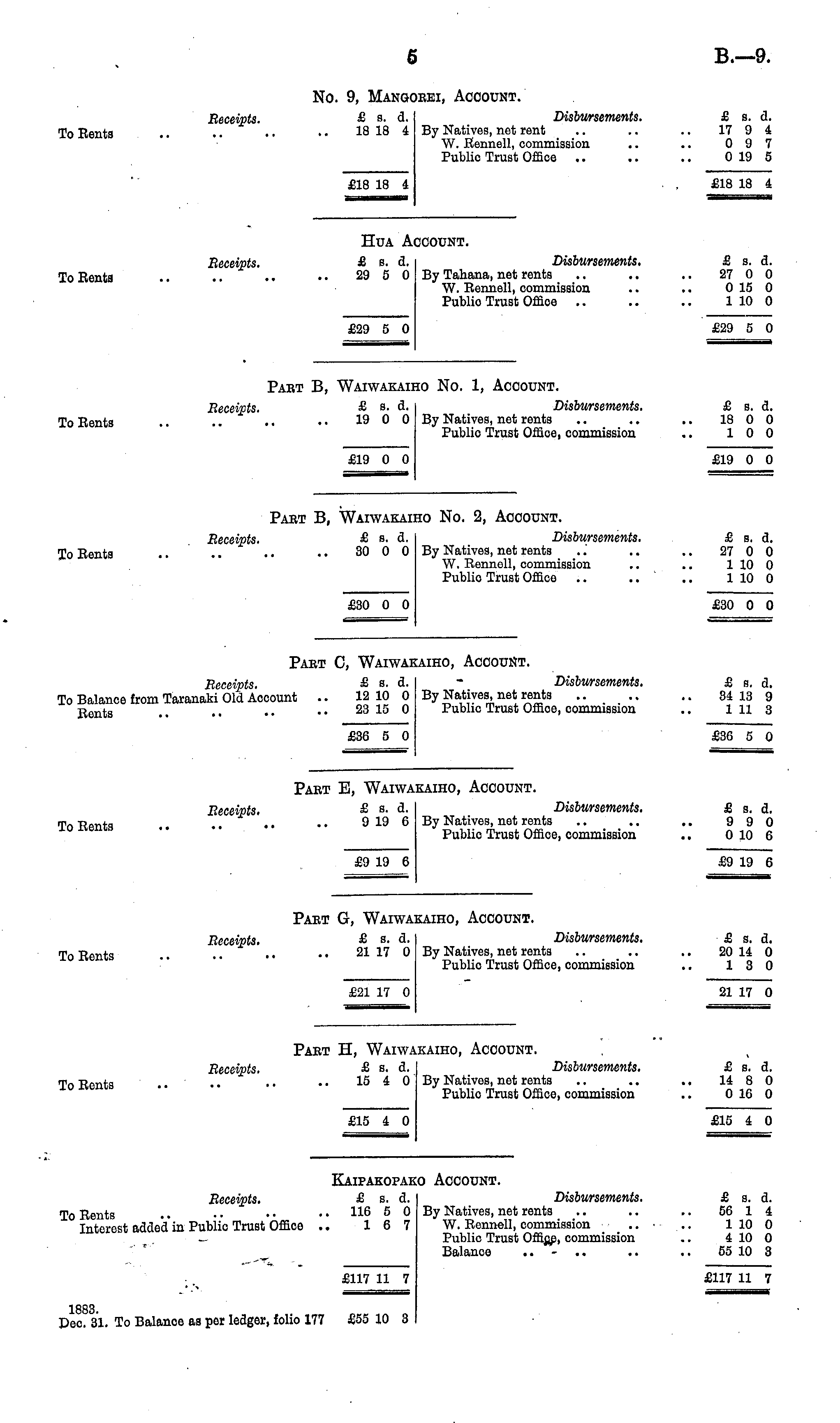 No. 9, Mangorei, Account. Receipts. £ s. d. Disbursements. £ s. d. To Eents • • 18 18 4 By Natives, net rent .. .. .. 17 9 4 W. B'enncll, commission .. .. 0 9 7 Public Trust Office 0 19 5 £18 18 4 . , £18 18 4 Hua Account. Receipts. £ s. d. Disbursements. £ s. d. To Bents • • • • 29 5 0 By Tahana, net rents .. .. .. 27 0 0 W. Eonnoll, commission .. .. 0 15 0 Public Trust Office .. .. .. 110 0 £29 5 0 £29 5 0 Pact B, Waiwakaiho No. 1, Account. Receipts. £ s. d. Disbursements. £ b. d. To Eents .. .. 19 0 0 By Natives, net rents .. .. .. 18 0 0 Public Trust Office, commission .. 10 0 £19 0 0 £19 0 0 Part B, Waiwakaiho No. 2, Account. Receipts. £"■ d. Disbursements. . £s. d. To Eents .. • • • • 30 00 By Nativos, net rents ..' .. .. 27 0 0 W. Eennell, commission .. .. 1 10 0 Public Trust Offico .. .. .. 110 0 £30 0 0 £30 0 0 Part C, Waiwakaiho, Account. Receipts. £ s. d. Disbursements. £ s. d. To Balance from Taranaki Old Account .. 12 10 0 By Nativos, not rents 34 13 9 ft ell t s .. 23 15 0 Public Trust Offico, commission .. 1113 £3C 5 0 £30 5 0 Pact E, Waiwakaiho, Account. Receipts. £ s. d. Disbursements. £ s. d. Tn ■Rfititq • • • • 919 C By Natives, not ronts .. .. .. 9 9 0 xv ««u. Public Trust Office, commission .. 0 10 6 £9 19 6 £9 19 6 Pact G, Waiwakaiho, Account. Receipts. £ s. d. Disbursements. £ s. d. To Bents • • • • • • 21 17 oBy Natives, not ronts .. .. .. 20 14 0 Public Trust Office, commission .. 13 0 £21 17 0 21 17 0 Pact H, Waiwakaiho, Account. Receipts. £ s. d. Disbursements. £ s. d. To Eents . • • • • • • ■ 15 40 By Natives, net rents .. .. .. 14 8 0 Public Trust Office, commission .. 0 16 0 £15 4 0 £15 4 0 Kaipakopako Account. Receipts. £ s. d. Disbursements. £ a. d. To Eents .. • • • • H6 5 0 By Natives, not rents .. .. .. 56 1 & Interest adde'd'in Public Trust Offico .. 16 7 W. Eennell, commission .. ■.. 110 0 _ Public Trust Offico, commission .. 4 10 0 Balance .. .. .. .. 55 10 3 «-* £117 11 7 £117 11 7 iono Dec. 81. To Balanco as per ledger, folio 177 £55 10 3