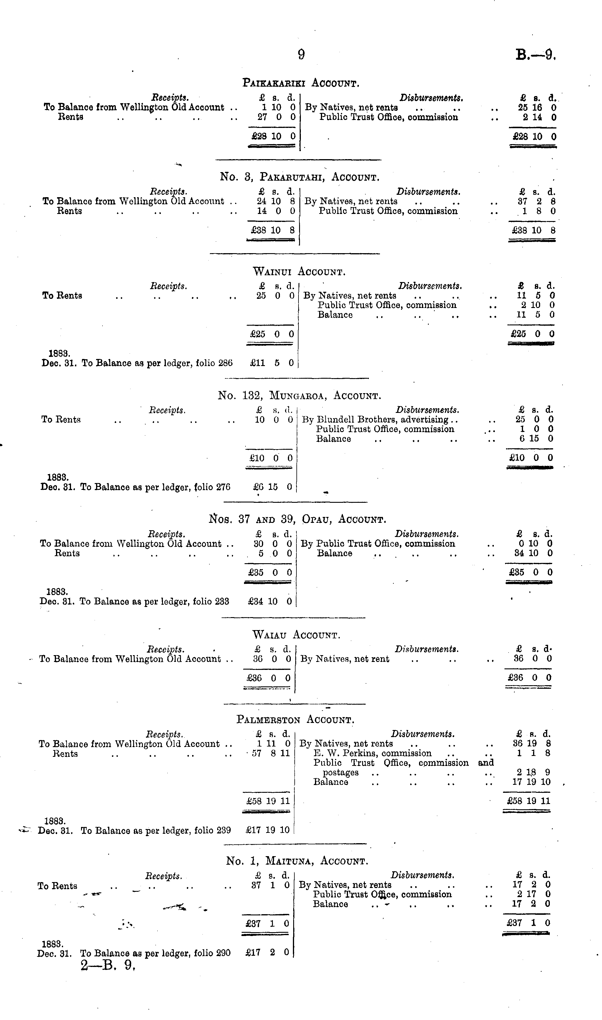 Paikakaeiki Account. Receipts. £ s. d. Disbursements. £ a. d. To Balance from Wellington Old Account .. 110 0 By Natives, net rents .. .. .. 25 16 0 Rents ~ .. .. .. 27 0 0 Public Trust Office, commission .. 214 0 £28 10 0 . £23 10 0 ,», - — No. 3, Pakaeutahi, Account. Receipts. £ s. d. Disbursements. £ s. d. To Balance from Wellington Old Account .. 24 10 8 By Natives, net rents .. .. .. 37 2 8 Rents .. .. .. .. 14 0 0 Public Trust Office, commission .. 18 0 £38 10 8 £38 10 8 Wainui Account. Receipts. £ I. d. Disbursements. £ s. d. To Rents .. .. .. .. 25 0 0 By Natives, net rents .. .. .. 115 0 Public Trust Office, commission .. 2 10 0 Balance .. .. .. .. 11 5 0 £25 0 0 £25 0 0 1883. Dec. 31. To Balance as per lodger, folio 286 £11 5 0 No. 132, Mungakoa, Account. Receipts. £ B. d, I Disbxirsements. £ s. d. To Rents .. ... .. .. 10 0 0 By BlurideU Brothers, advertising.. .. 25 0 0 Public Trust Office, commission ... 100 Balance .. .. .. .. 6 15 0 £10 0 0 £10 0 0 1883. Deo. 31. To Balance as per ledger, (olio 270 £0 15 0 Nos. 37 and 39, Opau, Account. Receipts. £ s. d. Disbursements. £ s. d. To Balance from Wellington Old Account .. 30 0 0 By Public Trust Office, commission .. 010 0 Rents .. .. .. .. 5 0 0 Balance .. .. .. .. 34 10 0 £35 0 0 £35 0 0 1883. Dec. 31. To Balance as per ledger, folio 233 £34 10 0 Waiau Account. Receipts. • £ s. d. Disbursements. £ s. dTo Balance from Wellington Old Account .. 86 0 0 By Natives, not rent .. .. .. 35 0 0 £86 0 0 £36 0 0 Palmeeston Account. Receipts. E s. d. Disbursements. £ s. d. To Balance from Wellington Old Account .. 111 0 By Natives, net rents .. .. .. 35 19 8 Kents .. .. .. ■ 57 811 E. W. Perkins, commission .. .. 118 Public Trust Office, commission and postages .. .. .. .. 218 9 Balance .. .. .. ..' 17 19 10 £58 19 11 £58 19 11 1883. Doc. 31. To Balance as per ledger, folio 239 £17 19 10 No. 1, Maituna, Account. Receipts. £ s. d. Disbursements. £ s. d. To Rents .. .. .. .. 37 1 0 By Natives, net rents .. .. .. 17 2 0 Public Trust Office, commission .. 2 17 0 Balance .. - .. .. .. 17 2 0 _:>, £37 1 0 £37 1 0 1883. Doc. 31. To Balance as per lodger, folio 290 £17 2 0 2—B. 9.
