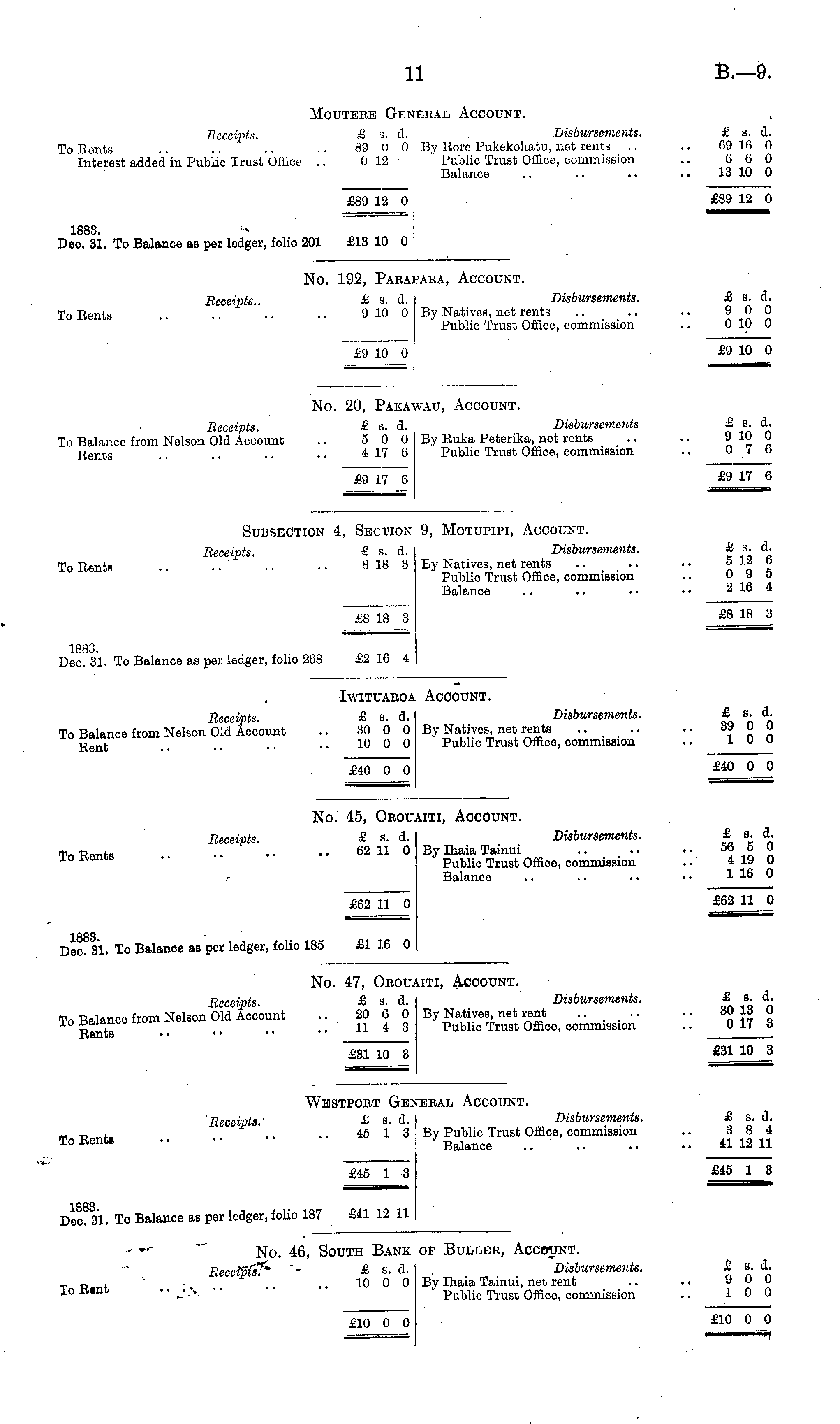 Mouteee General Account. Receipts. & s. cl. . Disbursements. £ s. d. To Runts .. .. .. .. 80 0 0 By Rore Pnkekohatu, net rents .. .. 09 I<> 0 Interest added in Public Trust Office .. 012 ' Public Trust Office, commission .. 6 0 0 Balance .. .. .. .. 13 10 0 £89 12 0 £89 12 0 1883. *• Deo. 31. To Balance as per ledger, folio 201 £13 10 0 No. 192, Paeapaea, Account. Receipts.. £ ». d. Disbursements. £ s. d. To Bents .. .. • • • • 9100 By Natives, net rents .. .. .. 90 0 Public Trust Office, commission .. 0 10 0 £9 10 0 £9 10 0 No. 20, Pakawau, Account. Receipts. £ s. d. Disbursements £ 8. d. To Balance from Nelson Old Account .. GO 0 By Kuka Petorika, net rents .. .. 910 0 Kents . • ■ • • • d 17 6 Public Trust Offico, commission .. 0 7 t> £9 17 6 £'■> 17 C Subsection 4, Section 9, Motupipi, Account. Receipts. & B. d. Disbursements. £ •• 3. To Rents • • HlB3 By Natives, net rents .. .. • • 512 '> Public Trust Office, commission .. 0 9 5 Balance .. .. . ■ ■ • 216 4 £8 18 g £8 18 a 1883. Dec. 81. To Balance as per ledger, folio 268 £2 16 4 •Iwituaeoa Account. Receipts. £ s. d. Disbursements. £ s. d. To Balance from Nelson Old Account .. 30 00 By Nativos, net rents .. .. .. 39 0 0 Ront .. .. 10 0 0 Public Trust Office, commission .. 10 0 £40 0 0 £40 o_o No. 45, Oeouaiti, Account. Receipts. £ s. d. Disbursements. £ I. &■ m -R o «* a .. •• 62 11 oBy Ihaia Tainui .. .. •■ ob 5 0 lo items Public Trust Offico, commission .. 4 19 0 Balance .. .. •■ •• 1 16 0 £62 11 0 £62_11_0 1883 Dec. 31. To Balance as per ledger, folio 185 £1 16 0 No. 47, Oeouaiti, Account. Receipts. £ S. d. Disbursements. £ «, d. To Balance from Nelson Old Account .. g6O By Natives, net .. 30 13 0 £31 10 3 £31 10 3 Wbstpoet Geneeal Account. Receipts.' £ s. d. Disbursements. £ s. d. „ .. 45 1 3 By Public Trust Office, commission .. 3 8 4 ToKentg Balance *1 12 11 £45 1 3 £45 1 3 Dec 31. To Balance as per ledger, folio 187 £41 12 11 No. 46, South Bank op Bullee, Account. IleceipfsT- & s. d. . Disbursements. £ ». d. „ , 10 00 By Ihaia Tainui, net ront .. .. 90 0 i 0 tt%nl Public Trust Office, commission .. 10 0 £io o o £io o o