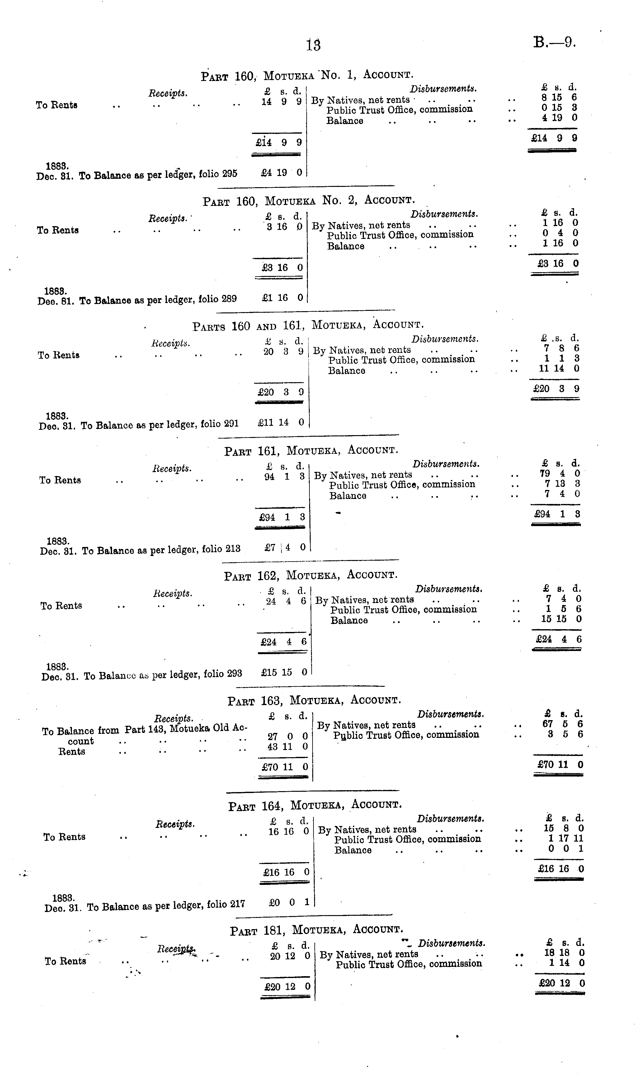 Pabt 160, Motubka No. 1, Account. Receipts. £ b. i Disbursement*. £ s_ d. Tv c-t. 14 9 9 By Natives, net ronts •.. ■ • • • Bid t> 10 norms .. •• Public Trust Office, commission .. 0 15 3 Balance * *9 ° £14 9 9 £U 9 9 Dec. 81. To Balance as per ledger, folio 295 £4 19 0 Pact 160, Motueka No. 2, Account. !■,„■_,, . £ a d Disbursements. £ s. d. Receipts, a s. v. 1 ir n To Rents • • • • 316(I By Natives, net ronts .... .. Ilb O lo wents .. • • Public Trust Office, commission .. 0 4 0 Balance .. •• •■ •• 1 16 ° £3 16~0 £3 16 ° 1883 Dee. 81. To Balance as per ledger, folio 289 £1 16 0 Pakts 160 and 161, Motueka, Account. Receipts. Bt. i. . Disbursements. i !.«. d. T R , .. .. 20 39 By Natives, net rents .. .. • • 78 6 loWents .. •■ Public Trust Offico, commission .. 113 Balance .. .. •• •• 11 14 0 £20 3 9 . £20 3 9 IRRT Deo. 81. To Balance as per ledger, folio 291 £11 14 0 Pact 161, Motueka, Account. Receipts £ s> d- Disbursements. £ s. d. _ r, , 94 1 3 By Natives, net rents .. .. .. T9 4 0 lo itencs .. • • Public Trust Office, commission .. 713 3 Balance .. .. ... •■ 7 4 0 £94 1 8 " £^ 1 3 Dec. 81. To Balance as per ledger, folio 213 £7 i 4 0 Pabt 162, Motueka, Account. Receipts. £ I. i . Disbursements. £ s d m _ , 24 4 G By Natives, net ronts .. .. .. 7 4 0 lo itenis .. Public Trust Office, commission .. 15 6 Balance .. .. .. • • 15 15 0 £24 4 6* £24 4 6 r Dec. 31. To Balance as per ledger, folio 293 £15 15 0 Part 163, Motueka, Account. Receipts £ s. d. Disbursements. £ s. d. To Balance from Part 143, Motueka Old Ac- By commission " 11 6 ReX* :: ;: :: '■■ j^_^ £70 11 0 £70 11 0 Pabt 164, Motueka, Account. n ■ i £ s d Disbursements. £ s. d. „ „ Receipts. By Natives? net ren ts 15 8 0 To Bents .. • • Public Trust Office, commission .. 117 11 Balance .. .. •• •• 0 0 1 £16 16 0 . £16 16 ° Deo. 31. To Balance as per ledger, folio 217 £0 0 1 Pabt 181, Motueka, Account. _ . , £s d "*- Disbursements. £s. d. _ _ hecetpts. 20 12 0 By Natives, net rents 18 18 0 To Bents .. •• Public Trust Office, commission .. 1 14 0 £20 12 0 ■ £20>2 0