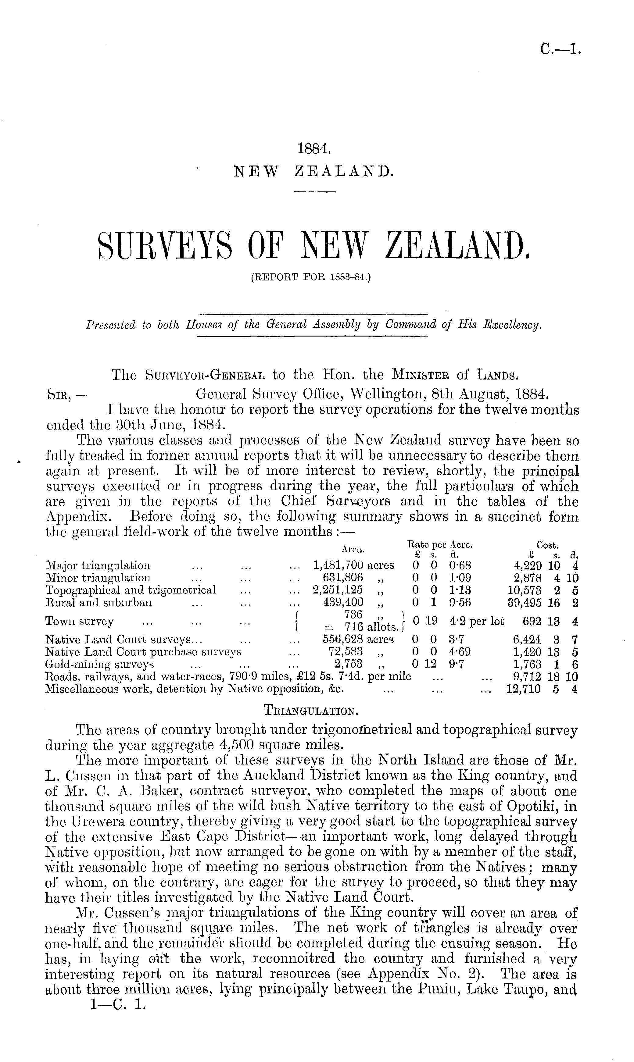The Surveyor-General to the Hon. the Minister of Lands. Sir,— General Survey Office, Wellington, Bth August, 1884. I have the honour to report the survey operations for the twelve months ended the 30th June, 1884. The various classes and processes of the New Zealand survey have been so fully treated in former annual reports that it will be unnecessary to describe them again at present. It will be of more interest to review, shortly, the principal surveys executed or in progress during the year, the full particulars of which are given in the reports of the Chief Surveyors and in the tables of the Appendix. Before doing so, the following summary shows in a succinct form the general field-work of the twelve months :— a,.,, Rate per Acre. Cost. Alea- s, s. a. & s. d. Major triangulation ... ... ... 1,481,700 acres 0 0 0-68 4,229 10 4 Minor triangulation ... ... ... 631,806 „ 0 0 1-09 2,878 4 10 Topographical and trigoinetrical ... ... 2,251,125 „ 0 0 1-13 10,573 2 5 Eural and suburban ... ... ... 439,400 „ 0 1 9-56 39,495 16 2 Town survey ... ... ... 716 allots 1° 19 4' 2 per lot 692 13 4 Native Land Court surveys... ... ... 556,628 acres 0 0 3-7 6,424 3 7 Native Land Court purchase surveys ... 72,583 „ 0 0 4-69 1,420 13 5 Gold-mining surveys ... ... ... 2,753 „ 012 9-7 1,763 1 6 Eoads, railways, and water-races, 790-9 miles, £12 ss. 7'4d. per mile ... ... 9,712 18 10 Miscellaneous work, detention by Native opposition, &c. ... ... ... 12,710 5 4 Triangulation. The areas of country brought under trigonometrical and topographical survey during the year aggregate 4,500 square miles. The more important of these surveys in the North Island are those of Mr. L. Cussen in that part of the Auckland District known as the King country, and of Mr. C. A. Baker, contract surveyor, who completed the maps of about one thousand square miles of the wild bush Native territory to the east of Opotiki, in the Urewera country, thereby giving a very good start to the topographical survey of the extensive East Cape District —an important work, long delayed through Native opposition, but now arranged to be gone on with by a member of the staff, with reasonable hope of meeting no serious obstruction from the Natives; many of whom, on the contrary, are eager for the survey to proceed, so that they may have their titles investigated by the Native Land Court. Mr. Cussen's major triangulations of the King country will cover an area of nearly five' thousand square miles. The net work of triangles is already over one-half, and the remainder should be completed during the ensuing season. He has, in laying eiit the work, reconnoitred the country and furnished a very interesting report on its natural resources (see Appendix No. 2). The area is about three million acres, lying principally between the Puniu, Lake Taupo, and I—C. 1.