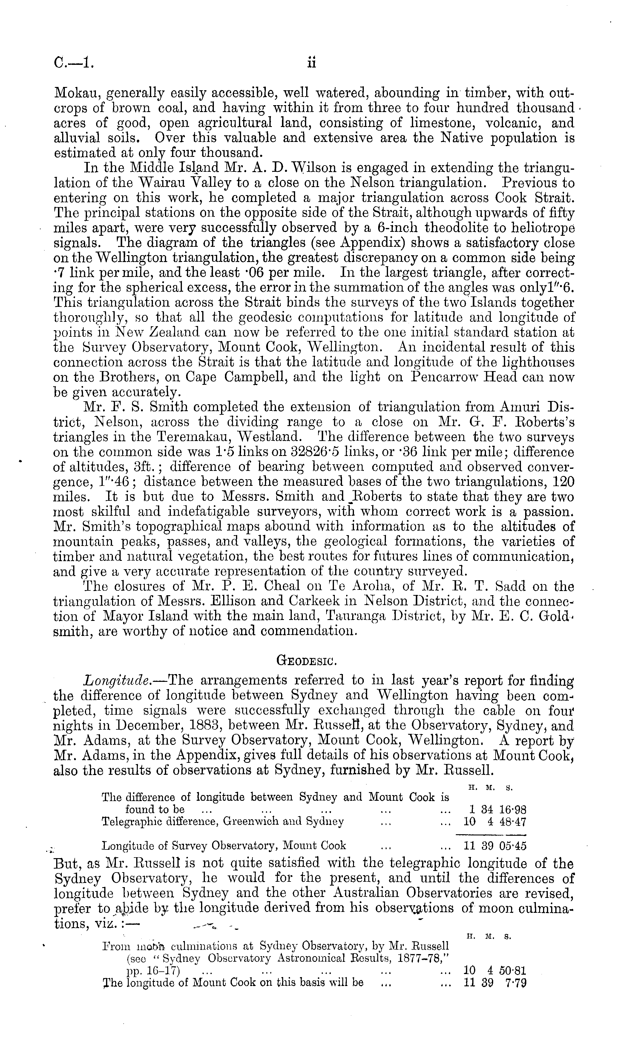 Mokau, generally easily accessible, well watered, abounding in timber, with outcrops of brown coal, and having within it from three to four hundred thousand acres of good, open agricultural land, consisting of limestone, volcanic, and alluvial soils. Over this valuable and extensive area the Native population is estimated at only four thousand. In the Middle Island Mr. A. D. Wilson is engaged in extending the triangulation of the Wairau Valley to a close on the Nelson triangulation. Previous to entering on this work, he completed a major triangulation across Cook Strait. The principal stations on the opposite side of the Strait, although upwards of fifty miles apart, were very successfully observed by a 6-inch theodolite to heliotrope signals. The diagram of the triangles (see Appendix) shows a satisfactory close on the Wellington triangulation, the greatest discrepancy on a common side being '7 link per mile, and the least "06 per mile. In the largest triangle, after correcting for the spherical excess, the error in the summation of the angles was onlyl" #6. This triangulation across the Strait binds the surveys of the two Islands together thoroughly, so that all the geodesic computations for latitude and longitude of points in New Zealand can now be referred to the one initial standard station at the Survey Observatory, Mount Cook, Wellington. An incidental result of this connection across the Strait is that the latitude and longitude! of the lighthouses on the Brothers, on Cape Campbell, and the light on Pencarrow Head can now be given accurately. Mr. F. S. Smith completed the extension of triangulation from Amuri District, Nelson, across the dividing range to a close on Mr. G. F. Koberts's triangles in the Teremakau, Westland. The difference between the two surveys on the common side was I*s links on 32826-5 links, or "36 link per mile; difference of altitudes, 3ft.; difference of bearing between computed and observed convergence, 1"'46 ; distance between the measured bases of the two triangulations, 120 miles. It is but due to Messrs. Smith and_Roberts to state that they are two most skilful and indefatigable surveyors, with whom correct work is a passion. Mr. Smith's topographical maps abound with information as to the altitudes of mountain peaks, passes, and valleys, the geological formations, the varieties of timber and natural vegetation, the best routes for futures lines of communication, and give a very accurate representation of the country sxirveyed. The closures of Mr. P. E. Cheal on Te Aroha, of Mr. K. T. Sadd on the triangulation of Messrs. Ellison and Carkeek in Nelson District, and the connection of Mayor Island with the main land, Tauranga District, by Mr. E. C. Goldsmith, are worthy of notice and commendation. Geodesic. Longitude. —The arrangements referred to in last year's report for finding the difference of longitude between Sydney and Wellington having been completed, time signals were successfully exchanged through the cable on four nights in December, 1883, between Mr. RusseH, at the Observatory, Sydney, and Mr. Adams, at the Survey Observatory, Mount Cook, Wellington. A report by Mr. Adams, in the Appendix, gives full details of his observations at Mount Cook, also the results of observations at Sydney, furnished by Mr. Russell. H. M. S. Tho difference of longitude between Sydney and Mount Cook is found to be ... ... ... ... ... 134 16-98 Telegraphic difference, Greenwich and Sydney ... ... 10 4 48-47 Longitude of Survey Observatory, Mount Cook ... ... 11 39 05-45 But, as Mr. Russell is not quite satisfied with the telegraphic longitude of the Sydney Observatory, he would for the present, and until the differences of longitude between Sydney and the other Australian Observatories are revised, prefer to abide by the longitude derived from his observations of moon culminations, viz.:— a. m. s. From maoh culminations at Sydney Observatory, by Mr. Eussell (see " Sydney Observatory Astronomical Bcsults, 1877-78," pp. 16-17) ... ... ... ... ... 10 4 50-81 The longitude of Mount Cook on this basis will be ... ... 11 39 7-79
