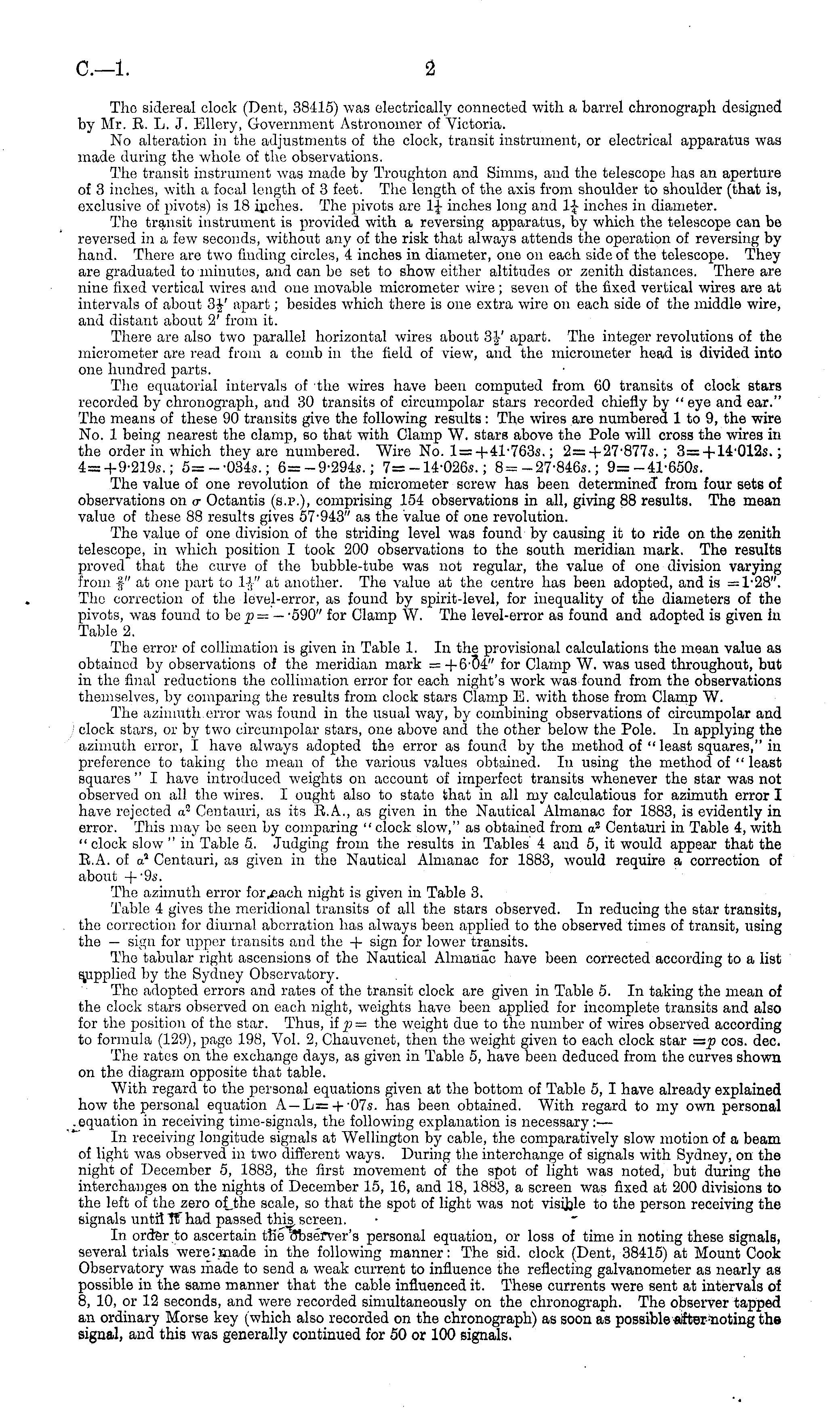 The sidereal clock (Dent, 38415) was electrically connected with a barrel chronograph designed by Mr. R. L. J. Ellery, Government Astronomer of Victoria. No alteration in the adjustments of the clock, transit instrument, or electrical, apparatus was made during the whole of the observations. The transit instrument was made by Troughton and Simrns, and the telescope has an aperture of 3 inches, with a focal length of 3 feet. The length of the axis from shoulder to shoulder (that is, exclusive of pivots) is 18 inches. The pivots are 1|- inches long and 1J inches in diameter. The transit instrument is provided with a reversing apparatus, by which the telescope can be reversed in a few seconds, without any of the risk that always attends the operation of reversing by hand. There are two finding circles, 4 inches in diameter, one on each side of the telescope. They are graduated to minutes, and can be set to show either altitudes or zenith distances. There are nine fixed vertical wires and one movable micrometer wire ; seven of the fixed vertical wires are at intervals of about 3J' apart; besides which there is one extra wire on each side of the middle wire, and distant about 2' from it. There are also two parallel horizontal wires about 3-J-' apart. The integer revolutions of the micrometer are read from a comb in the field of view, and the micrometer head is divided into one hundred parts. The equatorial intervals of the wires have been computed from 60 transits of clock stars recorded by chronograph, and 30 transits of circumpolar sta.rs recorded chiefly by " eye and ear." The means of these 90 transits give the following results: The wires are numbered Ito 9, the wire No. 1 being nearest the clamp, so that with Clamp W. stars above the Pole will cross the wires in the order in which they are numbered. Wire No. l=+4l-7635.; 2=+27>8775.; 3=+14'0125.; 4=+9-219,5.; s=--0345.; 6=-9-2945.; 7=-14-026.5.; B=-27-8465.; 9=-41-6505. The value of one revolution of the micrometer screw has been determined" from four sets of observations on o- Octantis (s.i\), comprising 154 observations in all, giving 88 results. The mean value of these 88 results gives 57-943" as the value of one revolution. The value of one division of the striding level was found by causing it to ride on the zenith telescope, in which position I took 200 observations to the south meridian mark. The results proved that the curve of the bubble-tube was not regular, the value of one division varying from -f" at one part to I-.'/' at another. The value at the centre has been adopted, and is =l-28". The correction of the level-error, as found by spirit-level, for inequality of the diameters of the pivots, was found to be p= — '590" for Clamp W. The level-error as found and adopted is given in Table 2. The error of collimation is given in Table 1. In the provisional calculations the mean value as obtained by observations of the meridian mark =+6-04" for Clamp W. was used throughout, but in the final reductions the collimation error for each night's work was found from the observations themselves, by comparing the results from clock stars Clamp E. with those from Clamp W. The azimuth error was found in the usual way, by combining observations of circumpolar and clock stars, or by two circumpolar stars, one above and the other below the Pole. In applying the azimuth error, I have always adopted the error as found by the method of "least squares," in preference to taking the mean of the various values obtained. In using the method of " least squares " I have introduced weights on account of imperfect transits whenever the star was not observed on all the wires. I ought also to state that in all my calculatious for azimuth error I have rejected a" Contauri, as its R.A., as given in the Nautical Almanac for 1883, is evidently in error. This may be seen by comparing " clock, slow," as obtained from a" Centauri in Table 4, with "clock slow" in Table 5. Judging from the results in Tables 4 and 5, it would appear that the E.A. of a" Centauri, as given in the Nautical Almanac for 1883, would require a correction of about +-9s. The azimuth error for^ach night is given in Table 3. Table 4 gives the meridional transits of all the stars observed. In reducing the star transits, the correction for diurnal aberration has always been applied to the observed times of transit, using the — sign for upper transits and the + sign for lower transits. The tabular right ascensions of the Nautical Almauac have been corrected according to a list supplied by the Sydney Observatory. The adopted errors and rates of the transit clock are given in Table 5. In taking the mean of the clock stars observed on each night, weights have been applied for incomplete transits and also for the position of the star. Thus, if p~ the weight due to the number of wires observed according to formula (129), page 198, Vol. 2, Chauvenot, then the weight given to each clock star ==p cos. dec. The rates on the exchange days, as given in Table 5, have been deduced from the curves shown on the diagram opposite that table. With regard to the personal equations given at the bottom of Table 5, I have already explained how the personal equation A—L= + -07s. has been obtained. With regard to my own personal equation in receiving time-signals, the following explanation is necessary : — In receiving longitude signals at Wellington by cable, the comparatively slow motion of a beam of light was observed in two different ways. During the interchange of signals with Sydney, on the night of December 5, 1883, the first movement of the spot of light was noted, but during the interchanges on the nights of December 15, 16, and 18, 1883, a screen was fixed at 200 divisions to the left of the zero of the scale, so that the spot of light was not visible to the person receiving the signals until it had passed this screen. In order to ascertain the 'observer's personal equation, or loss of time in noting t