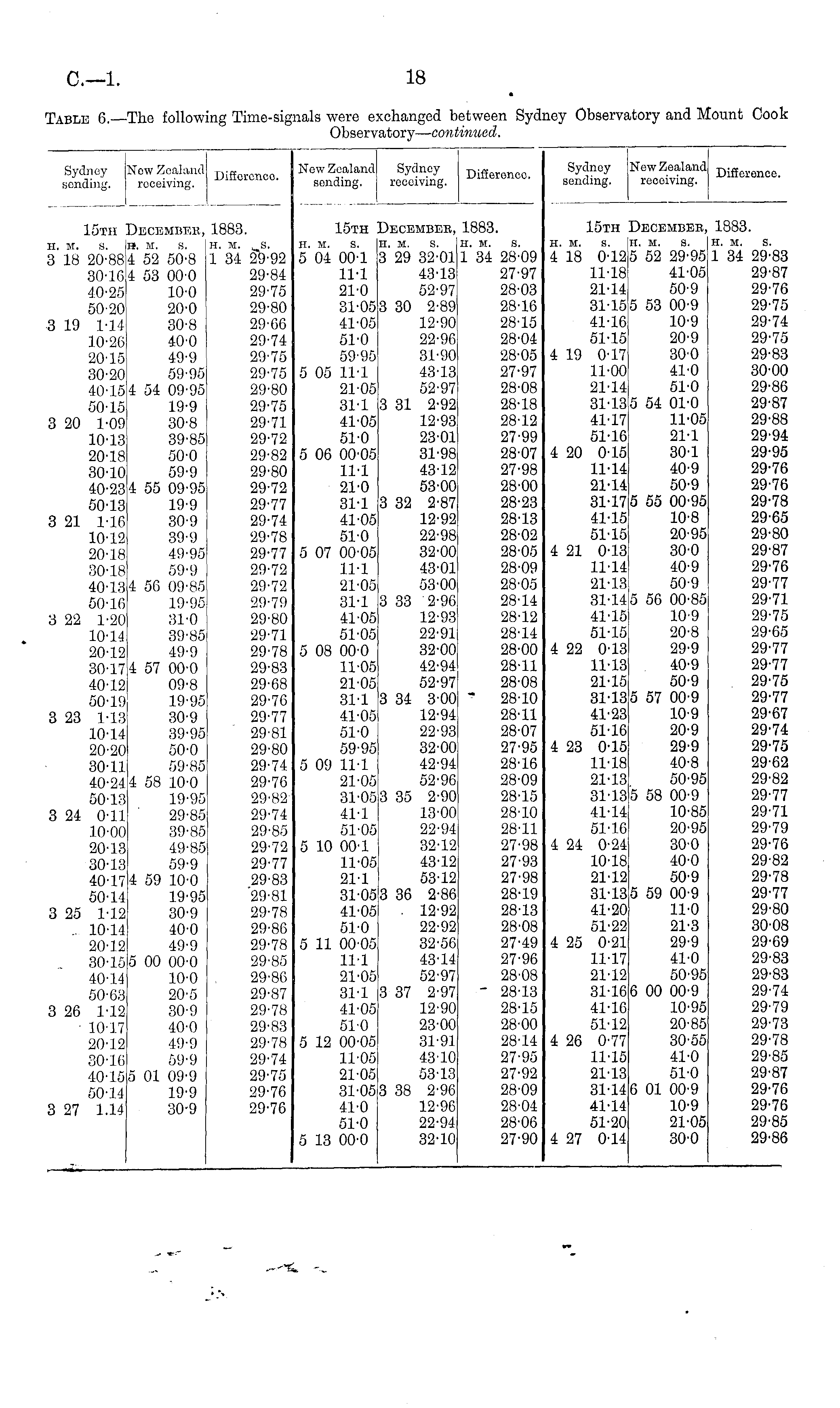 Sydney ! sending. Now Zealand DifforMloo# receiving. New Zealand sending. Sydney DifferGnco _ receiving. Sydney sending. New Zealand receiving. Difference. 15th ! a. m. s. 3 18 20-88 30-16 40-25 50-20 3 19 1-14 10-26 20-15 30-20 40-15 50-15 3 20 1-09 10-13 20-18 30-10 40-23 50-13 3 21 1-16 10-12 20-18 30-18 40-13 50-16 3 22 1-20 10-14 20-12 30-17 40-12 50-19 3 23 113 10-14 20-20 30-11 40-24 50-13 3 24 0-11 10-00 20-13 30-13 40-17 50-14 3 25 1-12 _ 10-14 20-12 _ 30-15 40-14 50-63 3 26 1-12 —10-17 20-12 30-16 40-15 50-14 3 27 1.14 December, 1883. H. M. S. H. M. S. 4 52 50-8 1 34 29-92 4 53 00-0 29-84 10-0 29-75 20-0 29-80 30-8 29-66 40-0 29-74 49-9 29-75 59-95 29-75 4 54 09-95 29-80 19-9 29-75 30-8 29-71 39-85 29-72 50-0 29-82 i 59-9 29-80 4 55 09-95 29-72 ; 19-9 29-77 30-9 29-74 ! 39-9 29-78 i 49-95 29-77 i 59-9 29-72 ,4 56 09-85 29-72 19-95 29-79 i 31-0 29-80 39-85 29-71 49-9 29-78 4 57 00-0 29-83 1 09-8 29-68 i 19-95 29-76 ; 30-9 29-77 39-95 29-81 I 50-0 29-80 59-85 29-74 4 58 10-0 29-76 i 19-95 29-82 29-85 29-74 i 39-85 29-85 i 49-85 29-72 i 59-9 29-77 4 59 10-0 29-83 19-95 "29-81 ! 30-9 29-78 40-0 29-86 ! 49-9 29-78 5 00 00-0 29-85 10-0 , 29-86 20-5 29-87 30-9 29-78 40-0 29-83 49-9 29-78 59-9 29-74 5 01 09-9 29-75 19-9 29-76 30-9 29-76 15th ! II. II. S. 5 04 00-1 11-1 21-0 31-05 41-05 51-0 59-95 5 05 11-1 21-05 31-1 41-05 51-0 5 06 00-05 11-1 21-0 31-1 41-05 51-0 5 07 00-05 11-1 21-05 31-1 41-05 51-05 5 08 00-0 11-05 21-05 31-1 41-05 51-0 59-95 5 09 11-1 21-05 31-05 41-1 51-05 5 10 00-1 11-05 21-1 31-05 41-05 51-0 5 11 00-05 11-1 21-05 31-1 41-05 51-0 5 12 00-05 11-05 21-05 31-05 41-0 51-0 5 13 00-0 December, II. M. S. 3 29 32-01 43-13 52-97 3 30 2-89 12-90 22-96 31-90 43-13 52-97 3 31 2-92 12-93 23-01 31-98 43-12 53-00 3 32 2-87 12-92 22-98 32-00 43-01 53-00 3 33 2-96 12-93 22-91 32-00 42-94 52-97 3 34 3-00 12-94 22-93 32-00 42-94 52-96 3 35 2-90 13-00 22-94 32-12 43-12 53-12 3 36 2-86 . 12-92 22-92 32-56 43-14 52-97 3 37 2-97 12-90 23-00 31-91 43-10 53-13 3 38 2-96 12-96 22-94 32-10 1883. H. M. S. 1 34 28-09 27-97 28-03 28-16 28-15 28-04 28-05 27-97 28-08 28-18 28-12 27-99 28-07 27-98 28-00 28-23 28-13 28-02 28-05 28-09 28-05 28-14 28-12 28-14 28-00 28-11 28-08 " 28-10 28-11 28-07 27-95 28-16 28-09 28-15 28-10 28-11 27-98 27-93 27-98 28-19 2813 28-08 27-49 27-96 28-08 - 28-13 28-15 28-00 28-14 27-95 27-92 28-09 28-04 28-06 27-90 15th II. M. S. 4 18 0-12 11-18 21-14 31-15 41-16 51-15 4 19 0-17 11-00 21-14 31-13 41-17 51-16 4 20 0-15 11-14 21-14 31-17 41-15 51-15 4 21 0-13 11-14 21-13 31-14 41-15 51-15 4 22 0-13 11-13 21-15 31-13 41-23 51-16 4 23 0-15 11-18 21-13 31-13 41-14 51-16 4 24 0-24 10-18 21-12 31-13 41-20 51-22 4 25 0-21 11-17 21-12 31-16 41-16 51-12 4 26 0-77 11-15 21-13 31-14 41-14 51-20 4 27 0-14 December, II. M. S. 5 52 29-95 41-05 50-9 5 53 00-9 10-9 20-9 30-0 41-0 51-0 5 54 01-0 11-05 21-1 301 40-9 50-9 5 55 00-95 10-8 20-95 30-0 40-9 50-9 5 56 00-85 10-9 20-8 29-9 40-9 50-9 5 57 00-9 10-9 20-9 29-9 40-8 50-95 5 58 00-9 10-85 20-95 30-0 40-0 50-9 5 59 00-9 i 11-0 21-3 29-9 41-0 50-95 6 00 00-9 10-95 20-85 30-55 41-0 51-0 6 01 00-9 10-9 21-05 30-0 1883. H. M. S. 1 34 29-81 29-8' 29-71 29-7; 29-7-29-7; 29-8; 30-0( 29-81 29-8' 29-8i 29-9-29-9; 29-71 29-71 29-71 29-6; 29-81 29-8' 29-71 29-7' 29-7: 29-7; 29-6; 29-7' 29-7' 29-7J 29-7' 29-6' 29-7' 29-7J 29-6! 29-8! 29-7' 29-7! 29-7! 29-71 29-8! 29-71 29-7' 29-81 30-0! 29-6' 29-8; 29-8: 29-7' 29-7! 29-7: 29-7! 29-8; 29-8' 29-71 29-71 29-8i 29-81
