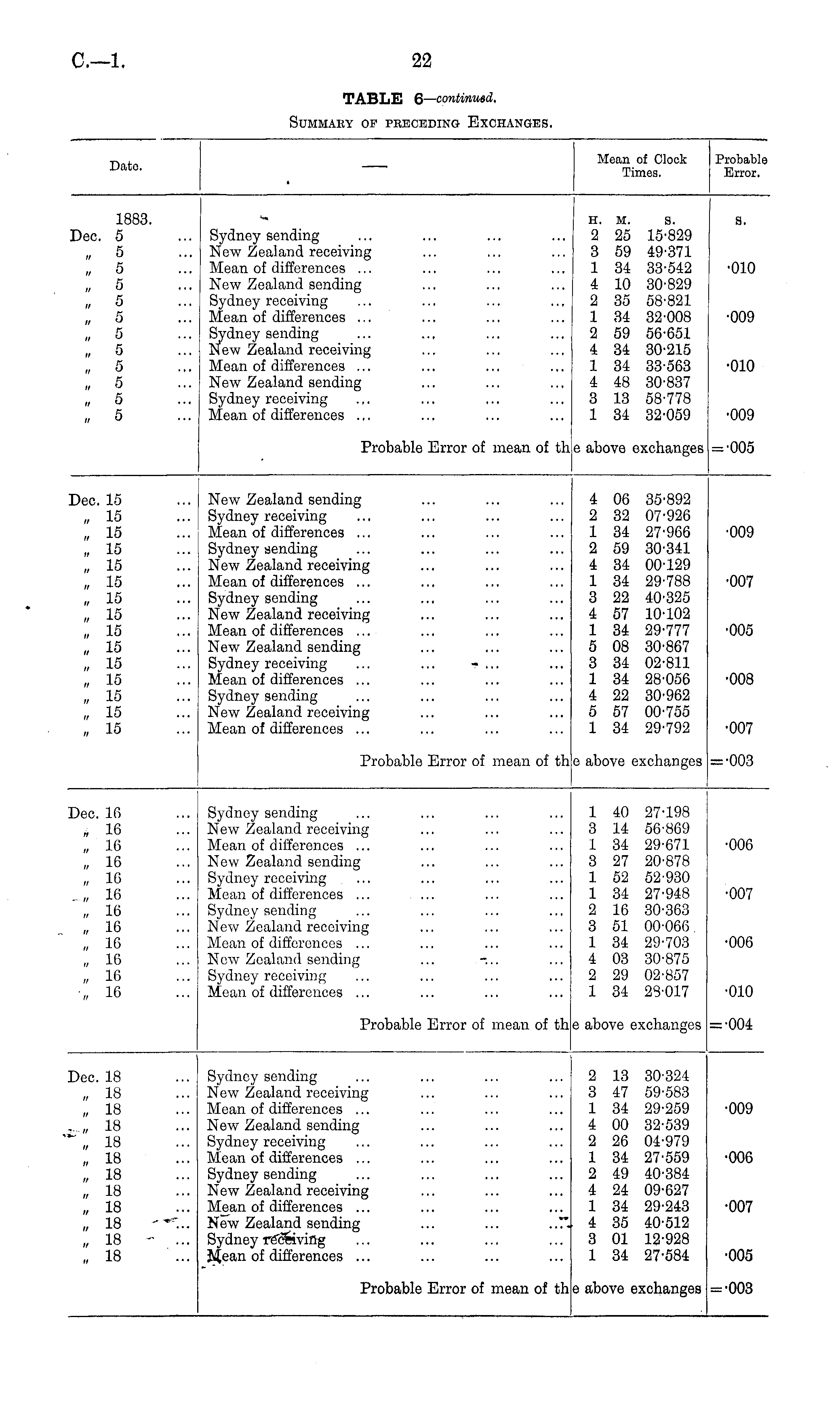 Date. Mean of Clock Times. Probable Error. 1883. Dec. 5 . 5 . 5 . 5 ■ 5 . 5 . 5 . 5 . 5 » 5 „ 5 » 5 Sydney sending New Zealand receiving Mean of differences ... New Zealand sending Sydney receiving Mean of differences ... Sydney sending New Zealand receiving Mean of differences ... New Zealand sending Sydney receiving Mean of differences ... H. M. S. 2 25 15'829 3 59 49-371 1 34 33-542 4 10 30-829 2 35 58-821 1 34 32-008 2 59 56-651 4 34 30-215 1 34 33-563 4 48 30-837 3 13 58-778 1 34 32-059 s. •010 •009 ■010 •009 Probable Error of mean of th o above exchanges = •005 iec. 15 „ 15 „ 15 „ 15 ■ 15 . 15 „ 15 „ 15 . 15 . 15 . 15 „ 15 . 15 ■ 15 ■ 15 New Zealand sending Sydney receiving Mean of differences ... Sydney sending New Zealand receiving Mean of differences ... Sydney sending New Zealand receiving Mean of differences ... New Zealand sending Sydney receiving ... ... - ... Mean of differences ... Sydney sending New Zealand receiving Mean of differences ... 4 06 35-892 2 32 07-926 1 34 27-966 2 59 30-341 4 34 00-129 1 34 29-788 3 22 40-325 4 57 10-102 1 34 29-777 5 08 30-867 3 34 02-811 1 34 28-056 4 22 30-962 5 57 00-755 1 34 29-792 •009 •007 •005 •008 •007 Probable Error of mean of th e above exchanges = •003 Dec. lfi I 16 „ 16 „ 16 » 16 „ 16 . 16 ■ 16 . 16 . 16 „ 16 I 16 Sydney sending New Zealand receiving Mean of differences ... New Zealand sending Sydney receiving Mean of differences ... Sydney sending New Zealand receiving Mean of differences ... New Zealand sending Sydney receiving Mean of differences ... 1 40 27-198 3 14 56-869 1 34 29-671 3 27 20-878 1 52 52-930 1 34 27-948 2 16 30-363 3 51 00-066 1 34 29-703 4 03 30-875 2 29 02-857 1 34 23-017 •006 •007 •006 •010 Probable Error of mean of th e above exchanges = •004 Dec. 18 ■ 18 ■ 18 „ 18 I 18 . 18 . 18 ■ 18 . 18 • 18 . 18 ■ 18 Sydney sending New Zealand receiving Mean of differences ... New Zealand sending Sydney receiving Mean of differences ... Sydney sending New Zealand receiving Mean of differences ... New Zealand sending ... ... .." Sydney receiving Mean of differences ... 2 13 30-324 8 47 59-583 1 34 29-259 4 00 32-539 2 26 04-979 1 34 27-559 2 49 40-384 4 24 09-627 1 34 29-243 4 35 40-512 3 01 12-928 1 34 27-584 •009 •006 •007 •005 Probable Error of mean of th o above exchanges = •003
