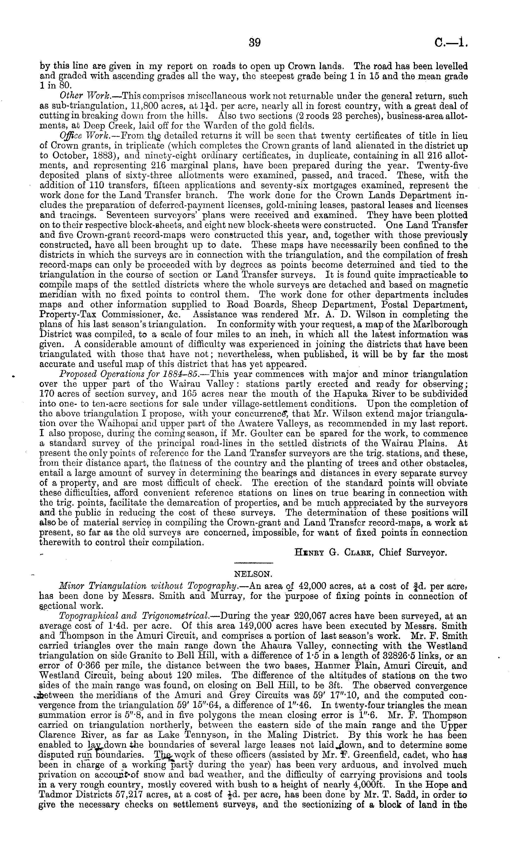 by this lino are given in my report on roads to open up Crown lands. The road has been levelled and graded with ascending grades all the way, the steepest grade being 1 in 15 and the mean grade 1 in 80. Other Work. —This comprises miscellaneous work not returnable under the general return, such as sub-triangulation, 11,800 acres, at ljd. per acre, nearly all in forest country, with a great deal of cutting in breaking down from the hills. Also two sections (2 roods 23 perches), business-area allotments, at Deep Creek, laid off for the Warden of the gold fields. Office Work. —From tl^e detailed returns it will be seen that twenty certificates of title in lieu of Crown grants, in triplicate (which completes the Crown grants of land alienated in the district up to October, 1883), and ninety-eight ordinary certificates, in duplicate, containing in all 216 allotments, and representing 216 marginal plans, have been prepared during the year. Twenty-five deposited plans of sixty-three allotments were examined, passed, and traced. These, with the addition of 110 transfers, fifteen applications and seventy-six mortgages examined, represent the work done for the Land Transfer branch. The work done for the Crown Lands Department includes the preparation of deferred-payment licenses, gold-mining leases, pastoral leases and licenses and tracings. Seventeen surveyors' plans were received and examined. They have been plotted on to their respective block-sheets, and eight new block-sheets were constructed. One Land Transfer and five Crown-grant record-maps were constructed this year, and, together with those previously constructed, have all been brought up to date. These maps have necessarily been confined to the districts in which the surveys are in connection with the triangulation, and the compilation of fresh record-maps can only be proceeded with by degrees as points become determined and tied to the triangulation in the course of section or Land Transfer surveys. It is found quite impracticable to compile maps of the settled districts where the whole surveys are detached and based on magnetic meridian with no fixed points to control them. The work done for other departments includes maps and other information supplied to Eoad Boards, Sheep Department, Postal Department, Property-Tax Commissioner, &c. Assistance was rendered Mr. A. D. Wilson in completing the plans of his last season's triangulation. In conformity with your request, a map of the Marlborough District was compiled, to a scale of four miles to an inch, in which all the latest information was given. A considerable amount of difficulty was experienced in joining the districts that have been triangulated with those that have not; nevertheless, when published, it will be by far the most accurate and useful map of this district that has yet appeared. Proposed Operations for 1884-85. —This year commences with major and minor triangulation over the upper part of the Wairau Valley : stations partly erected and ready for observing; 170 acres of section survey, and 165 acres near the mouth of the Hapuka Eiver to be subdivided into one- to ten-acre sections for sale under village-settlement conditions. Upon the completion of the above triangulation I propose, w Tith your concurrence*, that Mr. Wilson extend major triangulation over the Waihopai and upper part of the Awatere Valleys, as recommended in my last report. I also propose, during the coming season, if Mr. Goulter can be spared for the work, to commence a standard survey of the principal road-lines in the settled districts of the Wairau Plains. At present the only points of reference for the Land Transfer surveyors are the trig, stations, and these, from their distance apart, the flatness of the country and the planting of trees and other obstacles, entail a large amount of survey in determining the bearings and distances in every separate survey of a property, and are most difficult of check. The erection of the standard points will obviate these difficulties, afford convenient reference stations on lines on true bearing in connection with the trig, points, facilitate the demarcation of properties, and be much appreciated by the surveyors and the public in reducing the cost of these surveys. The determination of these positions will also be of material service in compiling the Crown-grant and Land Transfer record-maps, a work at present, so far as the old surveys are concerned, impossible, for want of fixed points in connection therewith to control their compilation. — Hiney G. Clark, Chief Surveyor.