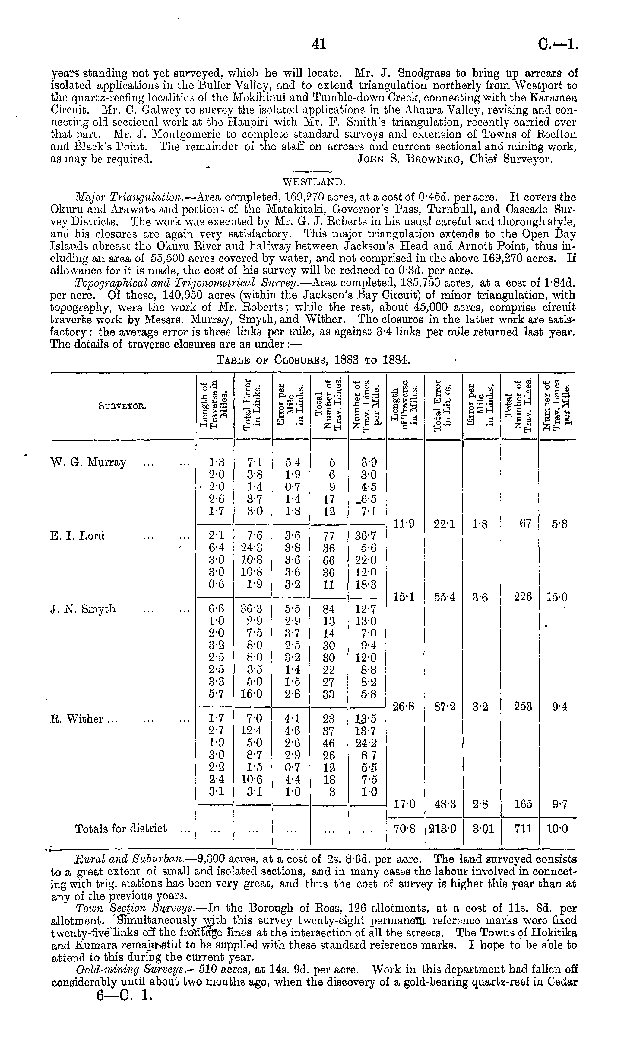 WESTLAND. Major Triangulation. —Area completed, 109,270 acres, at a cost of 0-45d. per acre. It covers the Okuru and Arawata and portions of the Matakitaki, Governor's Pass, Turnbull, and Cascade Survey Districts. The work was executed by Mr. G. J. Eoberts in his usual careful and thorough style, and his closures arc again very satisfactory. This major triangulation extends to the Open Bay Islands abreast the Okuru Eiver and halfway between Jackson's Head and Arnott Point, thus including an area of 55,500 acres covered by water, and not comprised in the above 169,270 acres. If allowance for it is made, the cost of his survey will be reduced to 0-3d. per acre. Topographical and Trigonometrical Survey. —Area completed, 185,750 acres, at a cost of l-84d. per acre. Of these, 140,950 acres (within the Jackson's Bay Circuit) of minor triangulation, with topography, were the work of Mr. Eoberts; while the rest, about 45,000 acres, comprise circuit traverse work by Messrs. Murray, Smyth, and Wither. The closures in the latter work are satisfactory : the average error is three links per mile, as against 3'4 links per mile returned last year. The details of traverse closures are as under: —