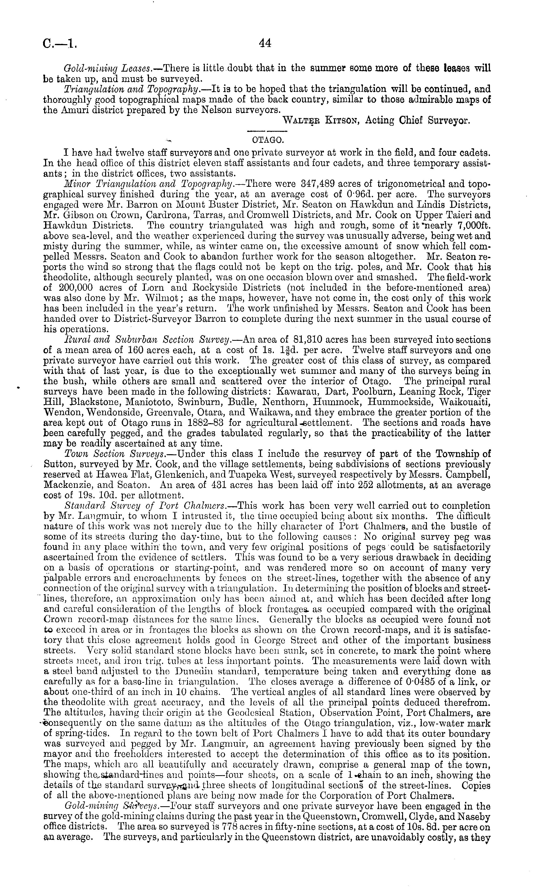 Gold-mining Leases. —There is little doubt that in tho summer some more of these leases will be taken up, and must be surveyed. Triangulation and Topography. —It is to be hoped that the triangulation will be continued, and thoroughly good topographical maps made of tho back country, similar to those admirable maps of the Amuri district prepared by tho Nelson surveyors. Walter Kitson, Acting Chiof Surveyor.