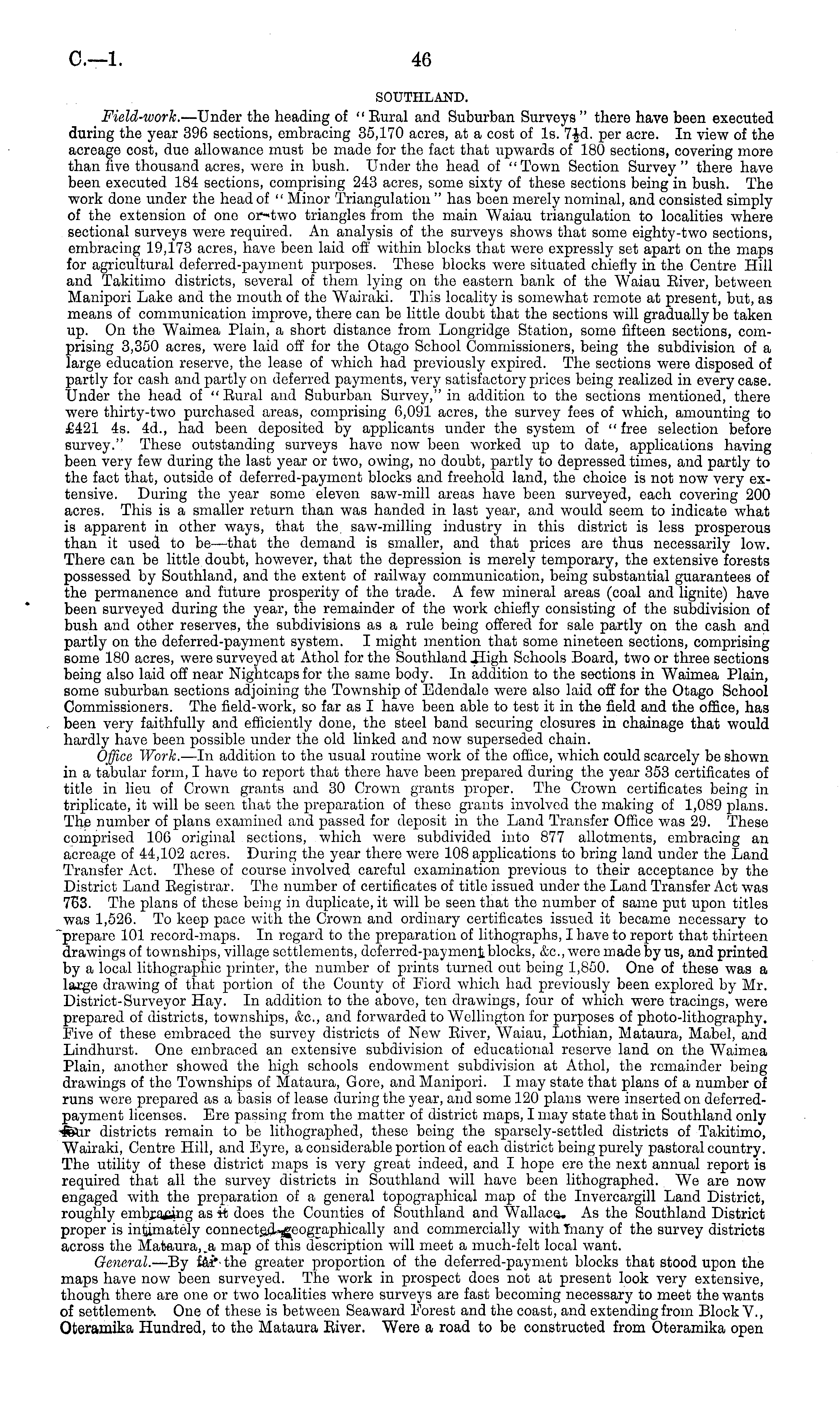 SOUTHLAND. Field-work. —Under the heading of " Eural and Suburban Surveys" there have been executed during the year 396 sections, embracing 35,170 acres, at a cost of Is. 7-Jd. per acre. In view of tho acreage cost, due allowance must be made for the fact that upwards of 180 sections, covering more than five thousand acres, were in bush. Under the head of "Town Section Survey" there have been executed 184 sections, comprising 243 acres, some sixty of these sections being in bush. The work done under the head of " Minor Triangulation " has been merely nominal, and consisted simply of tho extension of one or'two triangles from the main Waiau triangulation to localities where sectional surveys were required. An analysis of the surveys shows that some eighty-two sections, embracing 19,173 acres, have been laid off within blocks that were expressly set apart on the maps for agricultural deferred-payment purposes. These blocks were situated chiefly in the Centre Hill and Takitimo districts, several of them lying on the eastern bank of the Waiau Eiver, between Manipori Lake and the mouth of the Wairaki. This locality is somewhat remote at present, but, as means of communication improve, there can be little doubt that the sections will gradually be taken up. On tho Waimea Plain, a short distance from Longridge Station, some fifteen sections, comprising 3,350 acres, were laid off for tho Otago School Commissioners, being the subdivision of a large education reserve, the lease of which had previously expired. The sections were disposed of partly for cash and partly on deferred payments, very satisfactory prices being realized in every case. Under the head of " Eural and Suburban Survey," in addition to tho sections mentioned, there were thirty-two purchased areas, comprising 6,091 acres, the survey fees of which, amounting to £421 4s. 4d., had been deposited by applicants under the system of " free selection before survey." These outstanding surveys have now been worked up to date, applications having been very few during the last year or two, owing, no doubt, partly to depressed times, and partly to the fact that, outside of deferred-payment blocks and freehold land, the choice is not now very extensive. During the year some eleven saw-mill areas have been surveyed, each covering 200 acres. This is a smaller return than was handed in last year, and would seem to indicate what is apparent in other ways, that the saw-milling industry in this district is less prosperous than it used to bo—that the demand is smaller, and that prices are thus necessarily low. There can be little doubt, however, that the depression is merely temporary, the extensive forests possessed by Southland, and the extent of railway communication, being substantial guarantees of the permanence and future prosperity of the trade. A few mineral areas (coal and lignite) have been surveyed during the year, the remainder of the work chiefly consisting of the subdivision of bush and other reserves, the subdivisions as a rule being offered for sale partly on the cash and partly on the deferred-payment system. I might mention that some nineteen sections, comprising some 180 acres, were surveyed at Athol for the Southland High Schools Board, two or three sections being also laid off near Nightcaps for the same body. In addition to the sections in Waimea Plain, some suburban sections adjoining the Township of Edendale were also laid off for tho Otago School Commissioners. The field-work, so far as I have been able to test it in the field and the office, has been very faithfully and efficiently done, the steel band securing closures in chainage that would hardly have been possible under the old linked and now superseded chain. Office Work. —ln addition to the usual routine work of the office, which could scarcely be shown in a tabular form, I have to report that there have been prepared during the year 353 certificates of title in lieu of Crown grants and 30 Crown grants proper. Tho Crown certificates being in triplicate, it will be seen that the preparation of these grants involved the making of 1,089 plans. The number of plans examined and passed for deposit in the Land Transfer Office was 29. These comprised 106 original sections, which were subdivided into 877 allotments, embracing an acreage of 44,102 acres. During the year there were 108 applications to bring land under the Land Transfer Act. These of course involved careful examination previous to their acceptance by the District Land Registrar. The number of certificates of title issued under the Land Transfer Act was 763. The plans of these being in duplicate, it will be seen that the number of same put upon titles was 1,526. To keep pace with the Crown and ordinary certificates issued it became necessary to prepare 101 record-maps. In regard to the preparation of lithograph's, I have to report that thirteen drawings of townships, village settlements, deferred-payment blocks, &c, were made by us, and printed by a local lithographic printer, the number of prints turned out being 1,850. One of these was a large drawing of that portion of tho County of Fiord which had previously been explored by Mr. District-Surveyor Hay. In addition to the above, ten drawings, four of which were tracings, were prepared of districts, townships, &c, and forwarded to Wellington for purposes of photo-lithography. Five of these embraced the survey districts of New Eiver, Waiau, Lothian, Mataura, Mabel, and Lindhurst. One embraced an extensive subdivision of educational reserve land on the Waimea Plain, another showed the high schools endowment subdivision at Athol, the remainder being drawings of tho Townships of Mataura, Gore, and Manipori. I may state that plans of a number of runs were prepared as a basis of lease during the year, and some 120 plans were inserted on deferredpayment licenses. Ere passing from the matter of district maps, I may state that in Southland only •feur districts remai