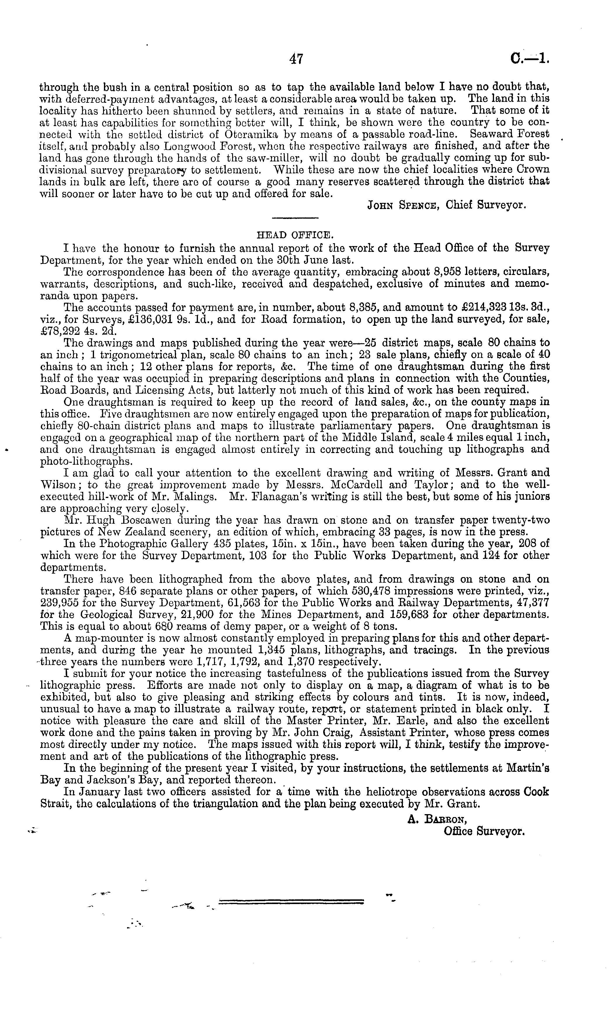 HEAD OFFICE. I have the honour to furnish the annual report of the work of the Head Office of the Survey Department, for the year which ended on the 30th June last. The correspondence has been of the average quantity, embracing about 8,958 letters, circulars, warrants, descriptions, and such-liko, received and despatched, exclusive of minutes and memoranda upon papers. The accounts passed for payment are, in number, about 8,385, and amount to £214,323 13s. 3d., viz., for Surveys, £136,031 9s. Id., and for Eoad formation, to open up the land surveyed, for sale, £78,292 4s. 2d. The drawings and maps published during the year were—2s district maps, scale 80 chains to an inch ; 1 trigonometrical plan, scale 80 chains to an inch; 23 sale plans, chiefly on a scale of 40 chains to an inch; 12 other plans for reports, &c. The time of one draughtsman during the first half of the year was occupied in preparing descriptions and plans in connection with the Counties, Eoad Boards, and Licensing Acts, but latterly not much of this kind of work has been required. One draughtsman is required to keep up the record of land sales, &c, on the county maps in this office. Five draughtsmen are now entirely engaged upon the preparation of maps for publication, chiefly 80-chain district plans and maps to illustrate parliamentary papers. One draughtsman is engaged on a geographical map of the northern part of the Middle Island, scale 4 miles equal 1 inch, and one draughtsman is engaged almost entirely in correcting and touching up lithographs and photo-lithographs. I am glad to call your attention to the excellent drawing and writing of Messrs. Grant and Wilson; to the great improvement made by Messrs. McCardell and Taylor; and to the wellexecuted hill-work of Mr. Malings. Mr. Flanagan's writing is still the best, but some of his juniors are approaching very closely. Mr. Hugh Boscawen during the year has drawn on stone and on transfer paper twenty-two pictures of New Zealand scenery, an edition of which, embracing 33 pages, is now in the press. In the Photographic Gallery 435 plates, 15in. x 15in., have been taken during the year, 208 of which were for the Survey Department, 103 for the Public Works Department, and 124 for other departments. There have been lithographed from the above plates, and from drawings on stone and on transfer paper, 846 separate plans or other papers, of which 530,478 impressions were printed, viz., 239,955 for the Survey Department, 61,563 for the Public Works and Eailway Departments, 47,377 for the Geological Survey, 21,900 for the Mines Department, and 159,683 for other departments. This is equal to about 680 reams of demy paper, or a weight of 8 tons. A map-mounter is now almost constantly employed in preparing plans for this and other departments, and during the year he mounted 1,345 plans, lithographs, and tracings. In the previous three years the numbers were 1,717, 1,792, and 1,370 respectively. I submit for your notice the increasing tastcfulness of the publications issued from the Survey lithographic press. Efforts are made not only to display on a map, a diagram of what is to be exhibited, but also to give pleasing and striking effects by colours and tints. It is now, indeed, unusual to have a map to illustrate a railway route, report, or statement printed in black only. I notice with pleasure the care and skill of the Master Printer, Mr. Earle, and also the excellent work done and the pains taken in proving by Mr. John Craig, Assistant Printer, whose press comes most directly under my notice. The maps issued with this report will, I think, testify the improvement and art of the publications of the lithographic press. In the beginning of the present year I visited, by your instructions, the settlements at Martin's Bay and Jackson's Bay, and reported thereon. In January last two officers assisted for a time with the heliotrope observations across Cook Strait, the calculations of the triangulation and the plan being executed by Mr. Grant. A. Babeon, Office Surveyor.