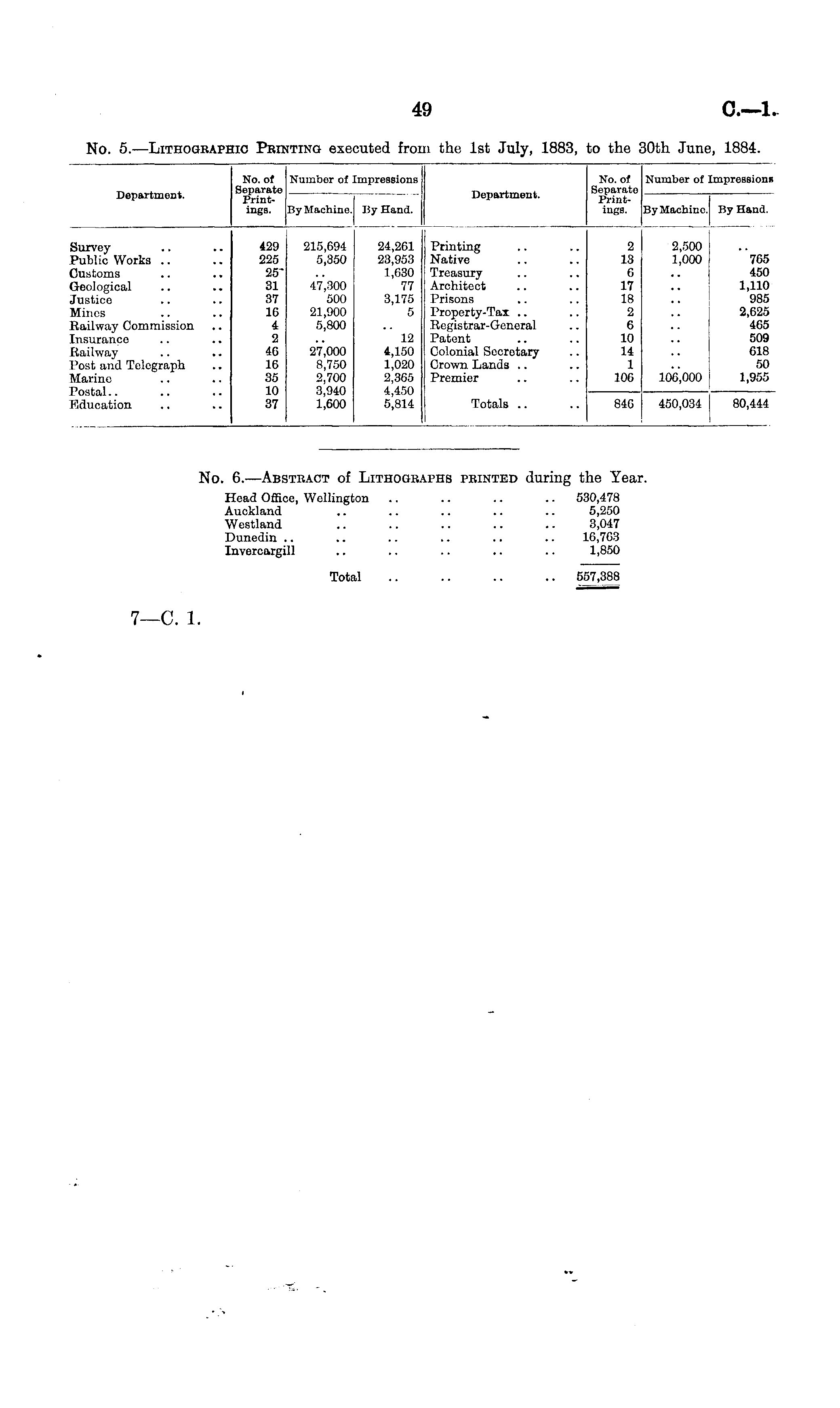 No. 6.—Abstract of Lithographs printed during the Year. Head Office, Wellington .. .. .. .. 530,478 Auckland .. .. .. .. .. 5,250 Wcstland .. .. .. .. .. 3,047 Dunedin .. .. .. .. .. .. 16,703 Invorcargill .. .. .. .. .. 1,850 Total .. .. .. .. 557,388 7—C. 1.