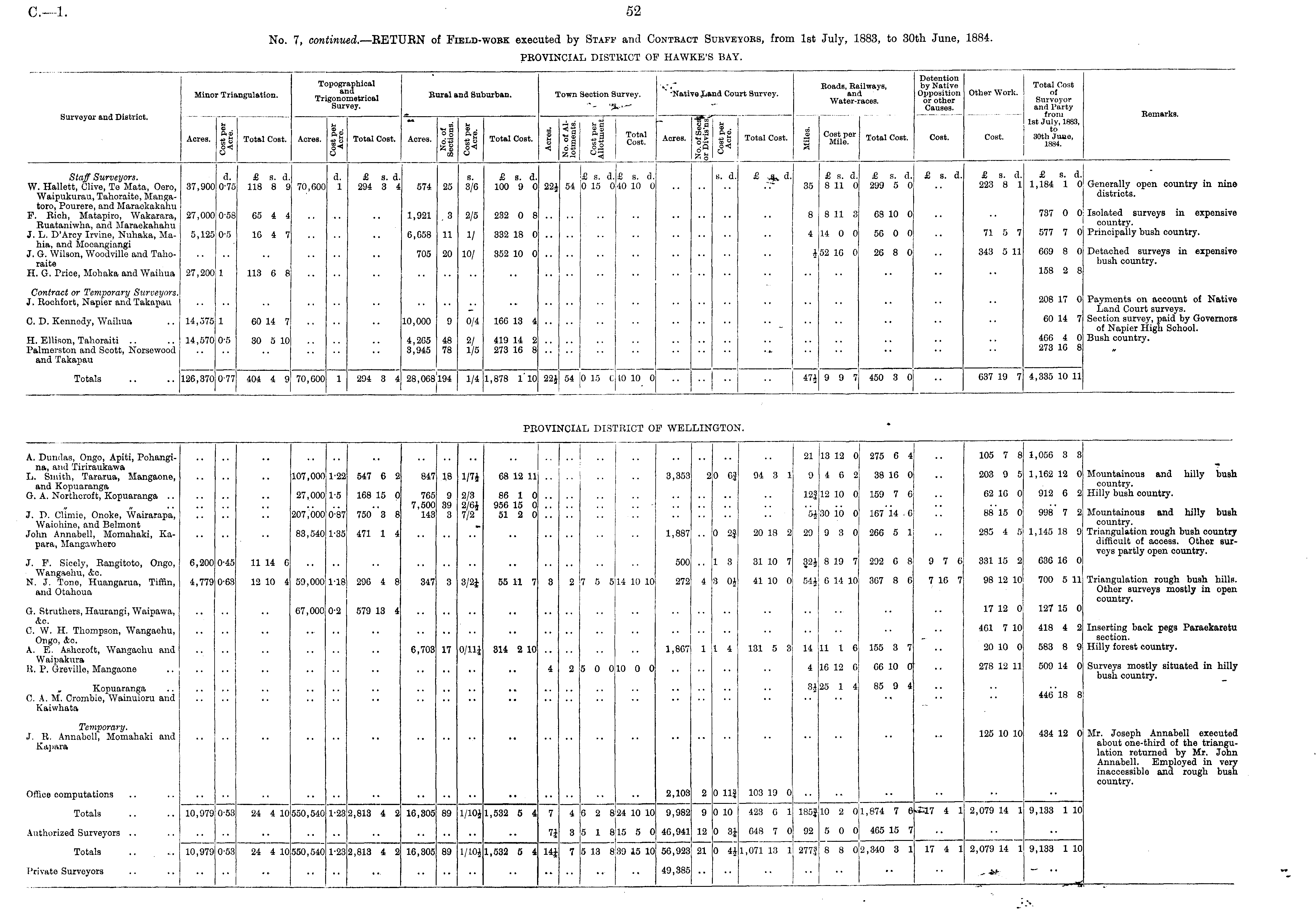 No. 7. continued. —RETURN of Field-work executed by Staff and Contract Surveyors, from 1st July, 1883, to 30th June, 1884. PROVINCIAL DISTRICT OF HAWKE'S BAY.