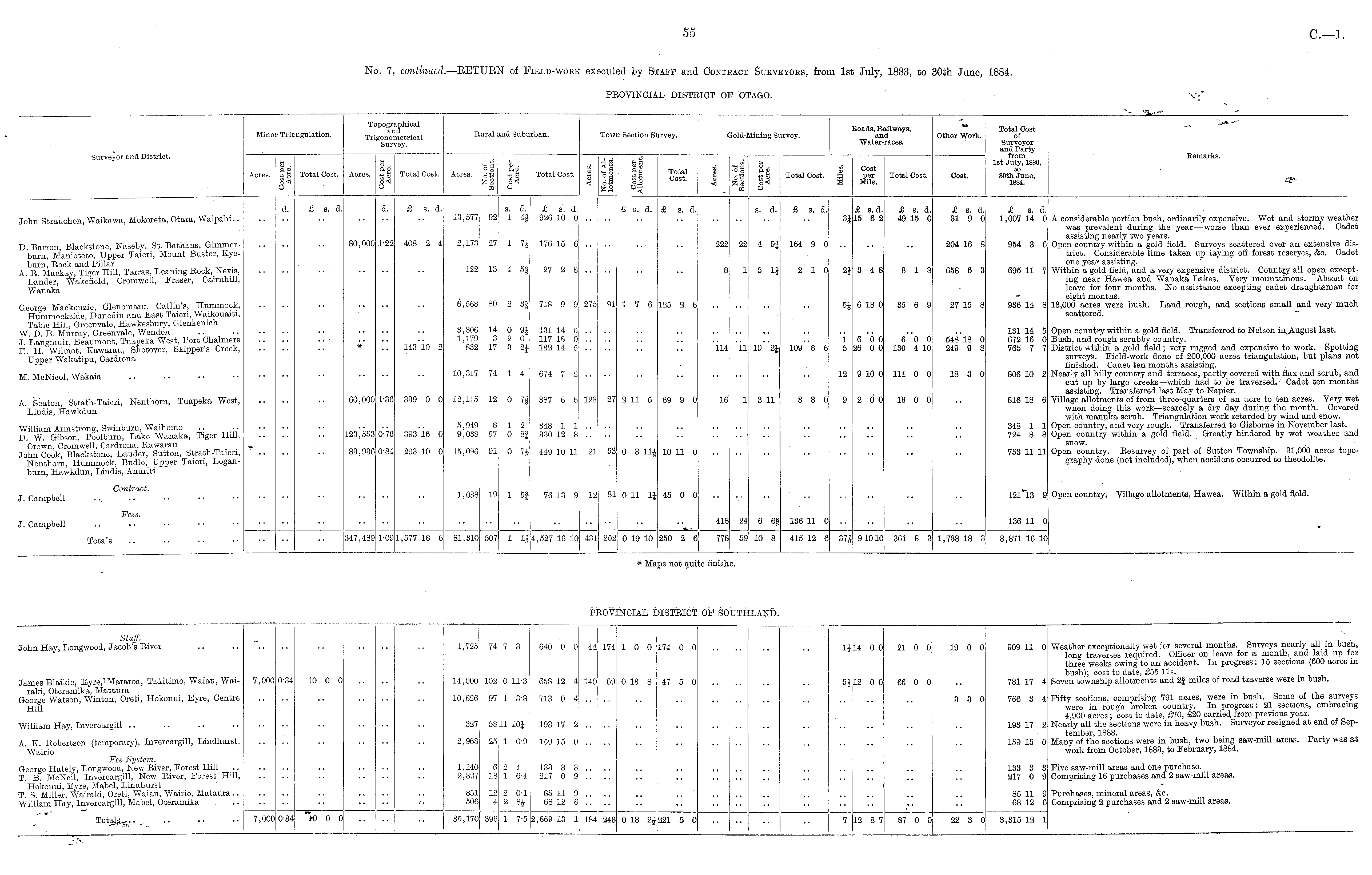No. 7, continued. —RETURN of Field-work executed by Staff and Contract Surveyors, from 1st July, 1883, to 30th June, 1884. PROVINCIAL DISTRICT OF OTAGO.