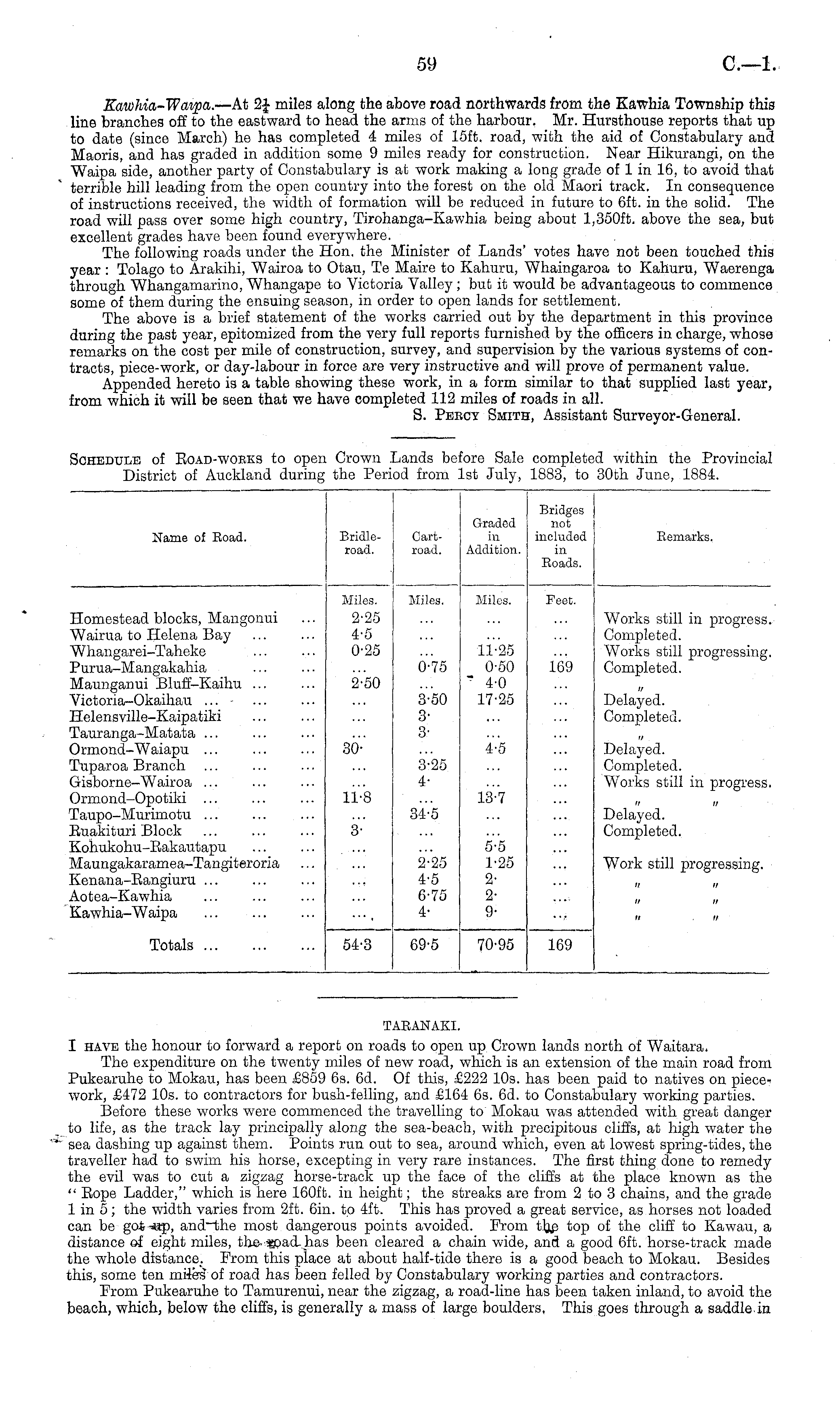 Schedule of Road-works to open Crown Lands before Sale completed within the Provincial District of Auckland during the Period from 1st July, 1883, to 30th June, 1884.